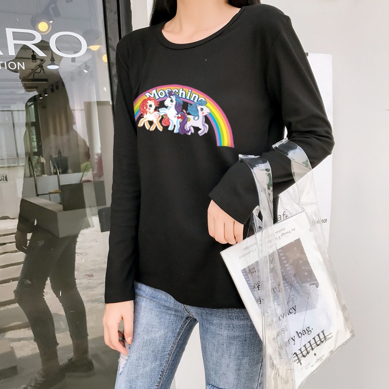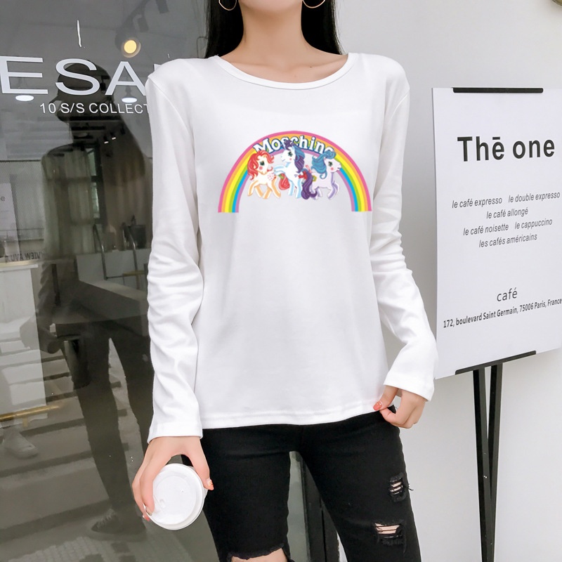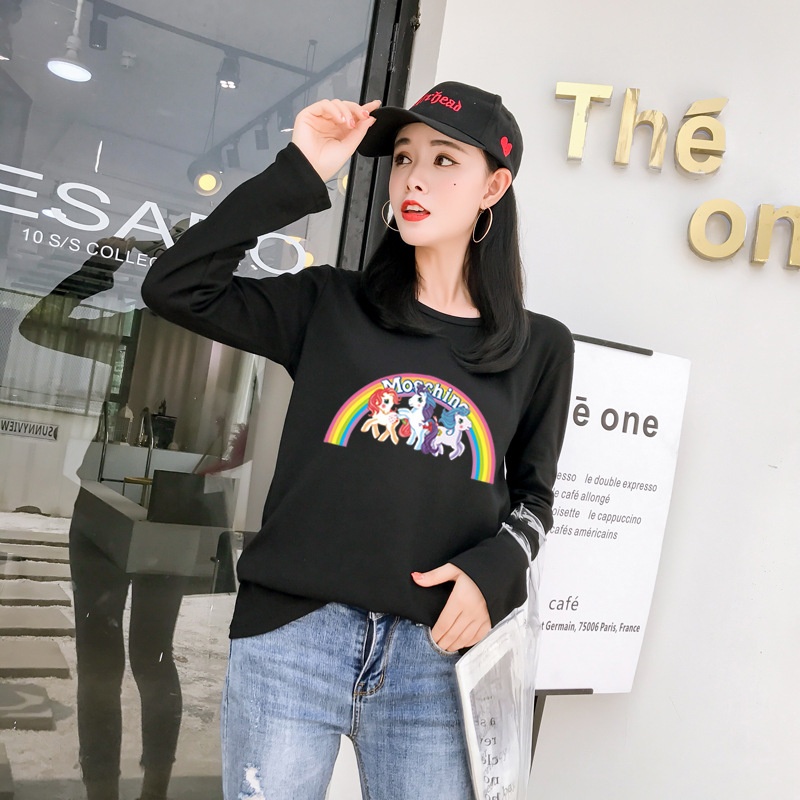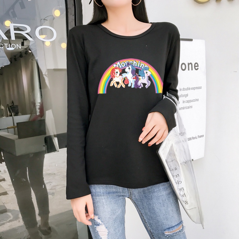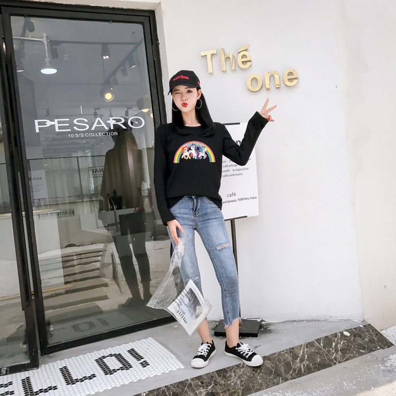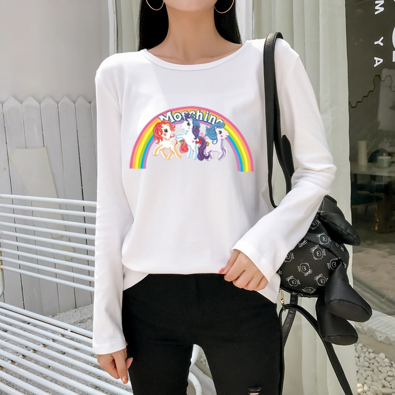 批发女装2025秋装新款韩版宽松彩虹独角兽印花长袖t恤女学生上衣