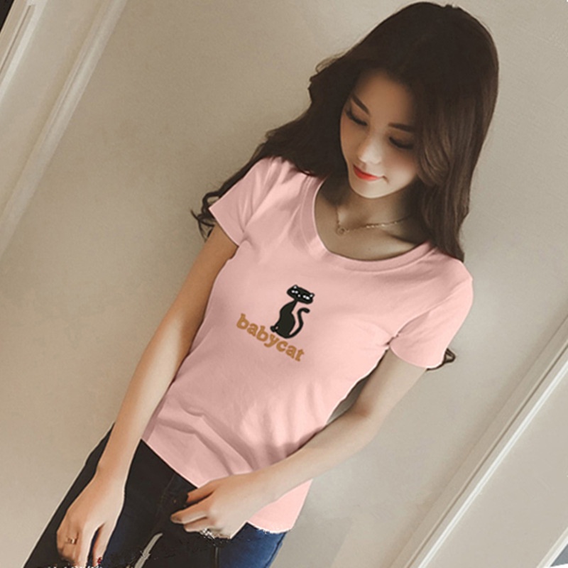 2025夏季T恤女短袖韩范百搭宽松大码简约上衣韩国金色字母猫女