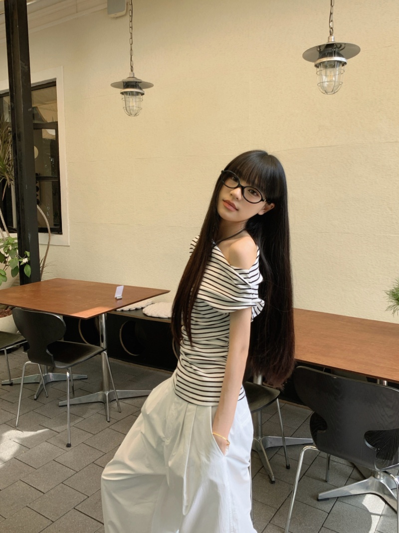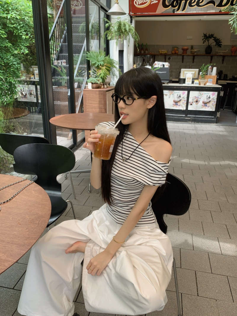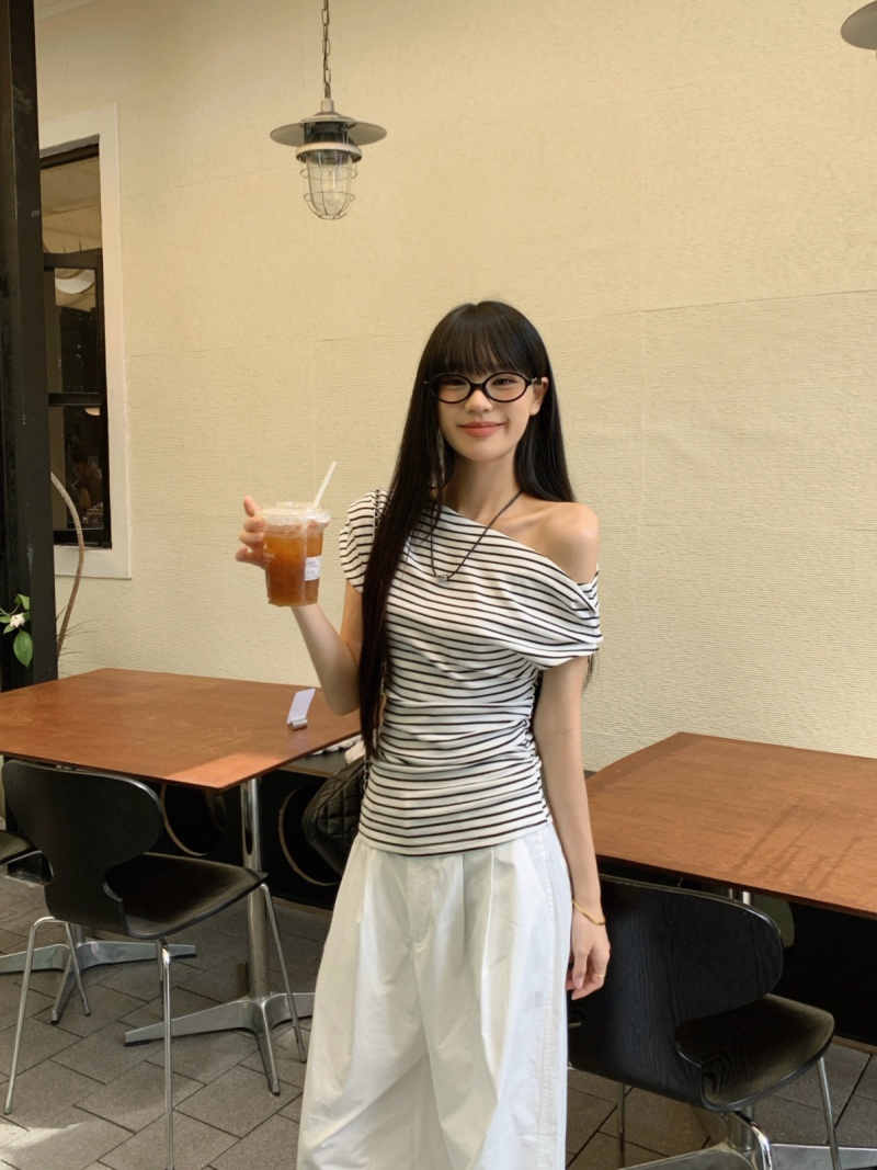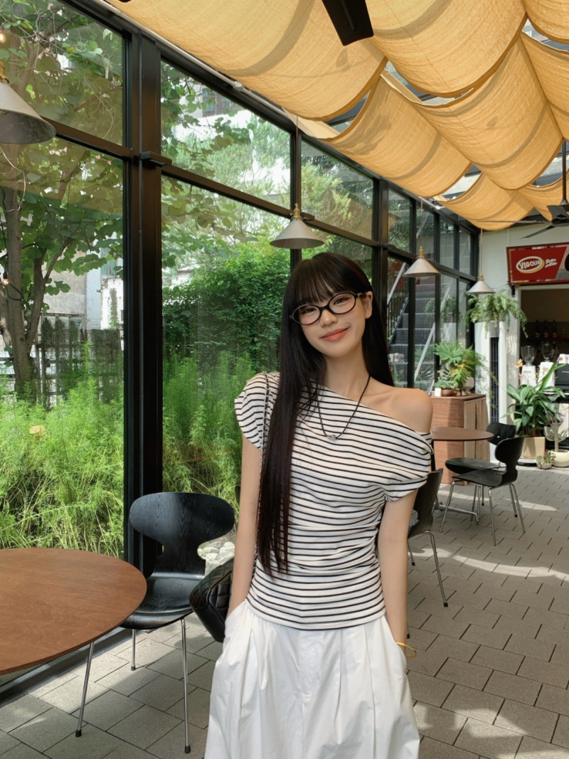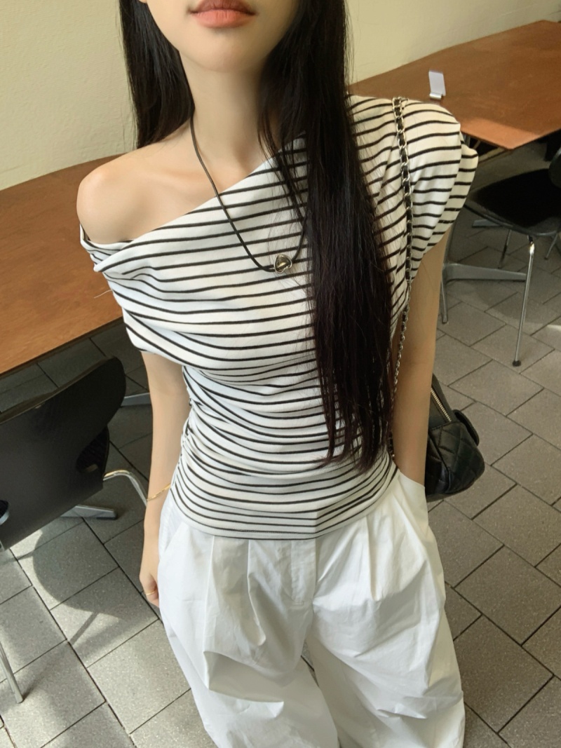 设计感斜肩短袖T恤女2025夏季新款辣妹修身显瘦露肩条纹学生上衣