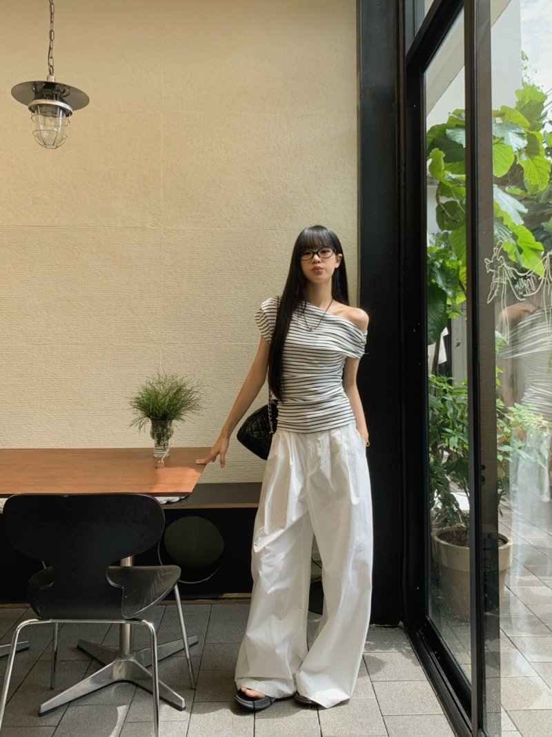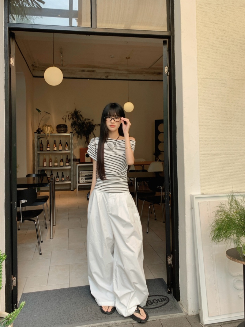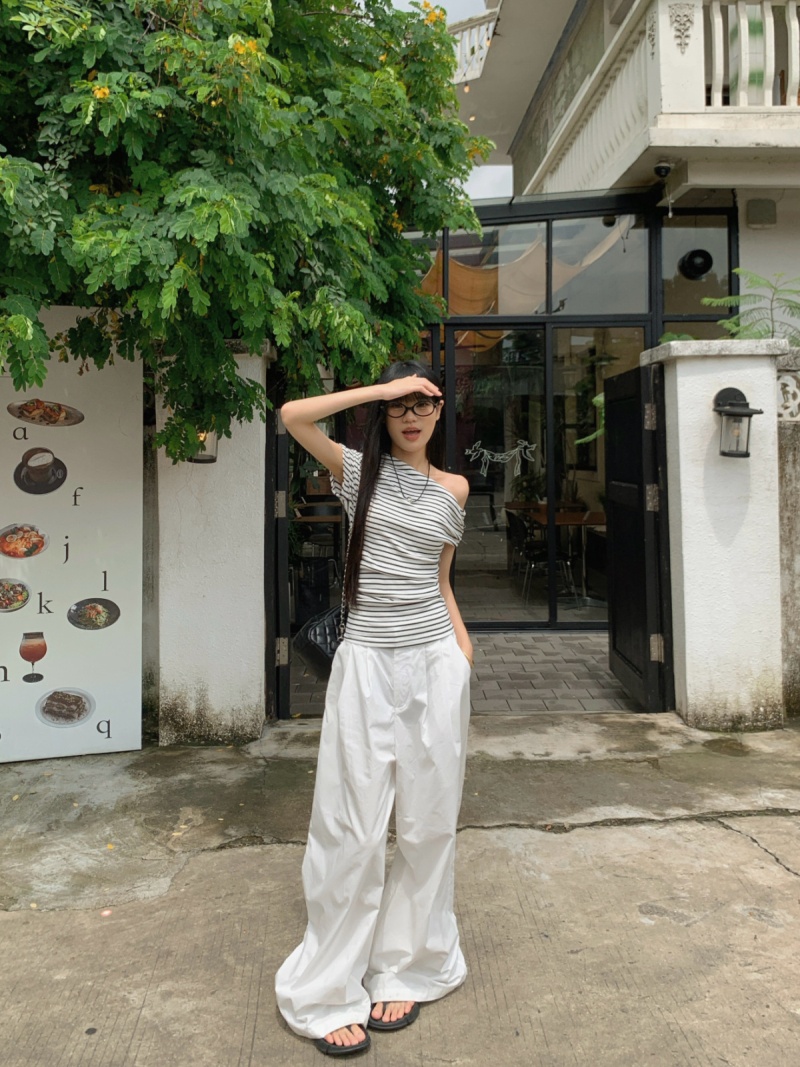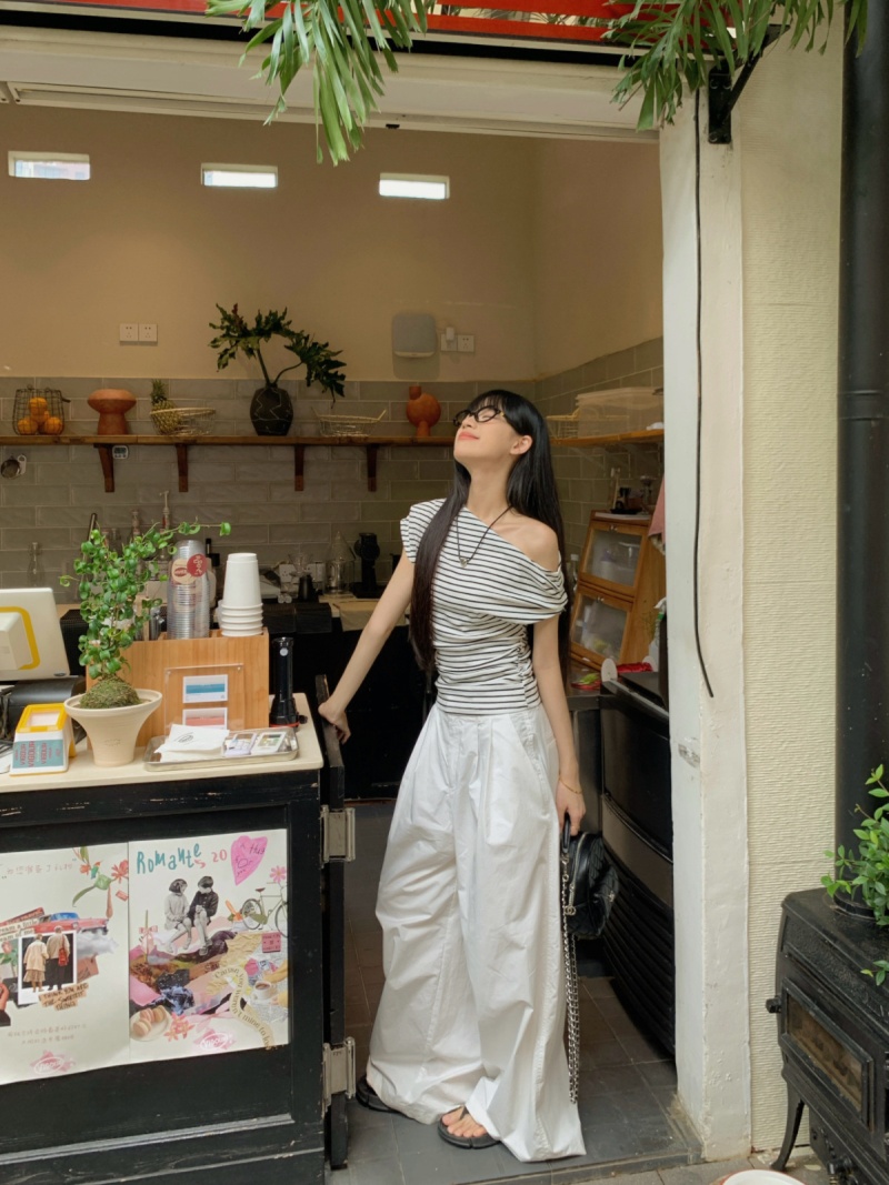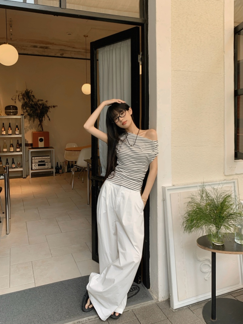 设计感斜肩短袖T恤女2025夏季新款辣妹修身显瘦露肩条纹学生上衣