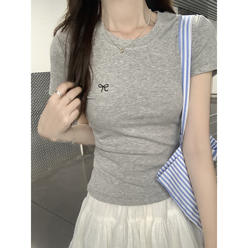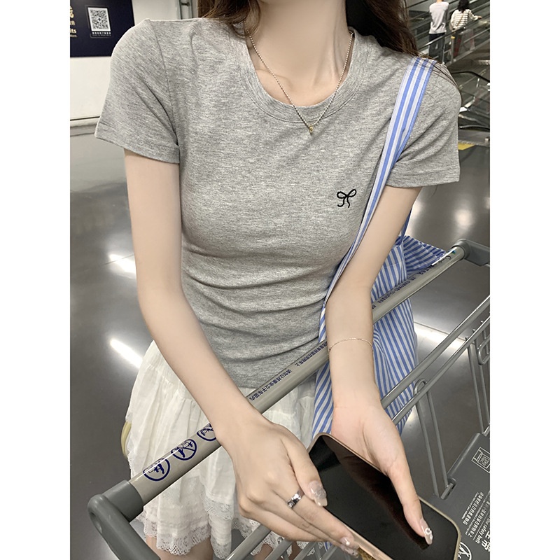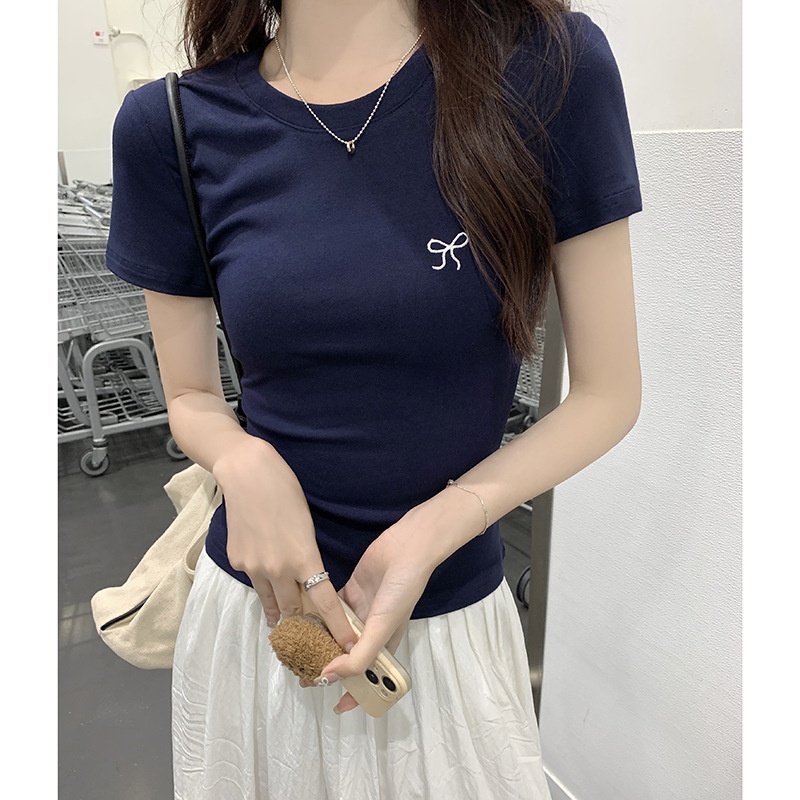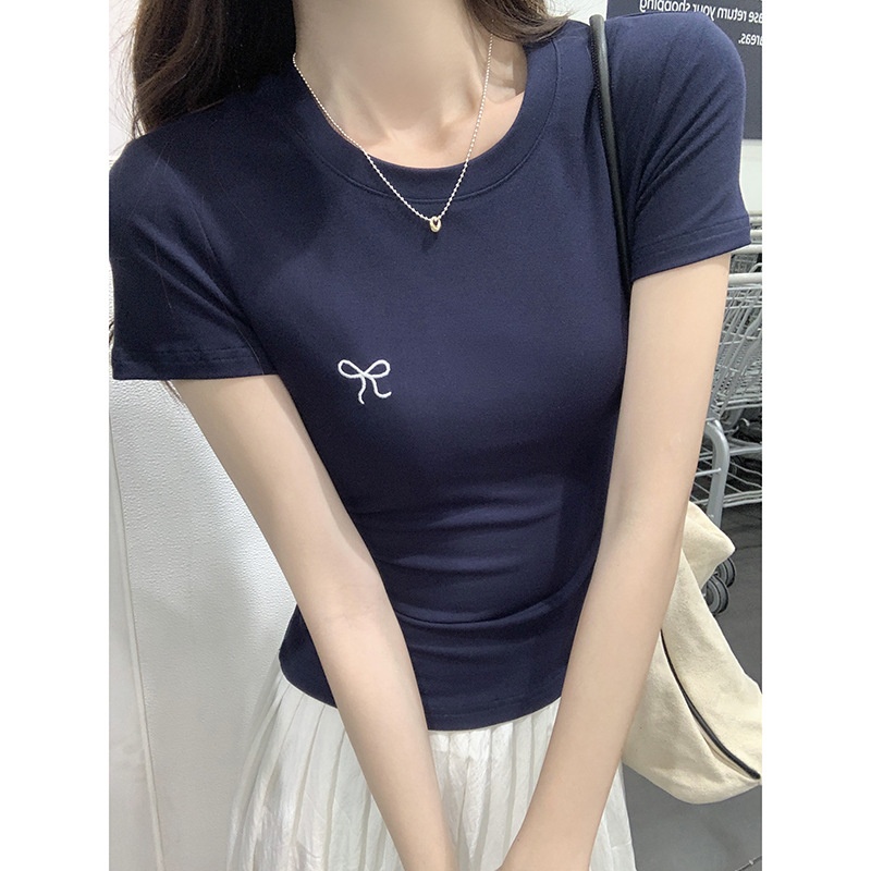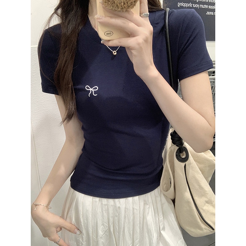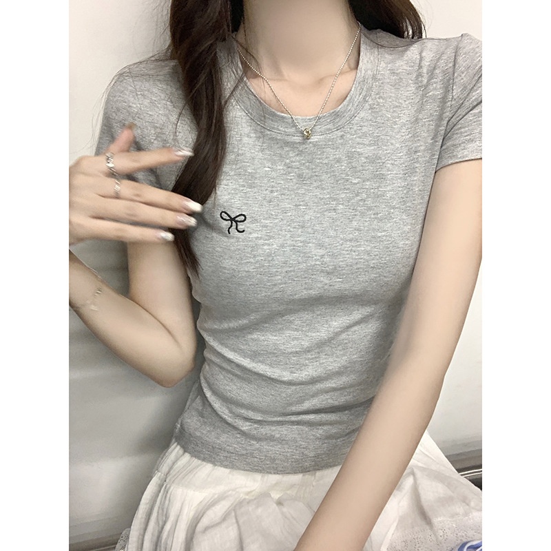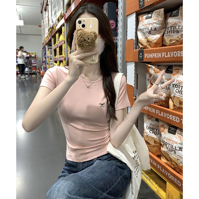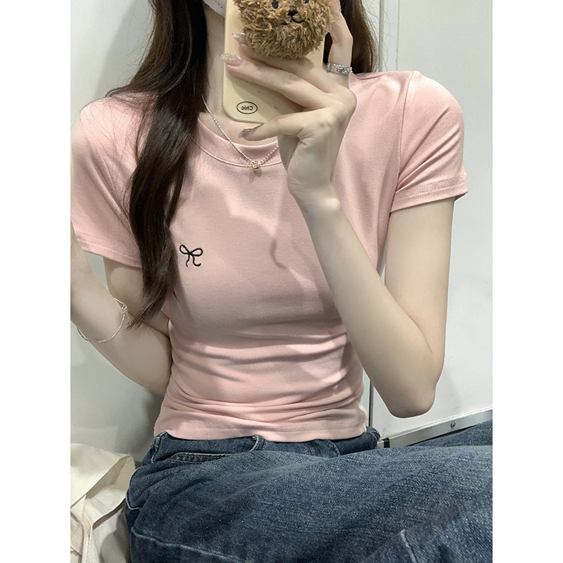 蝴蝶结刺绣短袖T恤女2025夏季新款修身正肩甜辣学生圆领打底上衣