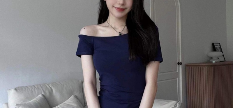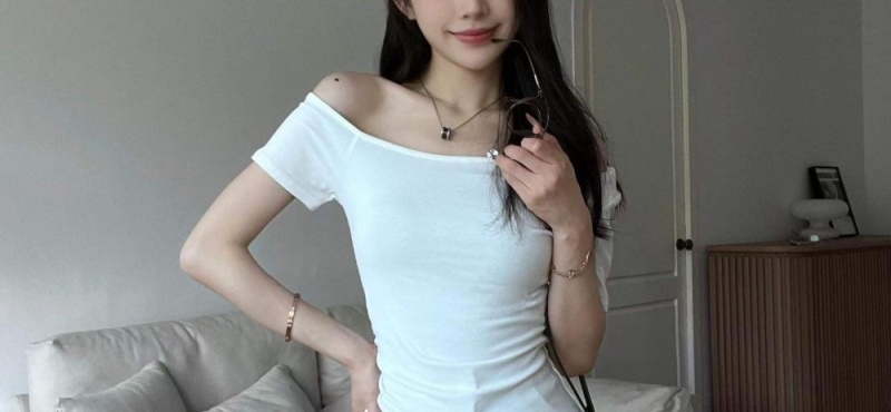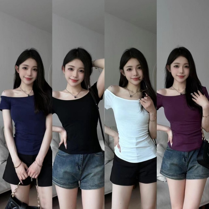 人棉 设计感露肩上衣T恤小心机一字肩不对称修身显瘦短袖打底衫