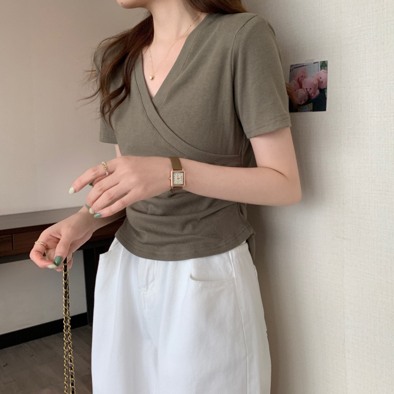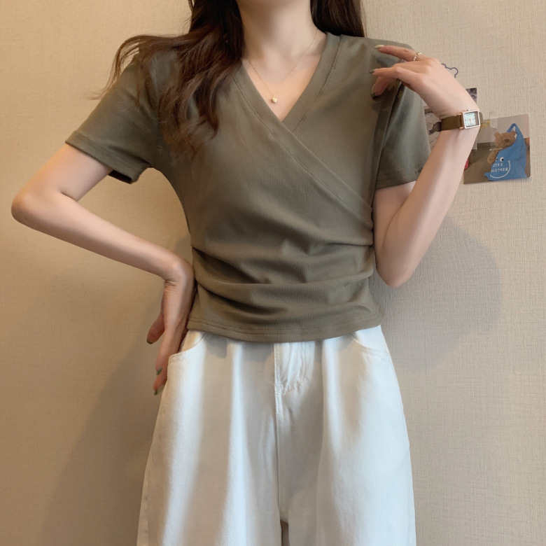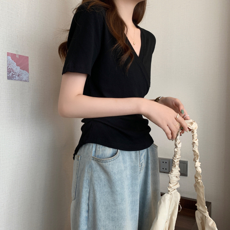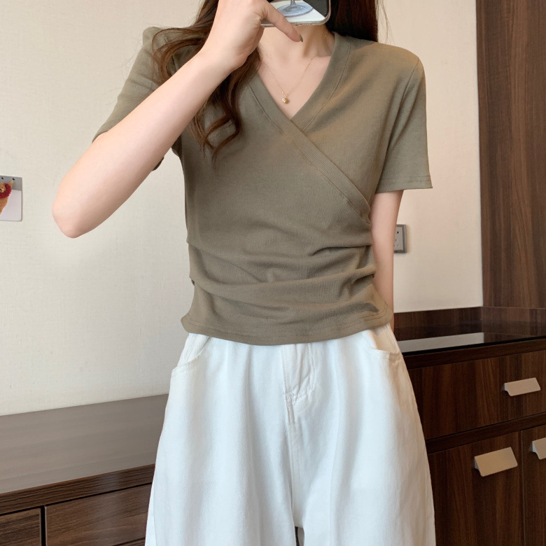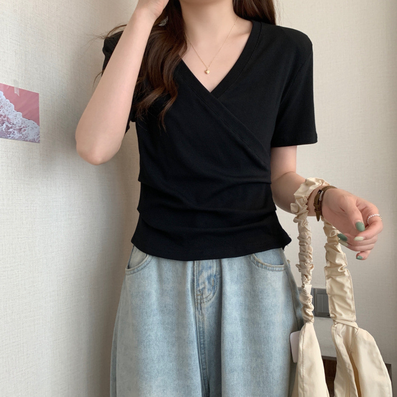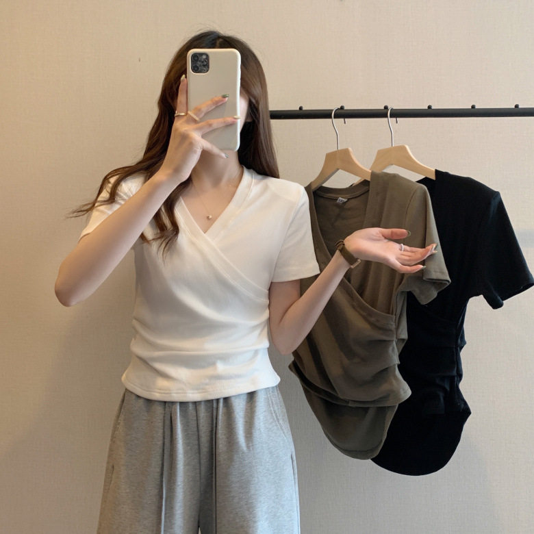 交叉v领短袖t恤女2025夏季新款设计感修身显瘦短款学生修身上衣潮