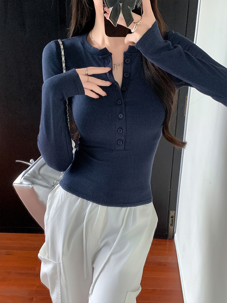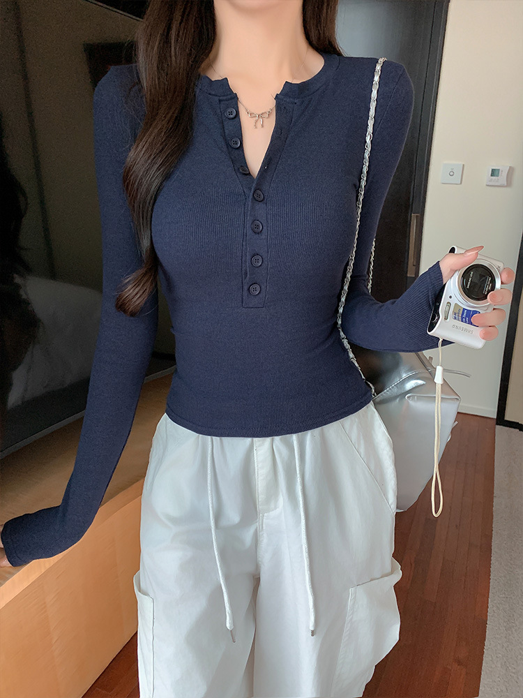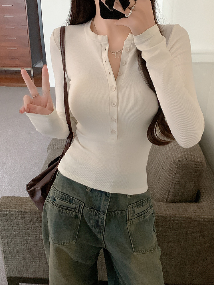 辣妹紧身正肩长袖T恤女2025新款春秋打底衫显瘦内搭纽扣学生上衣
