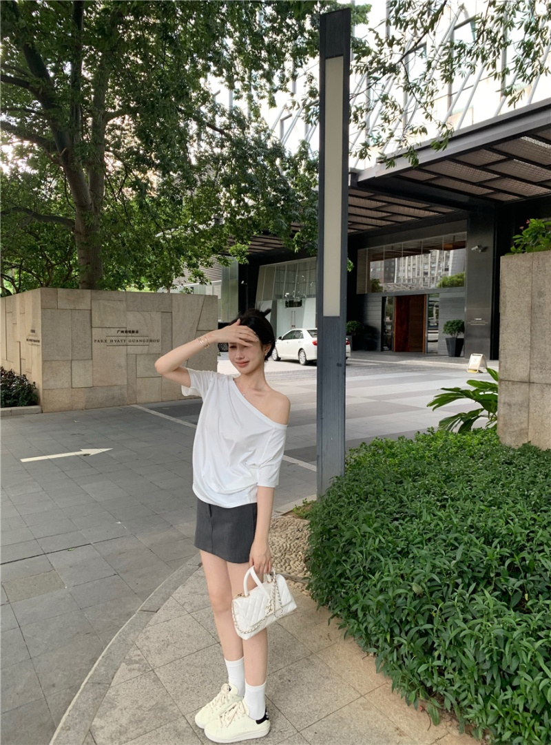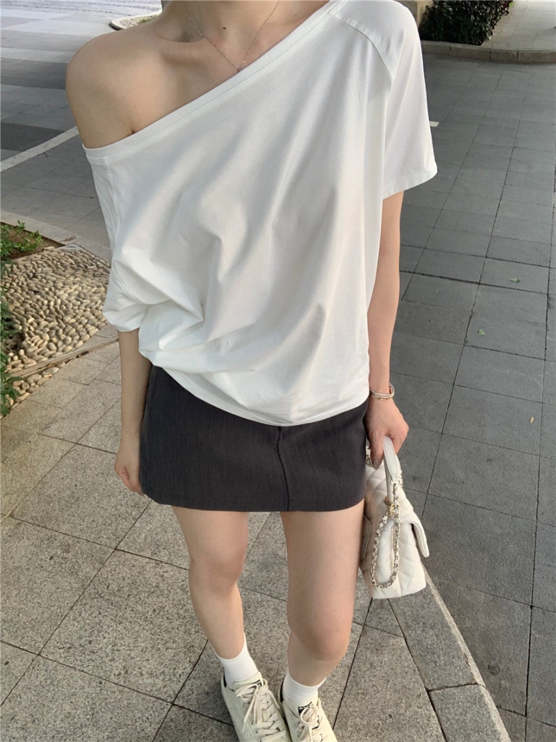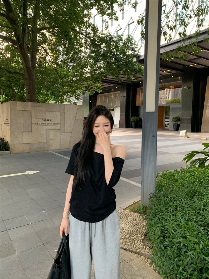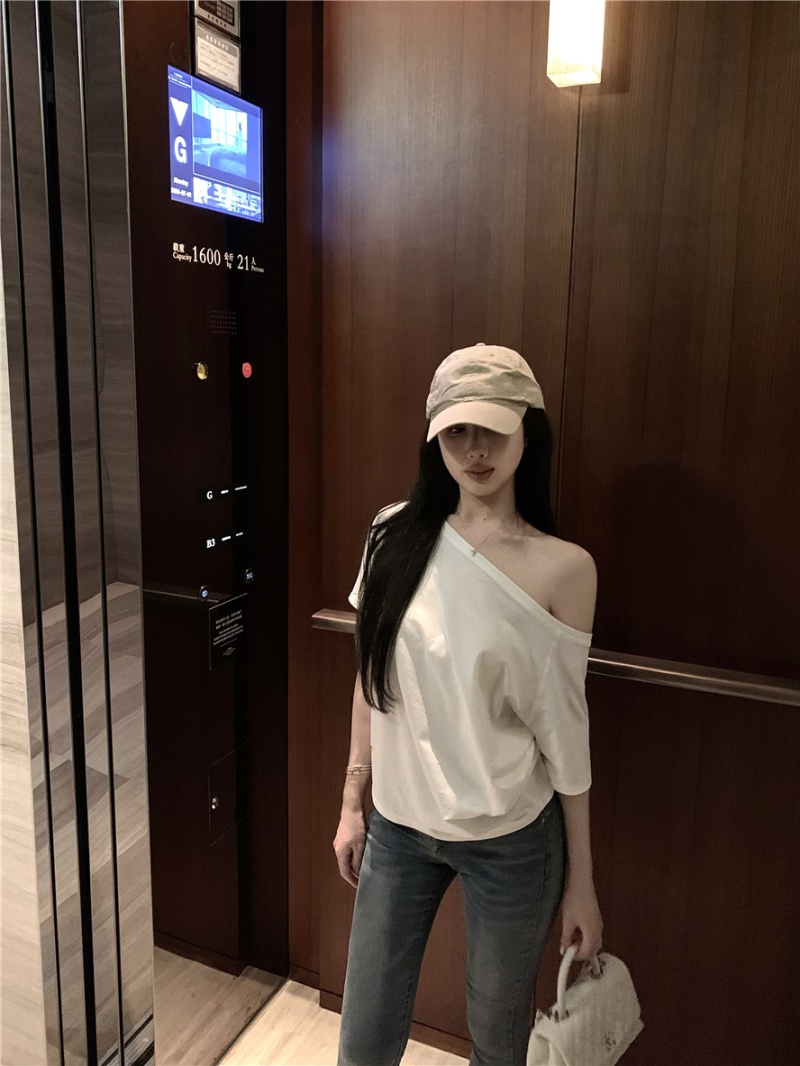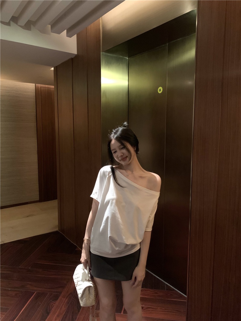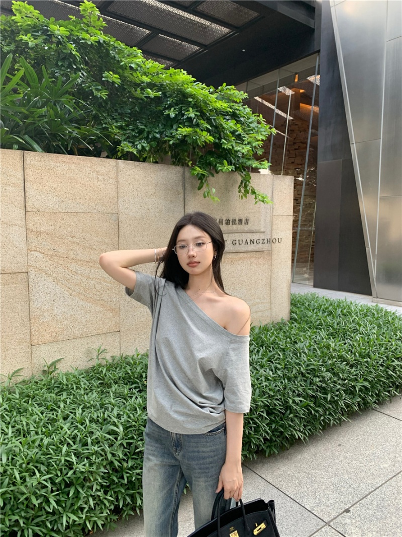 辣妹斜肩短袖宽松T恤女2025夏季新款休闲不规则纯色百搭学生上衣