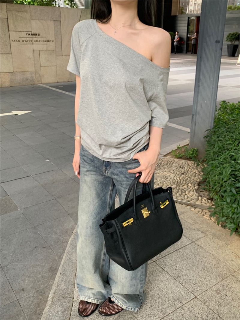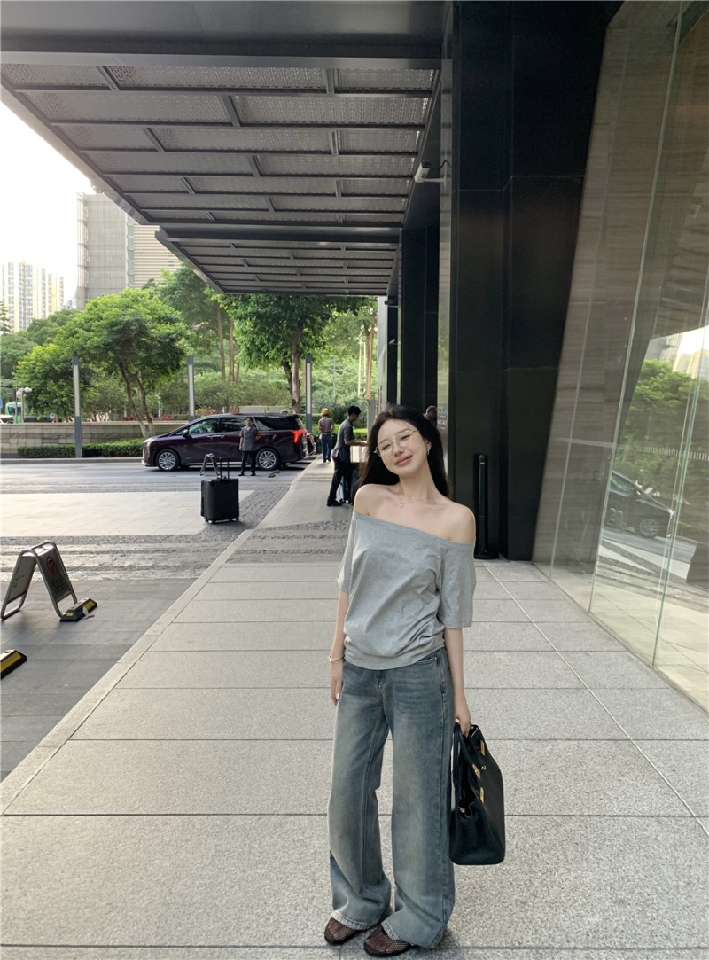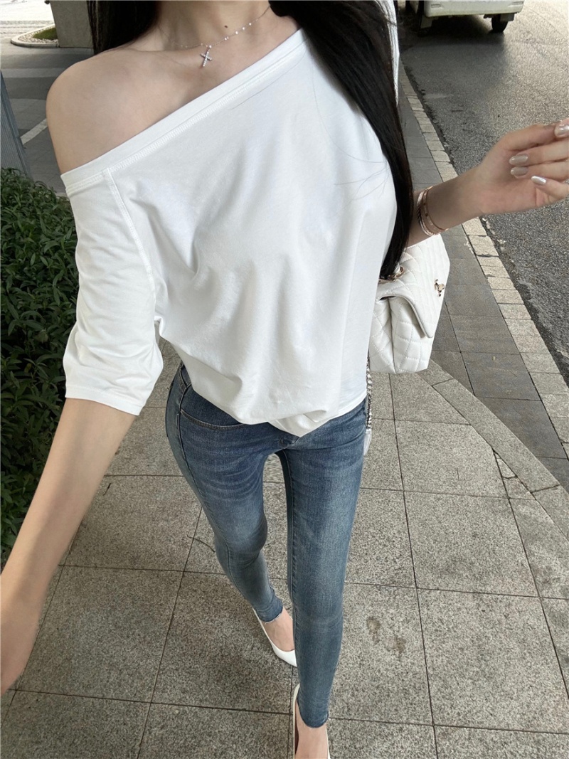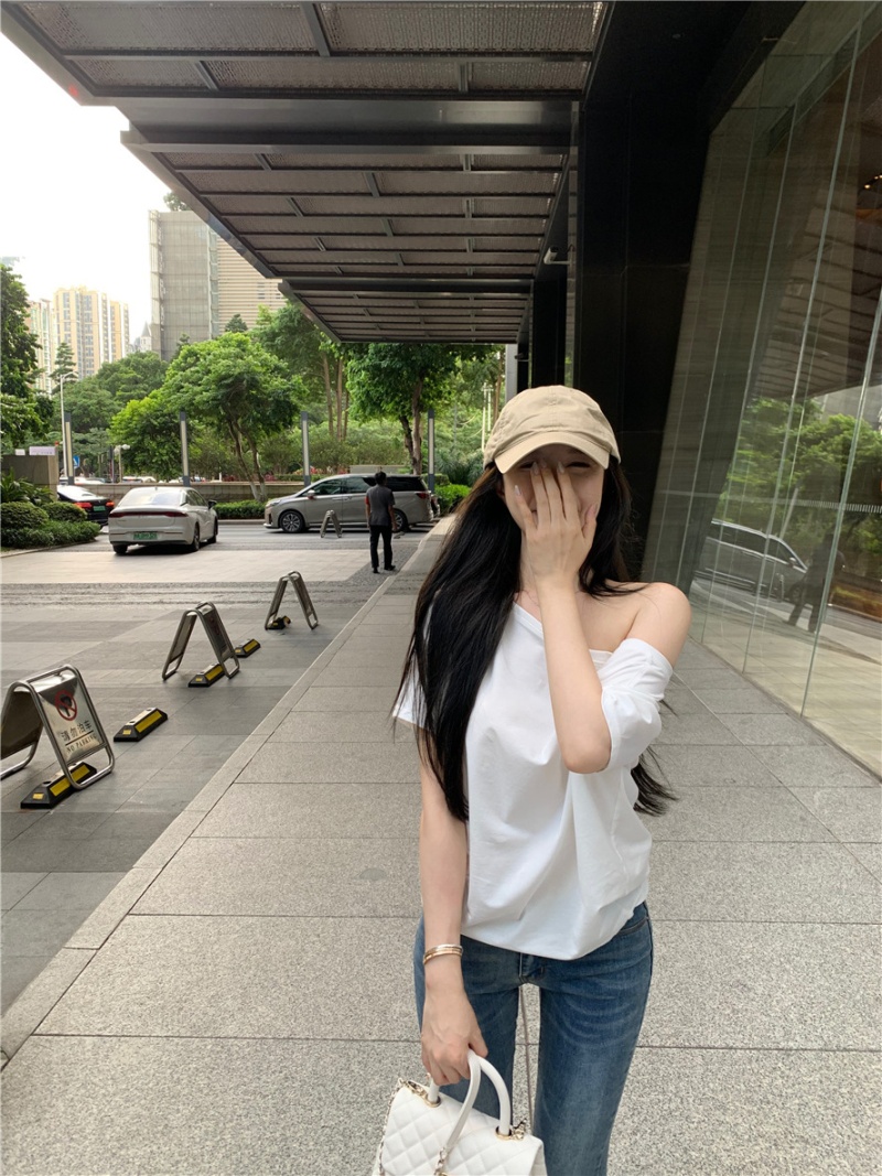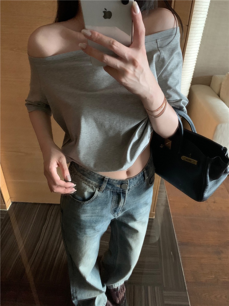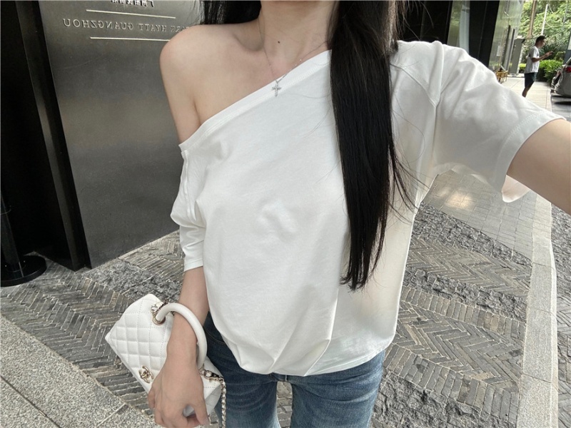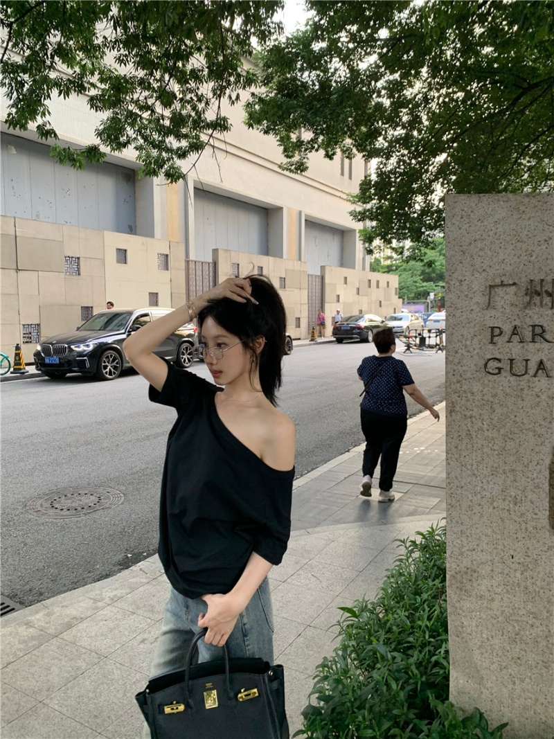 辣妹斜肩短袖宽松T恤女2025夏季新款休闲不规则纯色百搭学生上衣