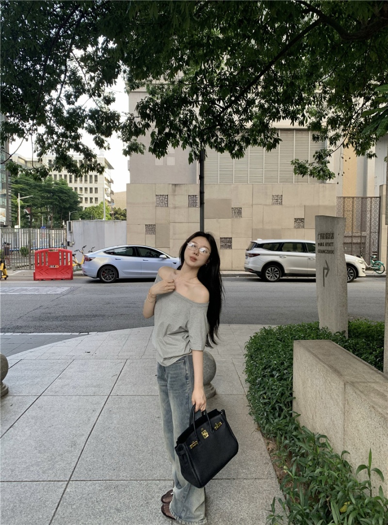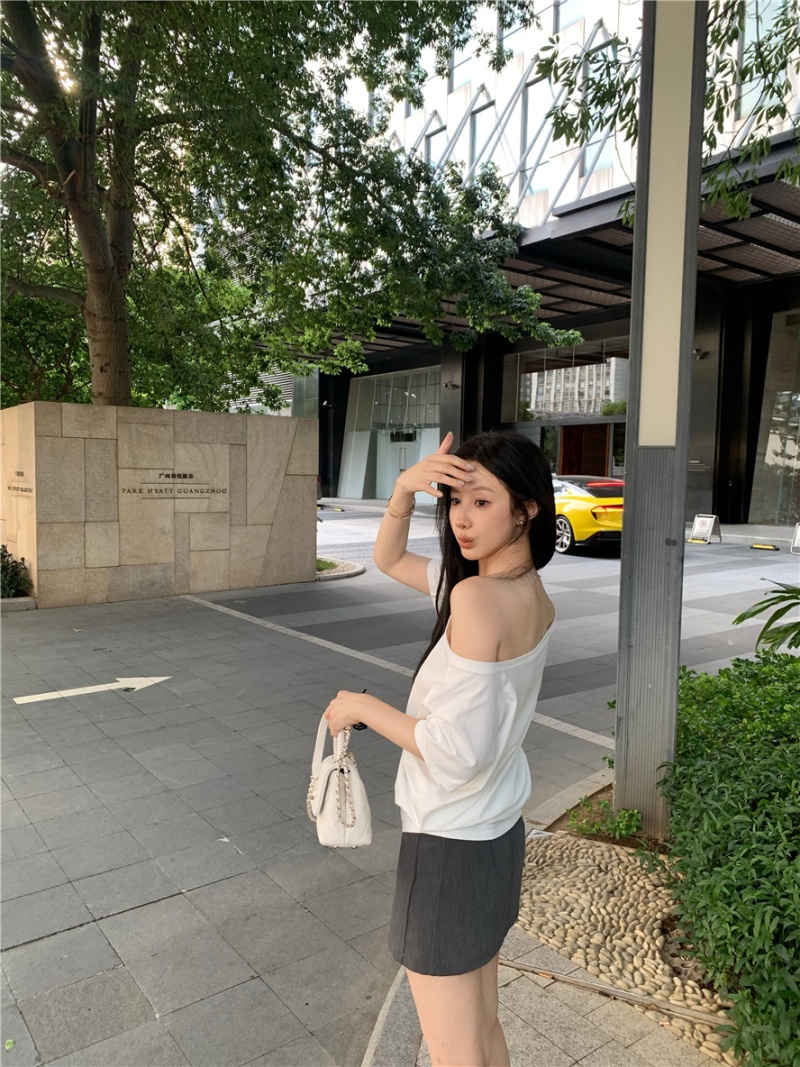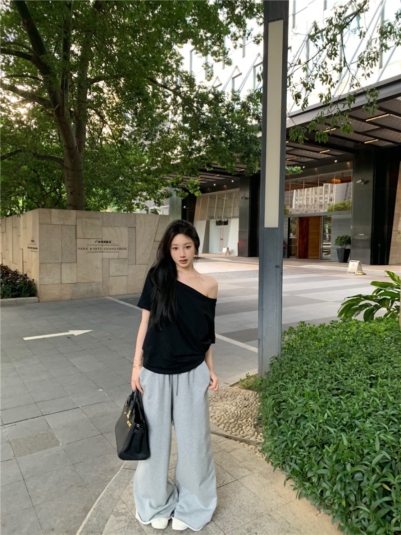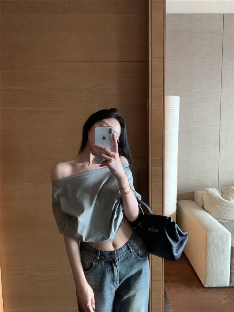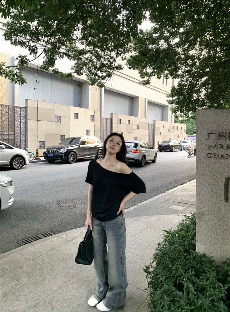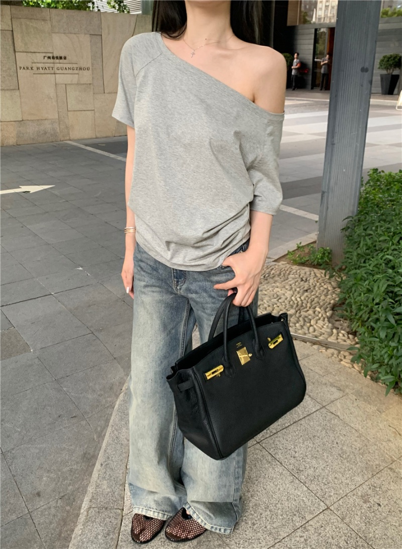 辣妹斜肩短袖宽松T恤女2025夏季新款休闲不规则纯色百搭学生上衣
