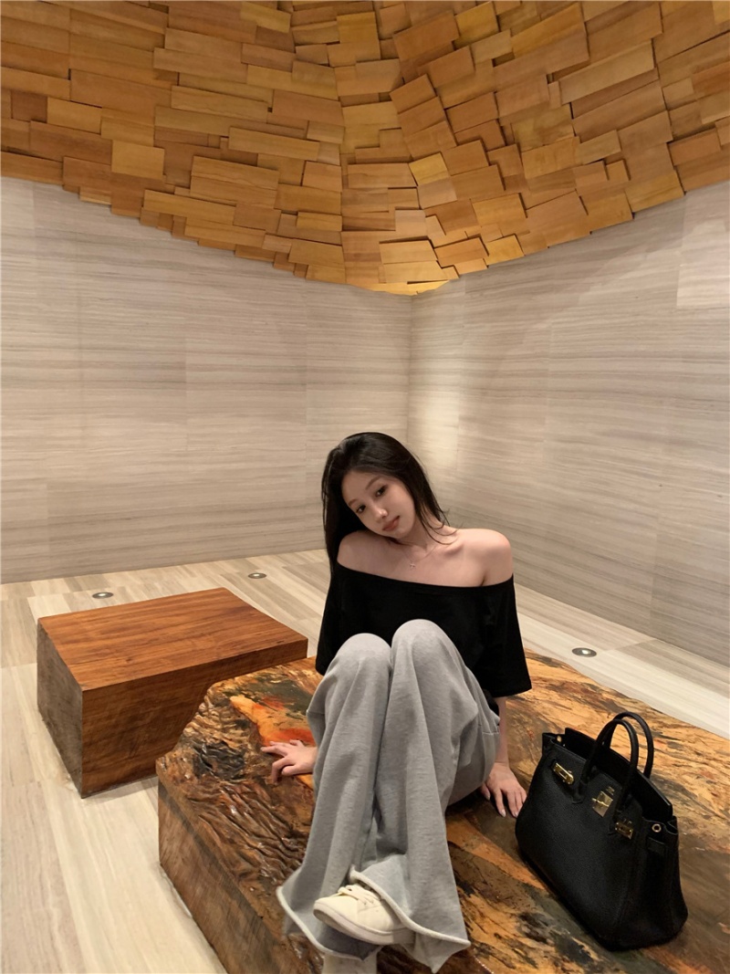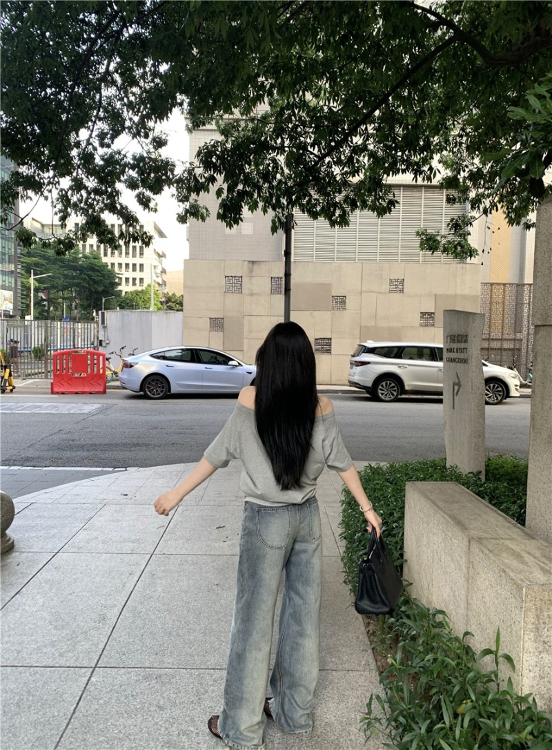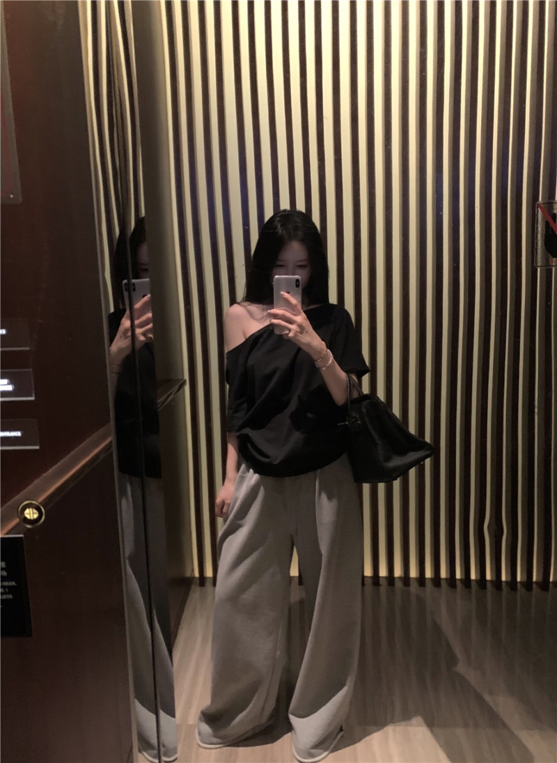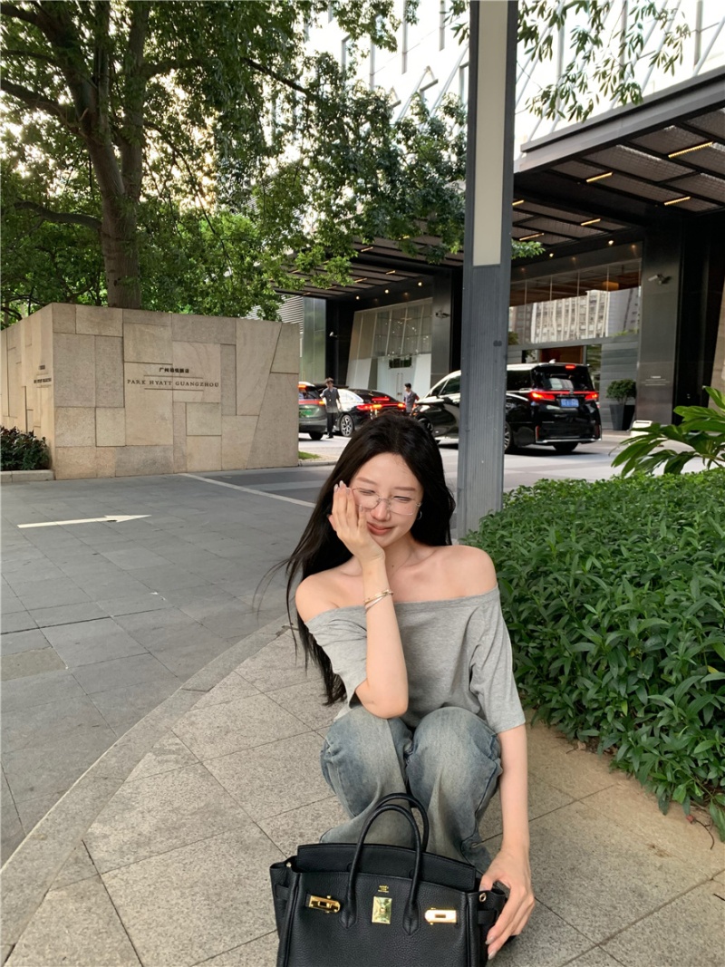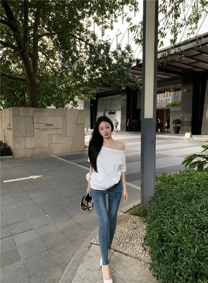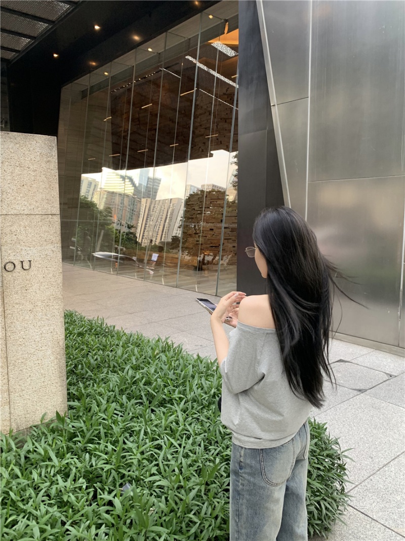 辣妹斜肩短袖宽松T恤女2025夏季新款休闲不规则纯色百搭学生上衣