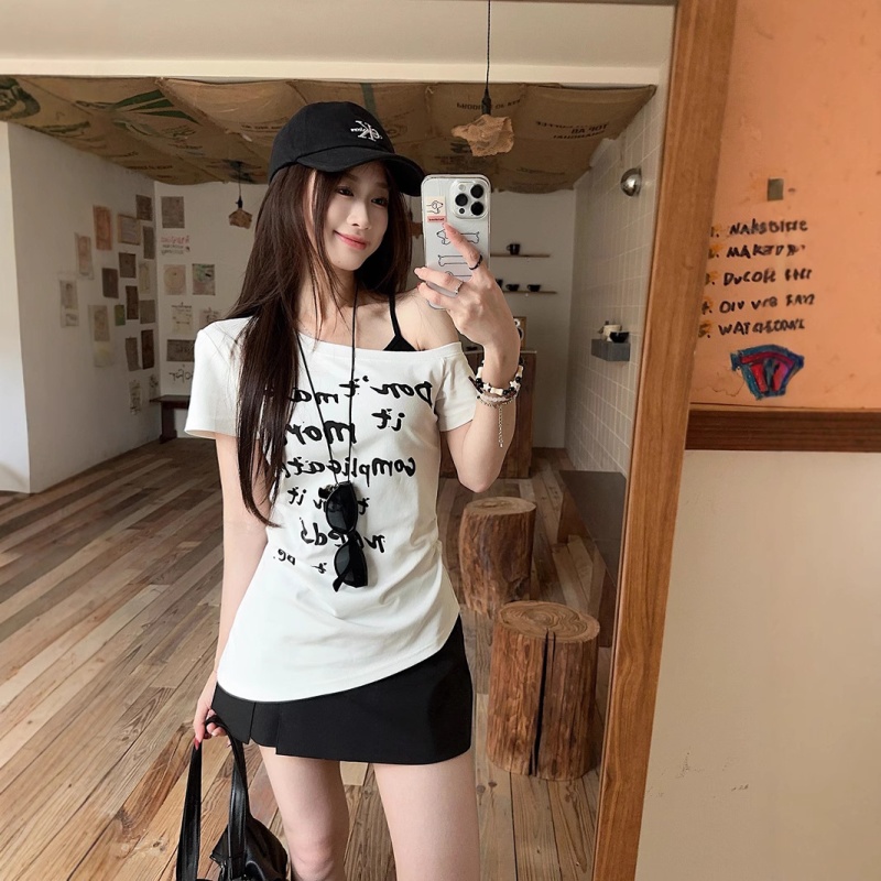 美式辣妹字母印花斜肩短袖T恤女2025夏季设计感修身收腰露肩上衣