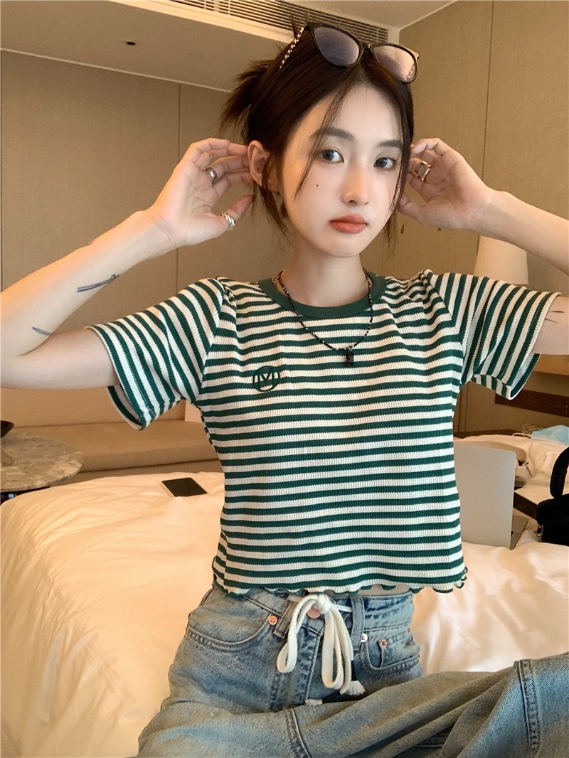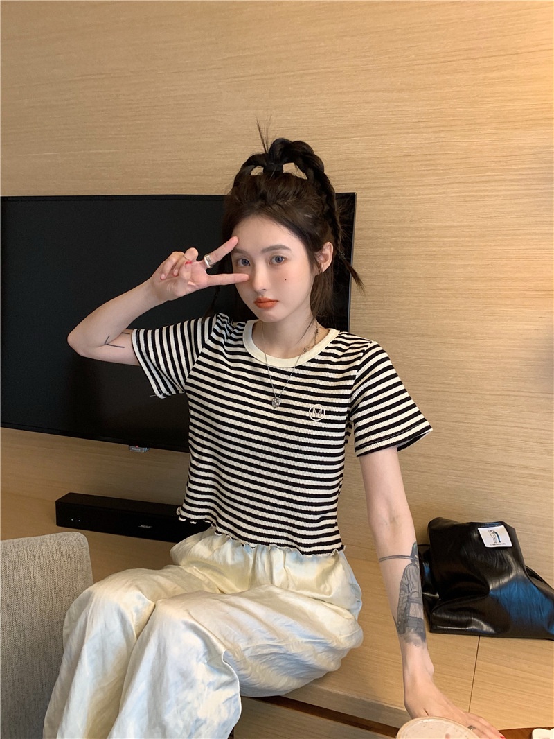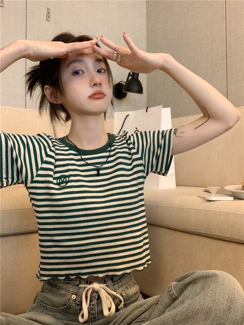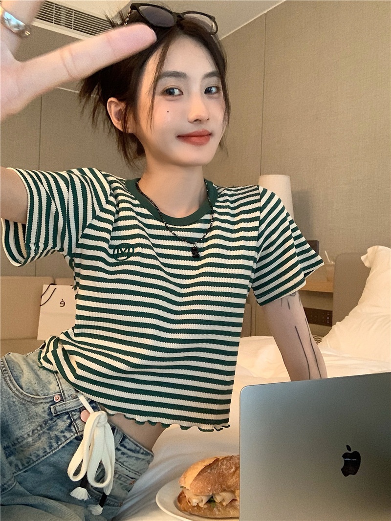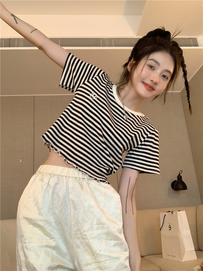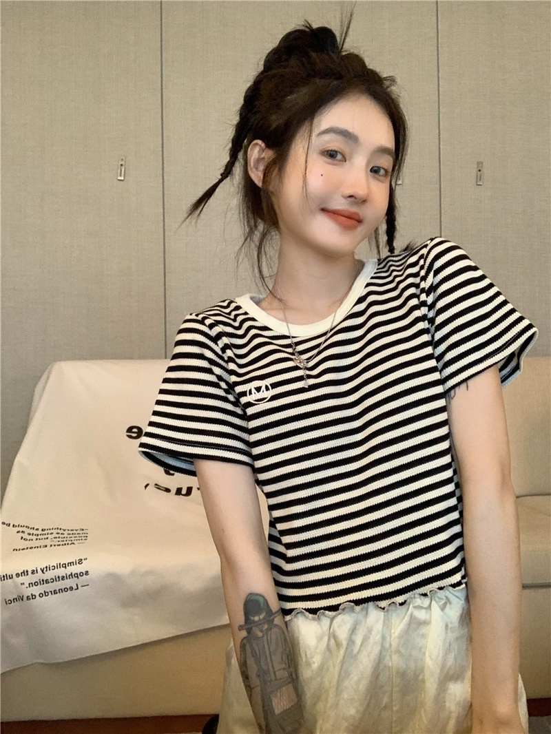 百搭条纹短袖t恤女ins潮夏季2025新款韩版设计感修身短款学生上衣