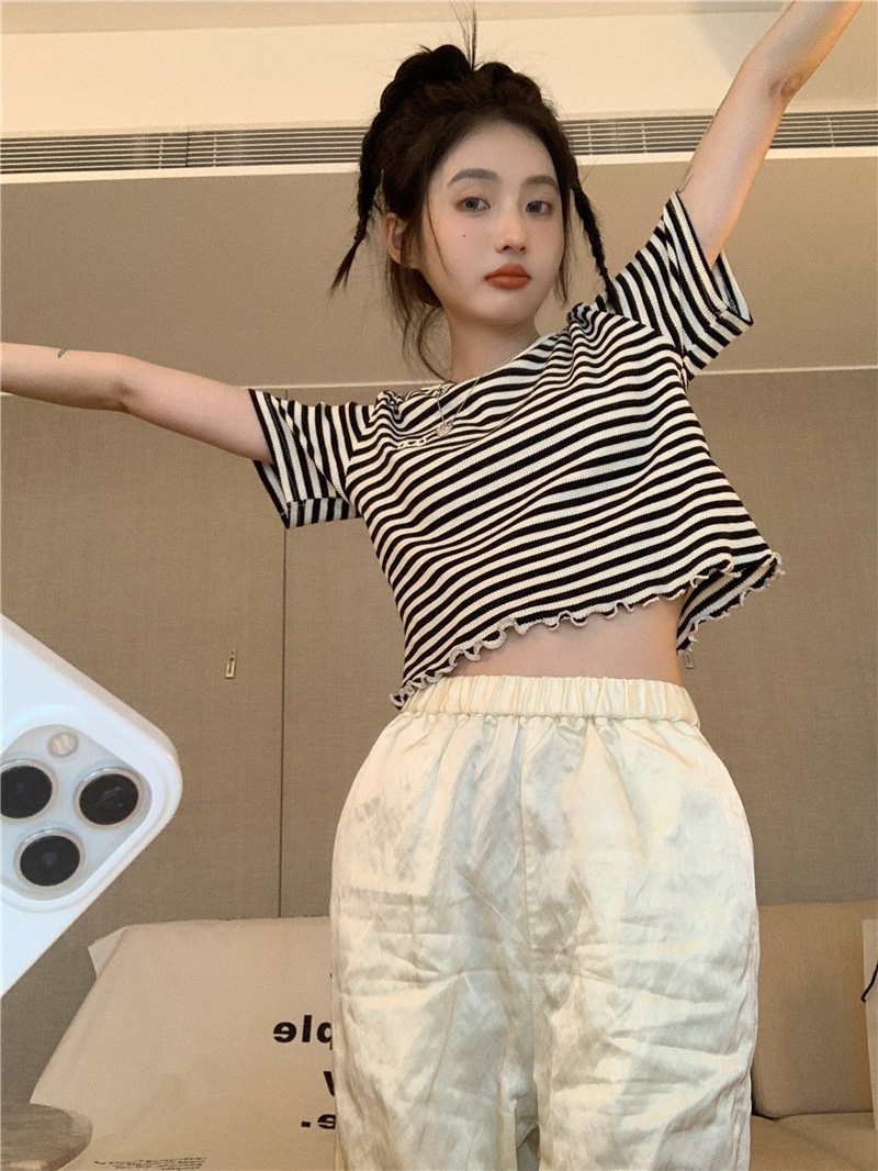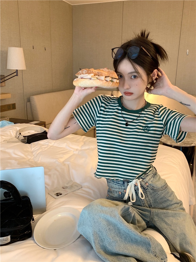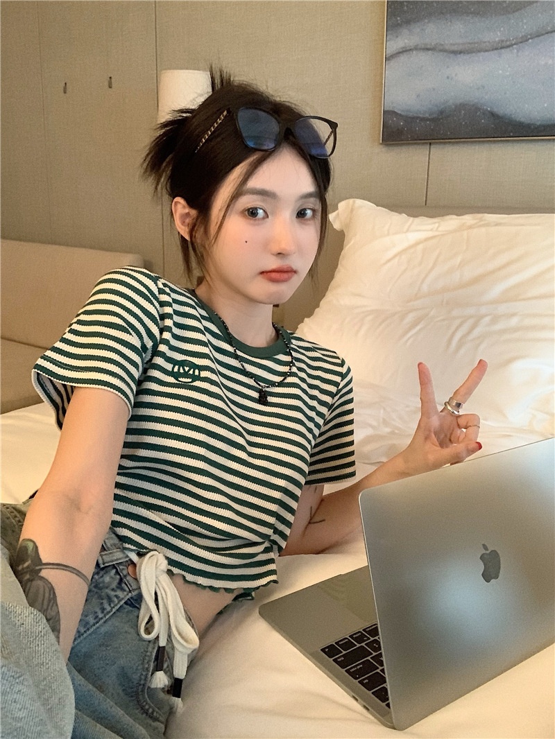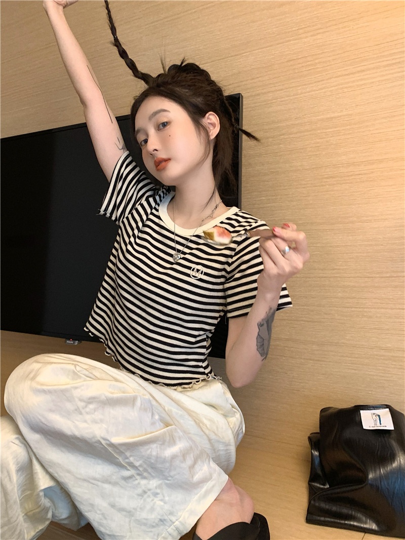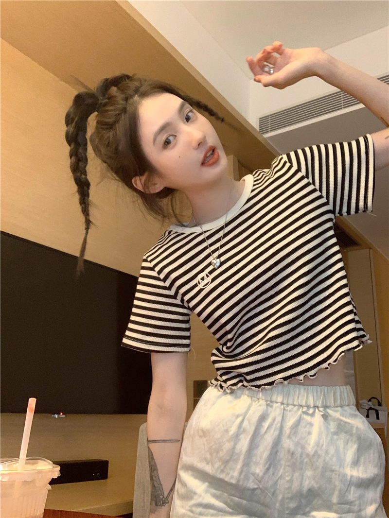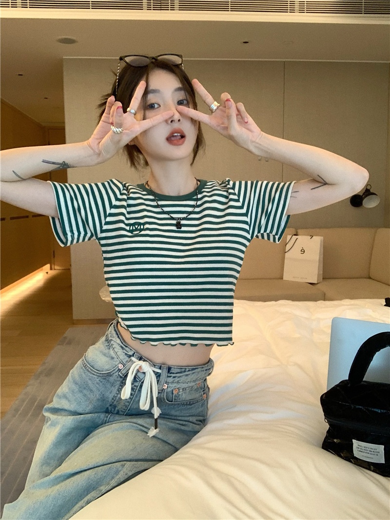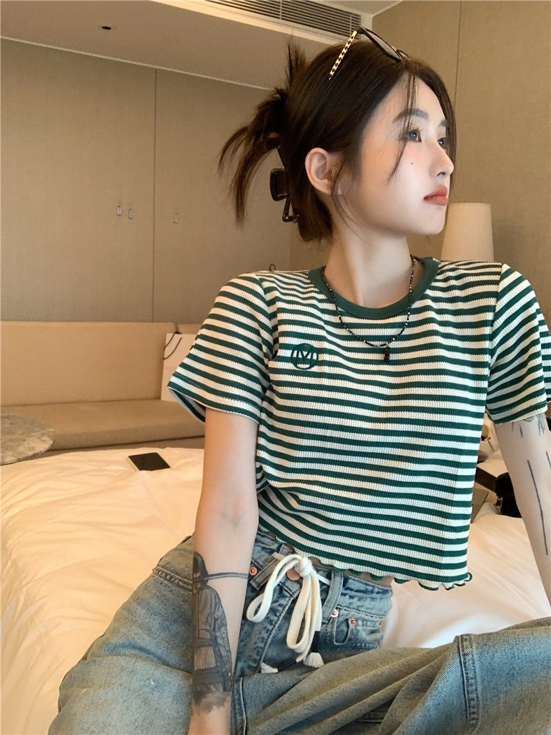 百搭条纹短袖t恤女ins潮夏季2025新款韩版设计感修身短款学生上衣