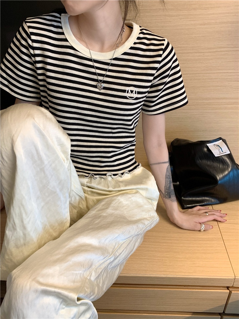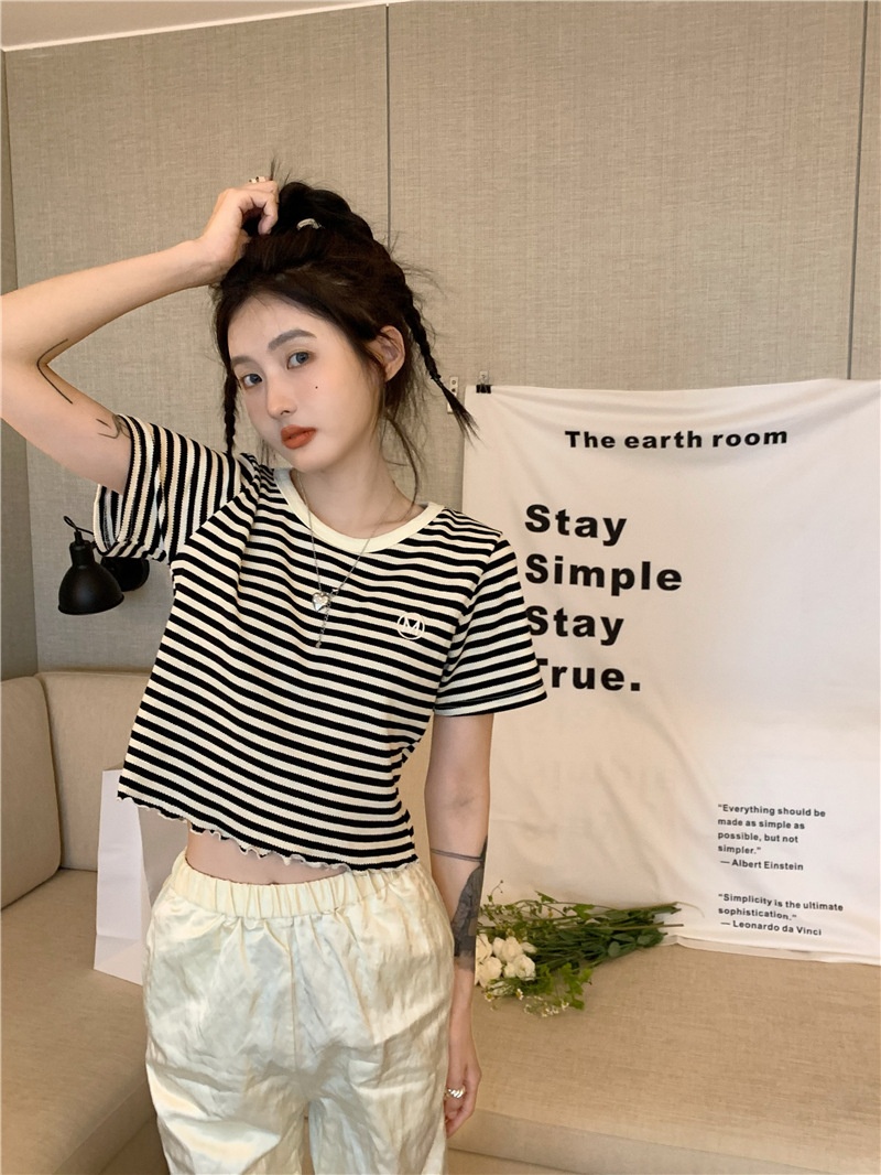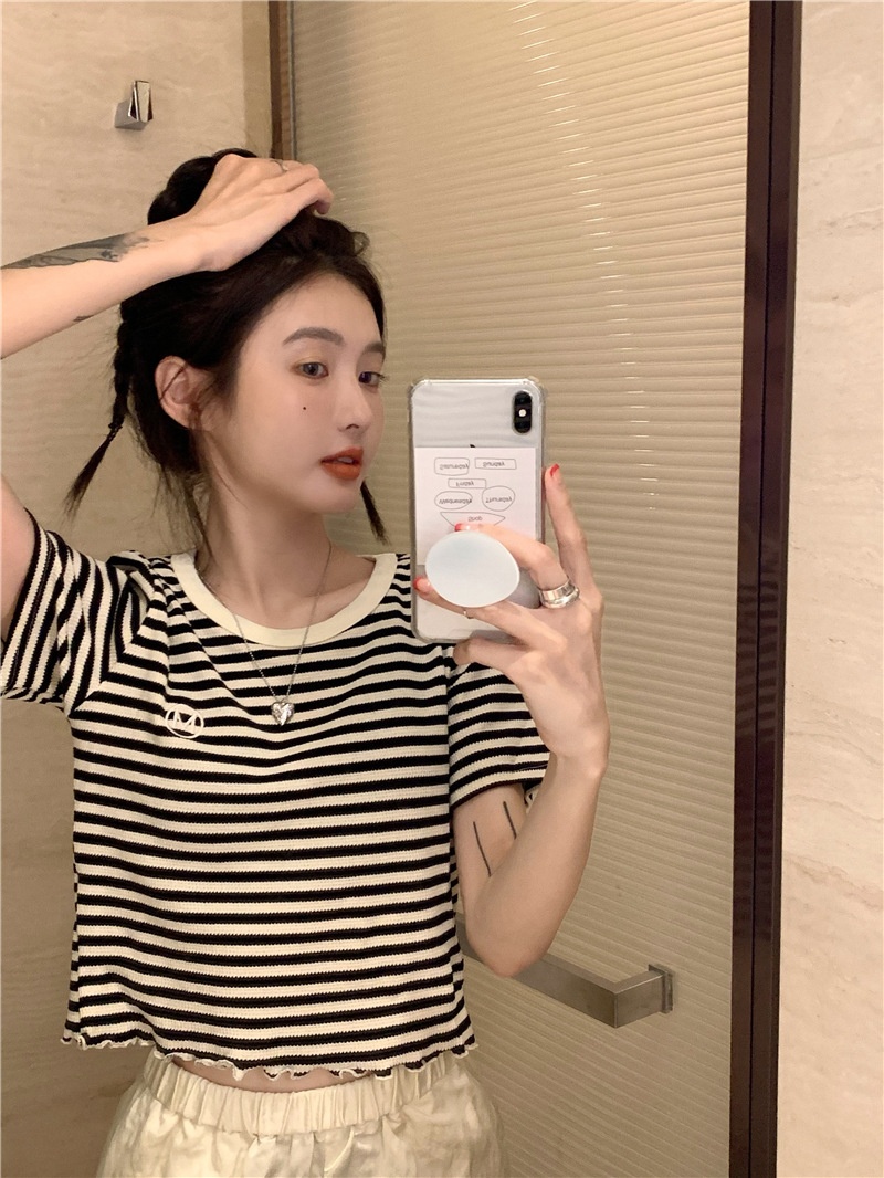 百搭条纹短袖t恤女ins潮春季2023新款韩版设计感洋气修身短款上衣