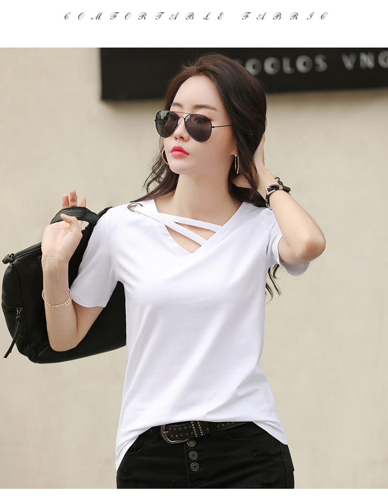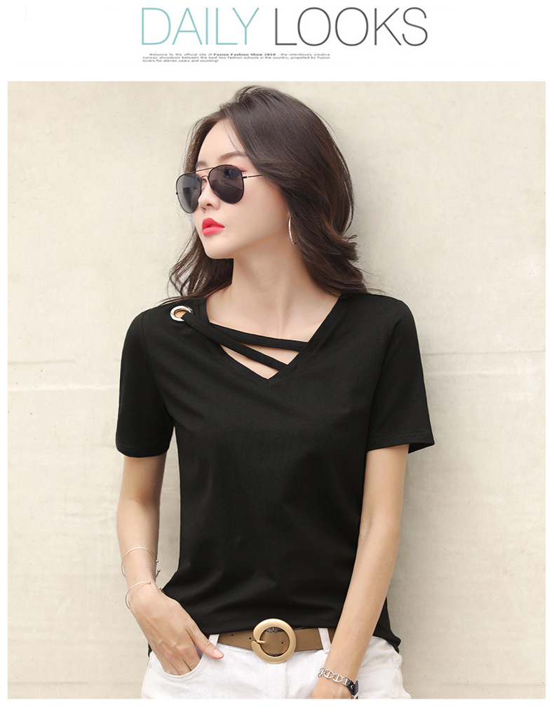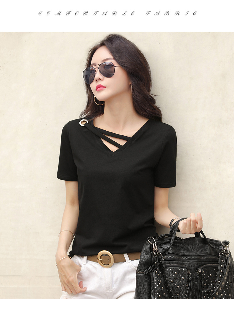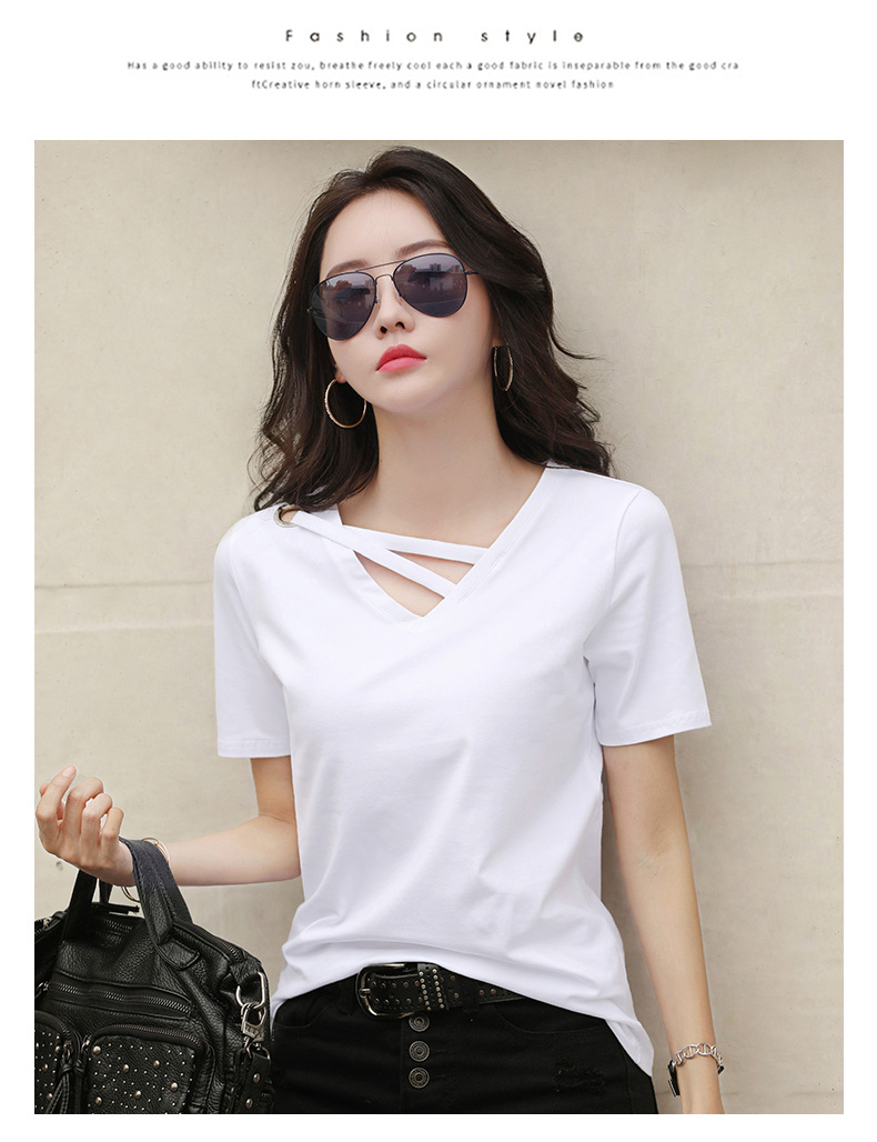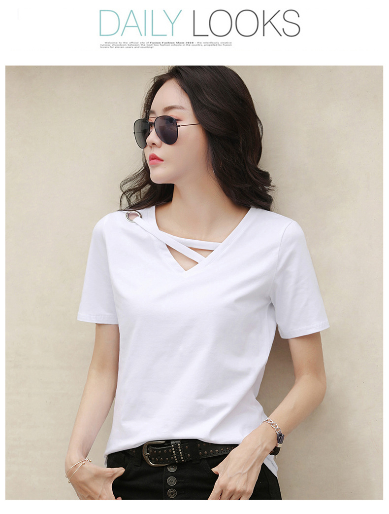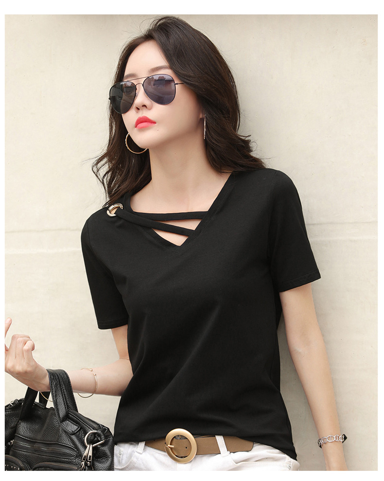 短袖女2025新款夏季白色t恤女V领宽松韩版黑色上衣休闲ins体恤潮