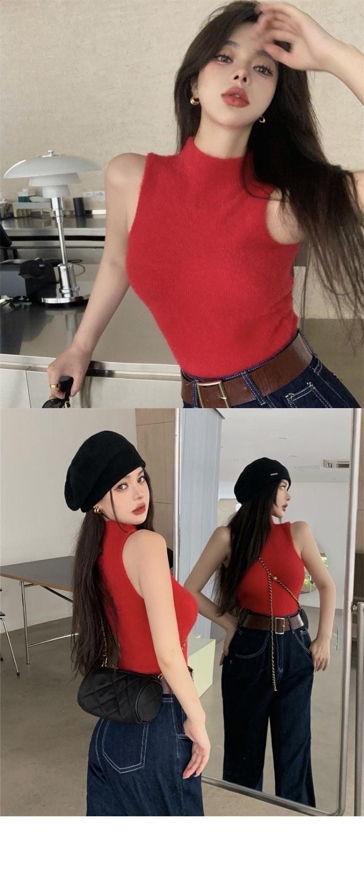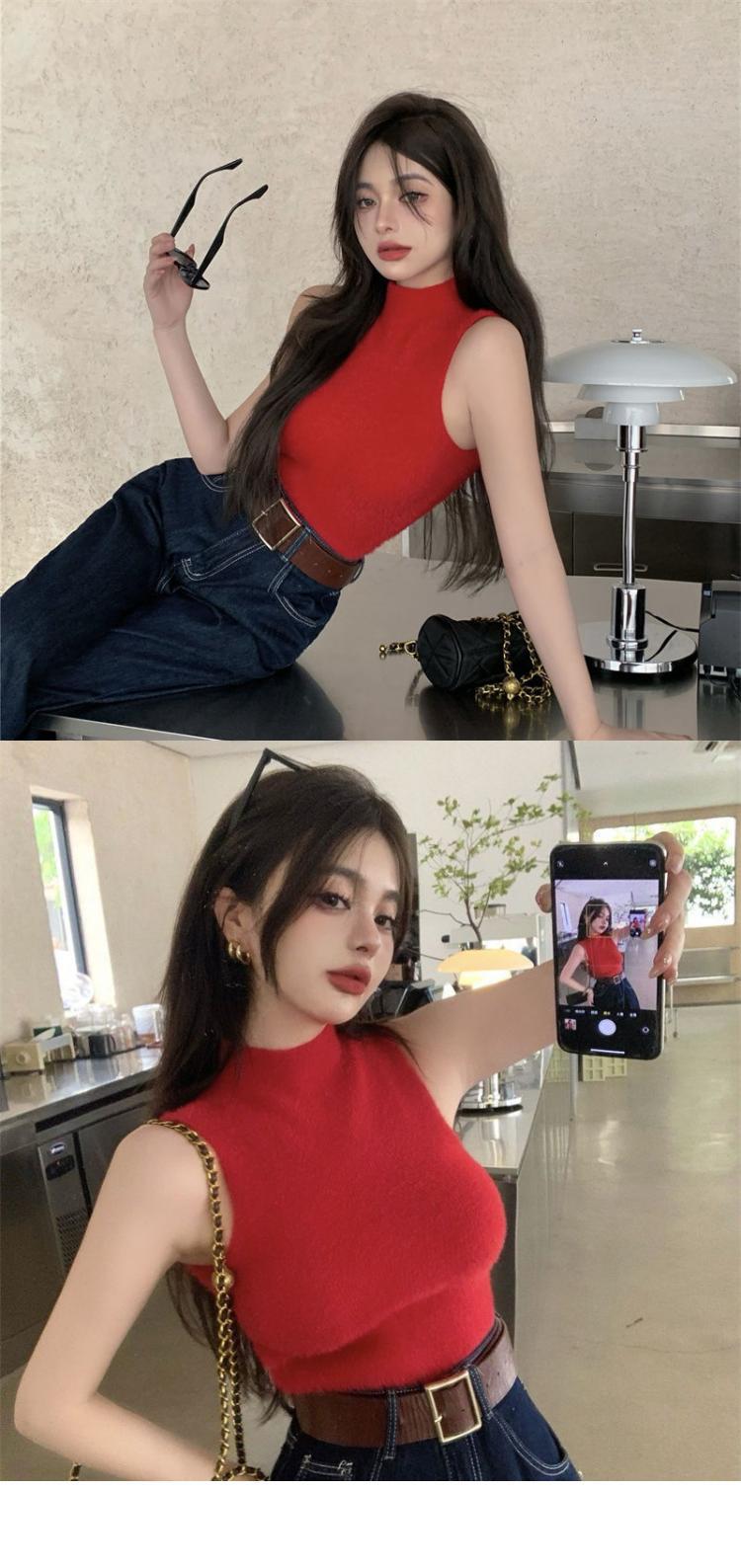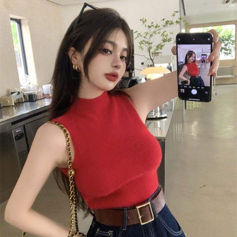 毛绒绒半高领吊带背心女春夏新款辣妹无袖短款内搭上衣针织打底衫