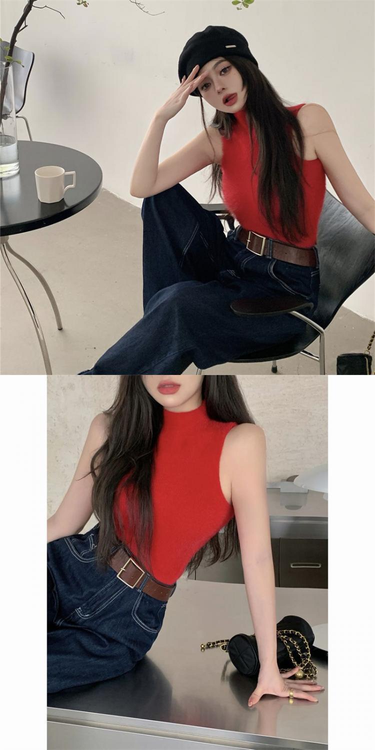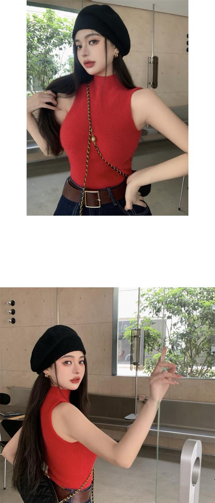 新款复古半高领修身针织衫女无袖百搭打底背心上衣