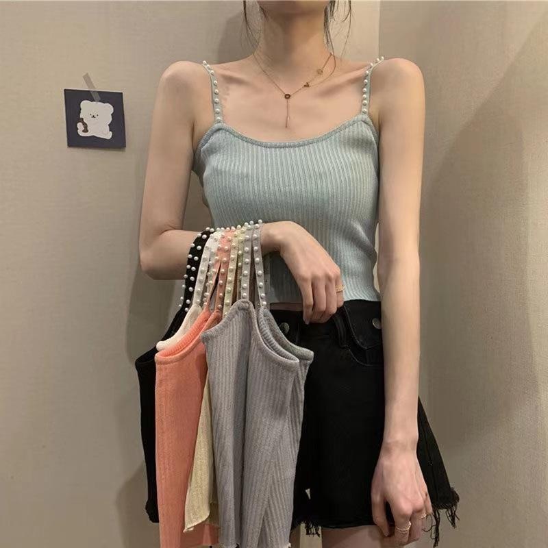 小个子网红韩版钉珠小吊带背心女甜美修身显瘦编制弹力短款上衣女