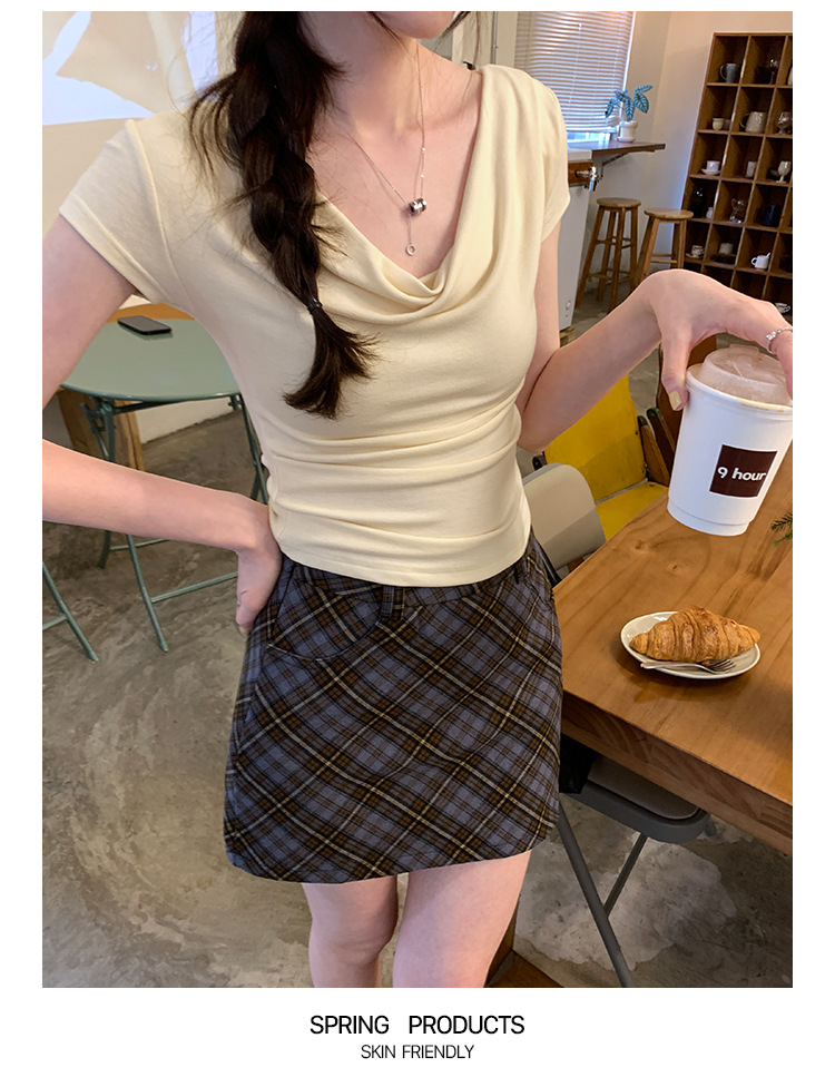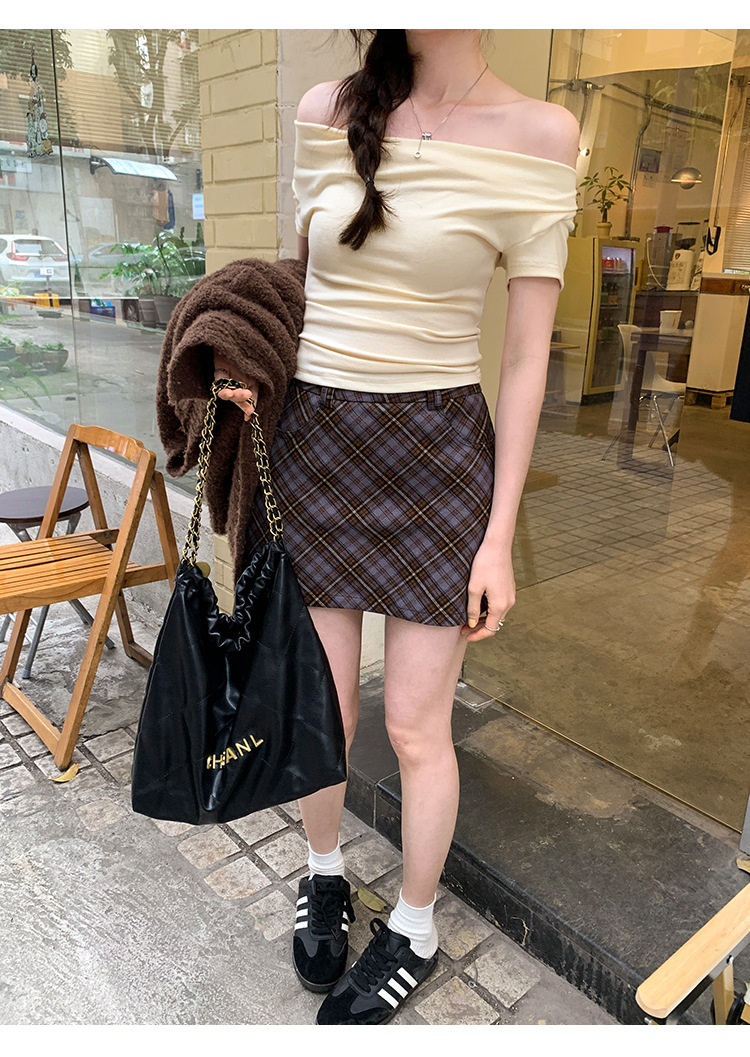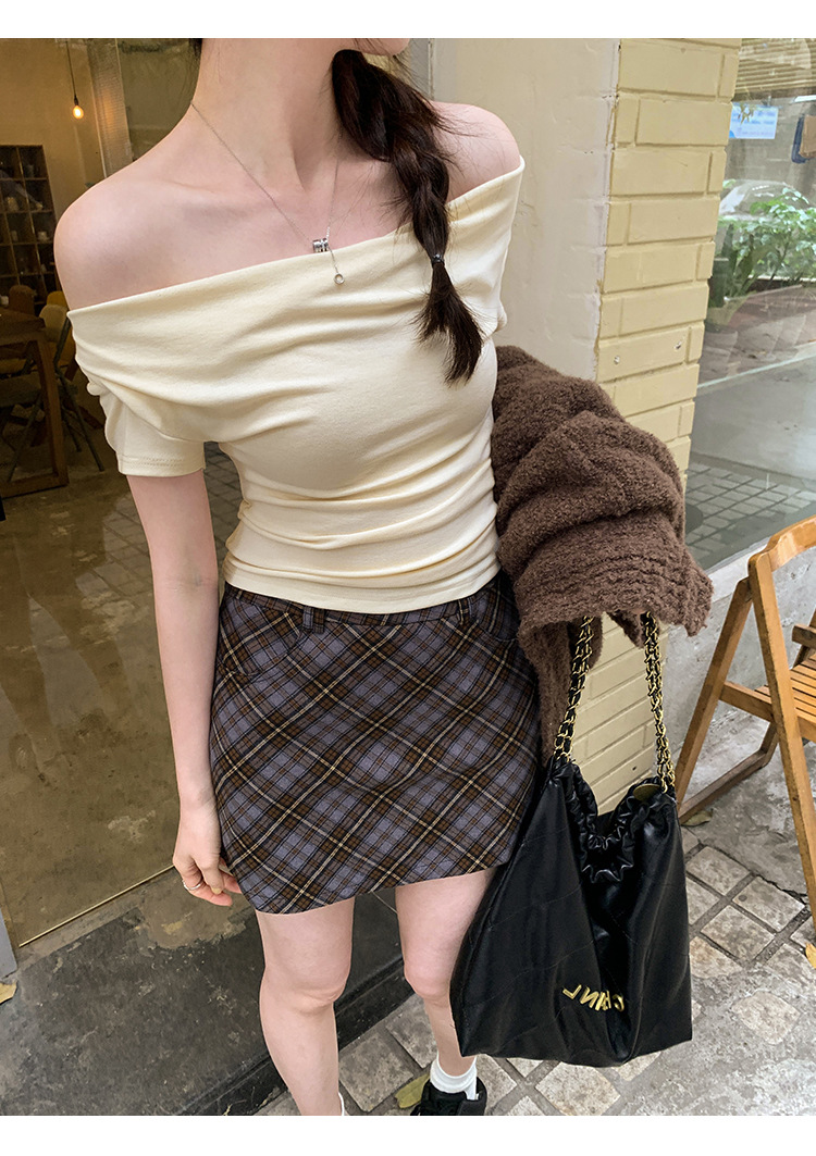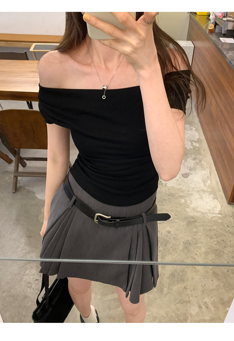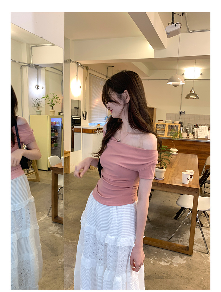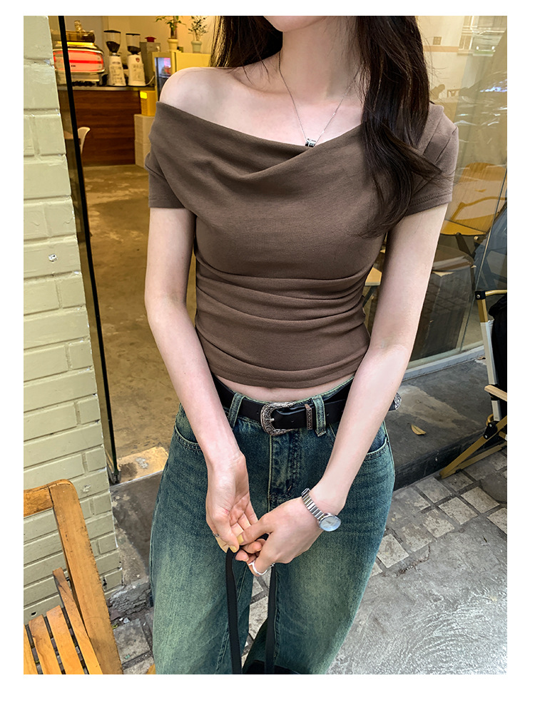 法式设计感荡领一字肩短袖T恤女春季修身辣妹紧身露肩短款小上衣