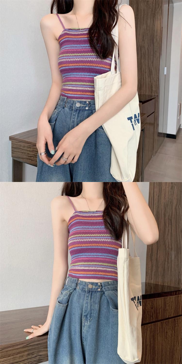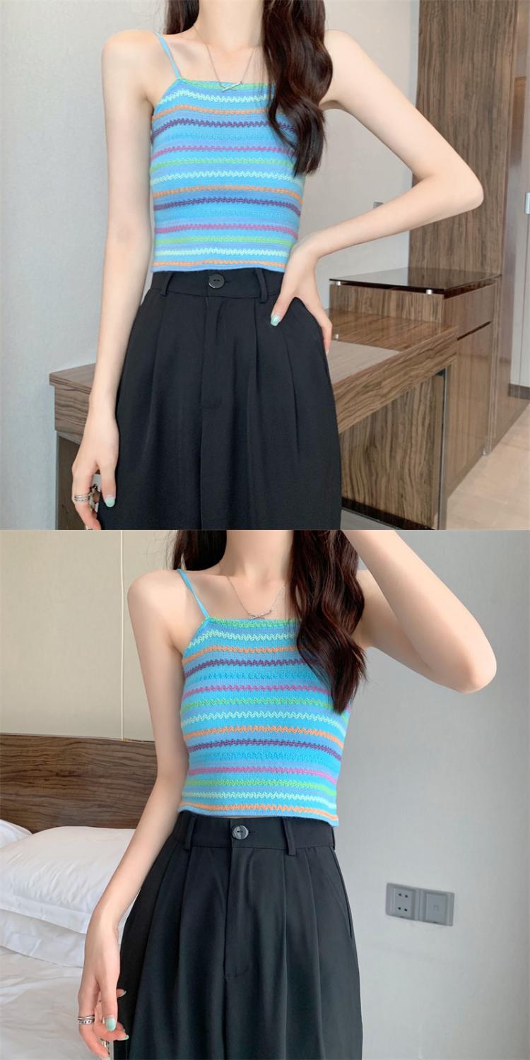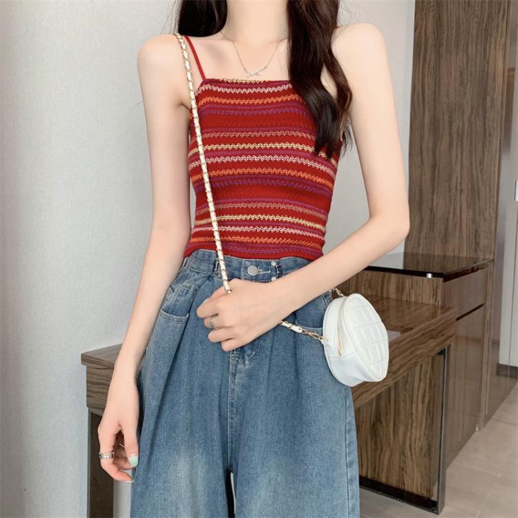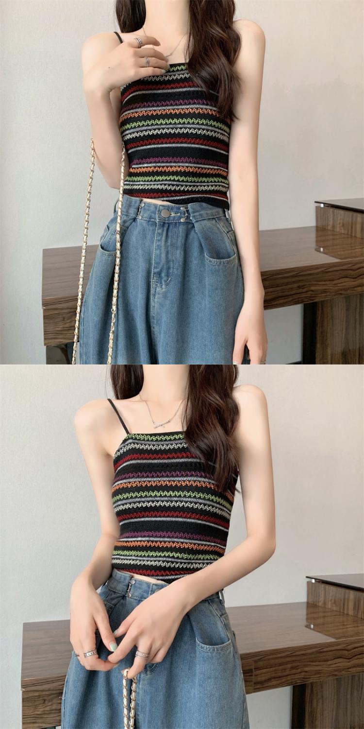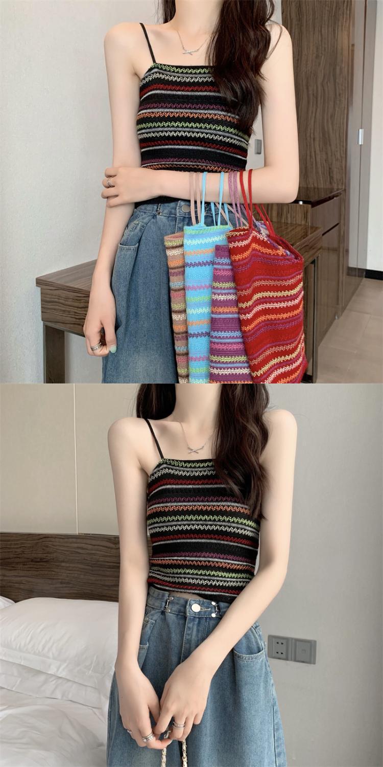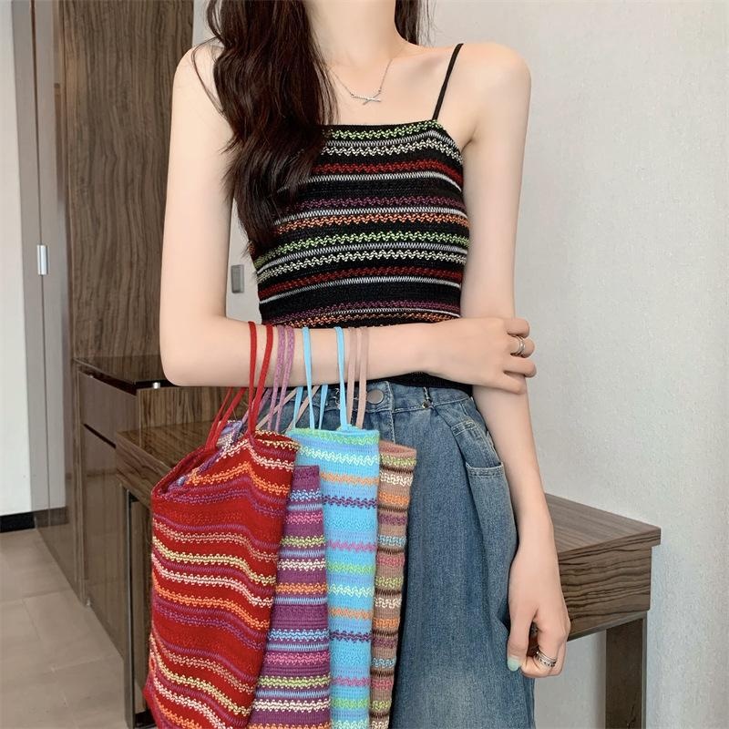 彩条拼色背心女内搭一字领复古针织吊带衫民族风辣妹穿搭打底上衣