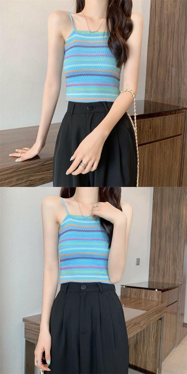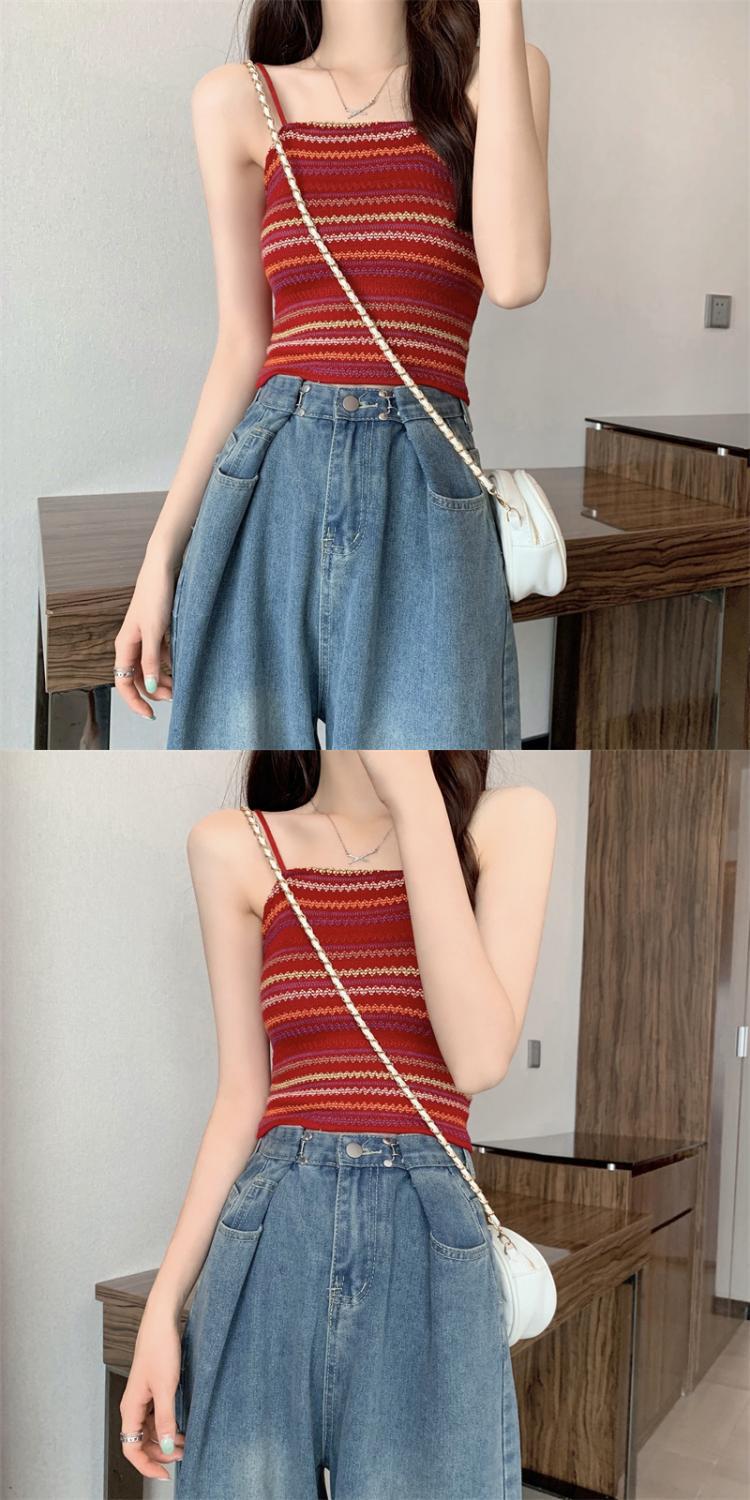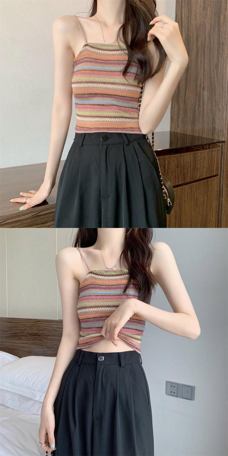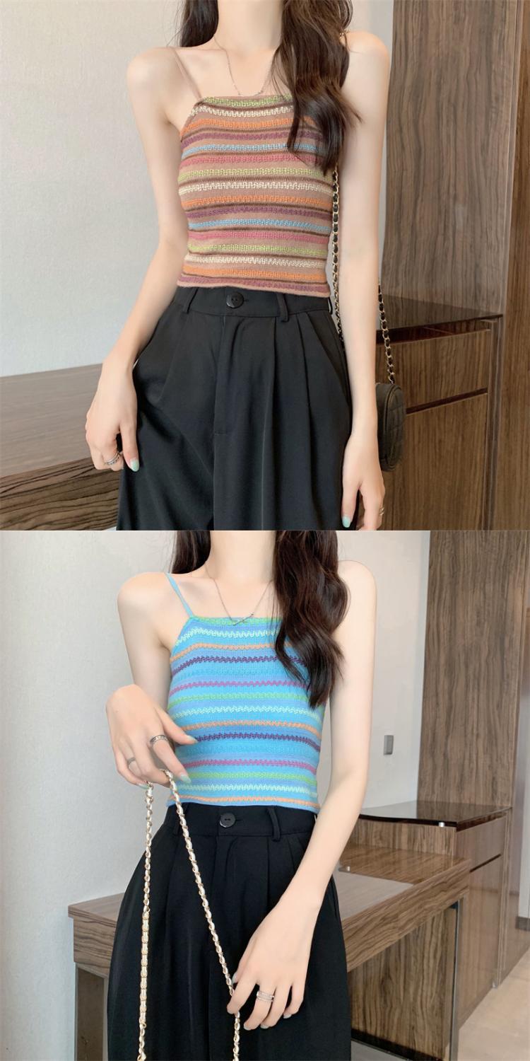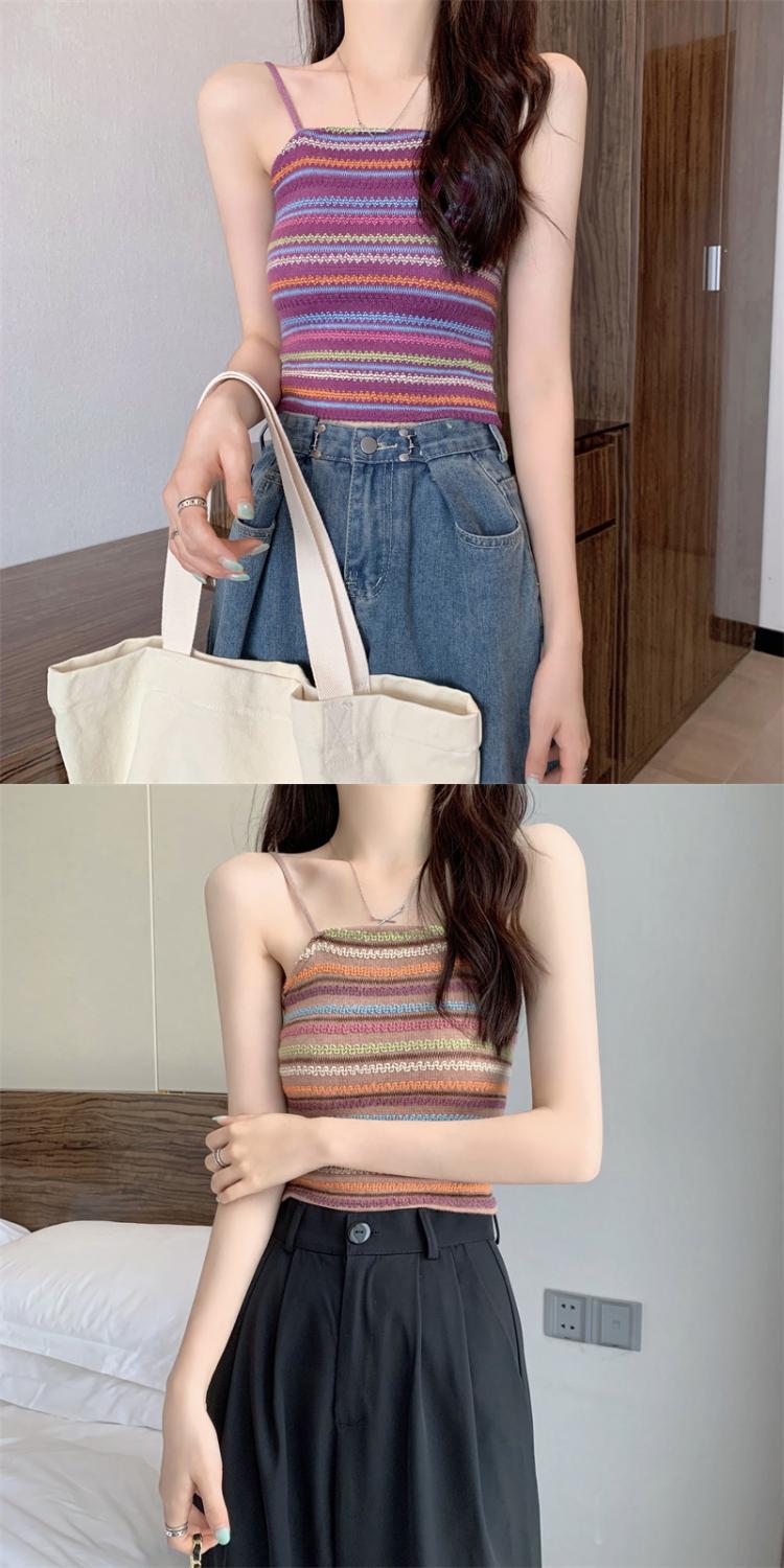 彩条拼色背心女内搭一字领复古针织吊带衫民族风辣妹穿搭打底上衣