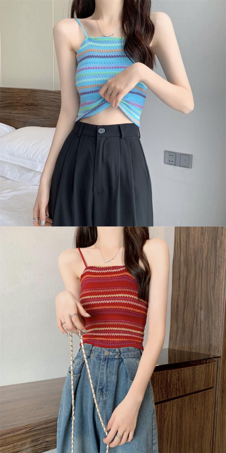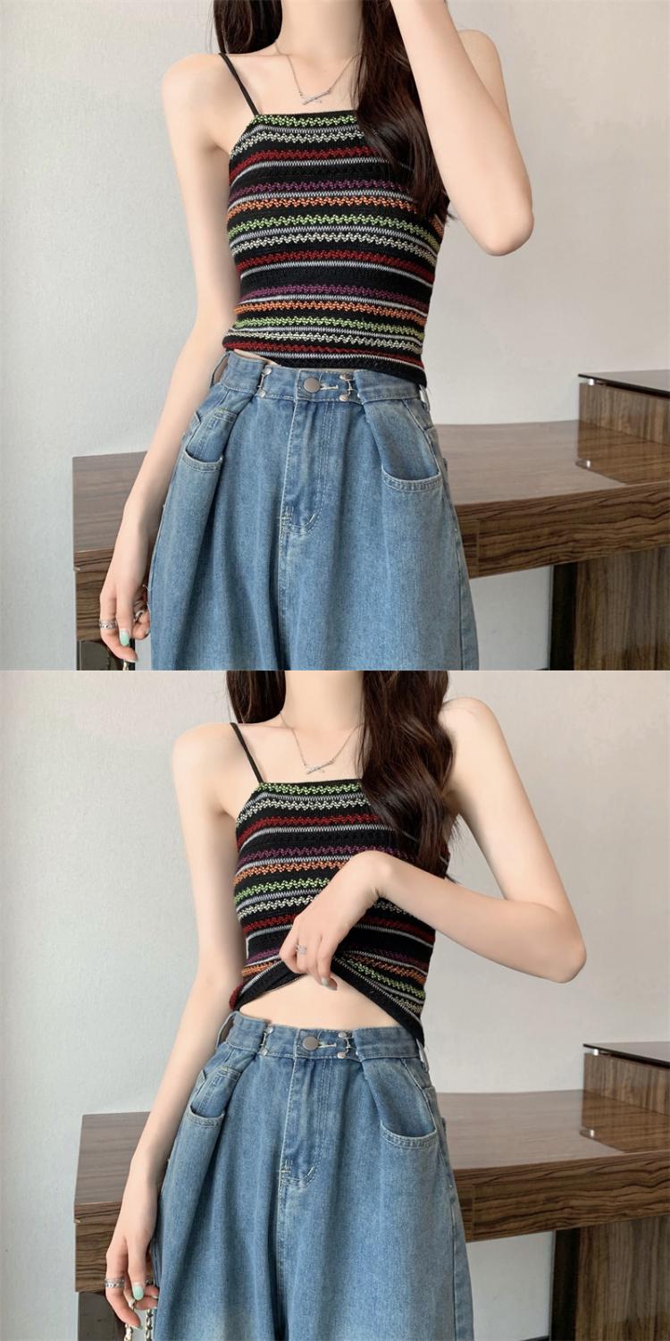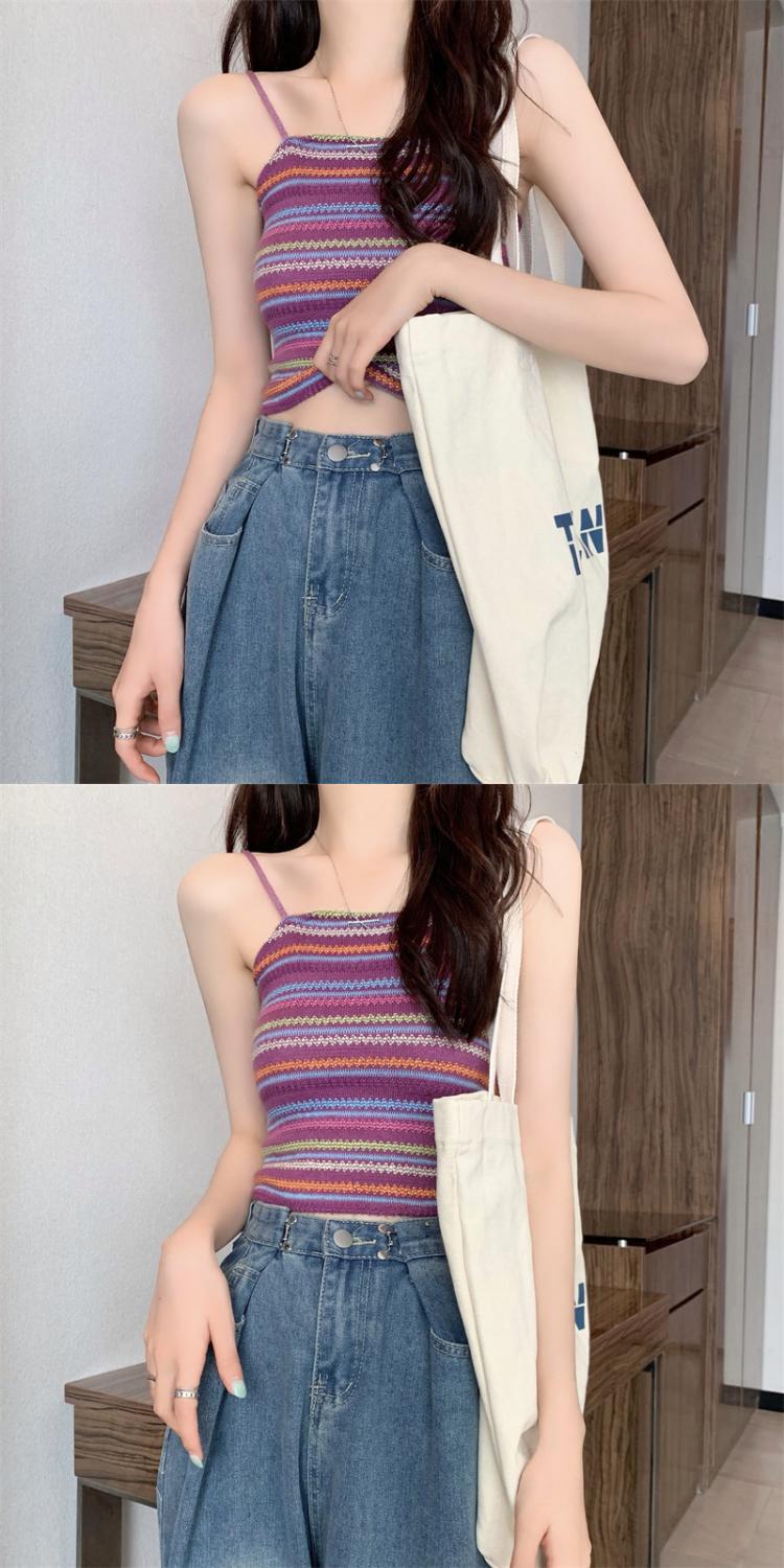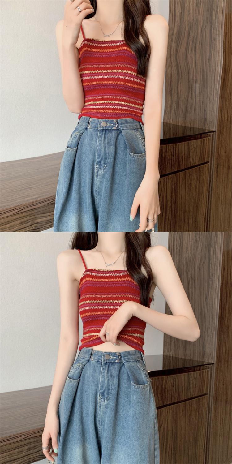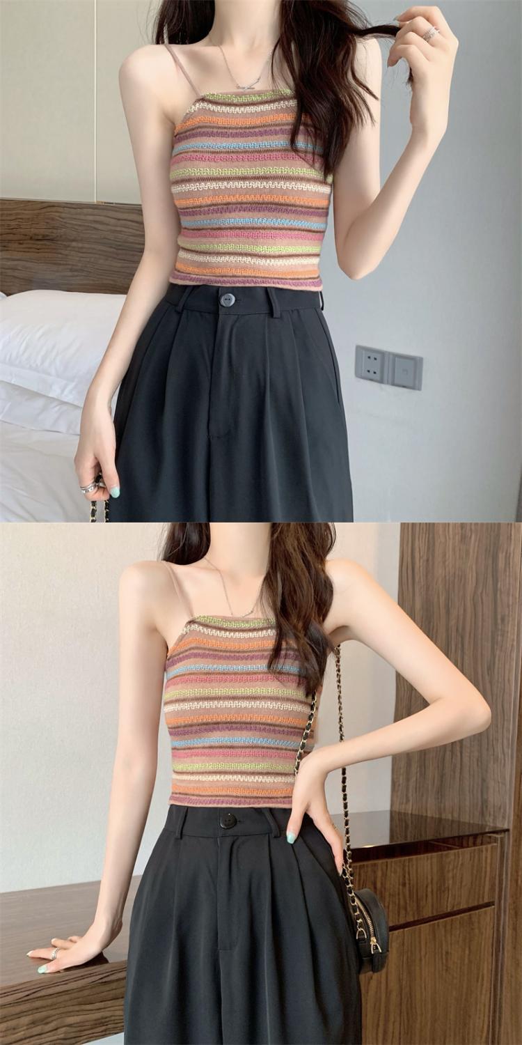 彩条拼色背心女内搭一字领复古针织吊带衫民族风辣妹穿搭打底上衣