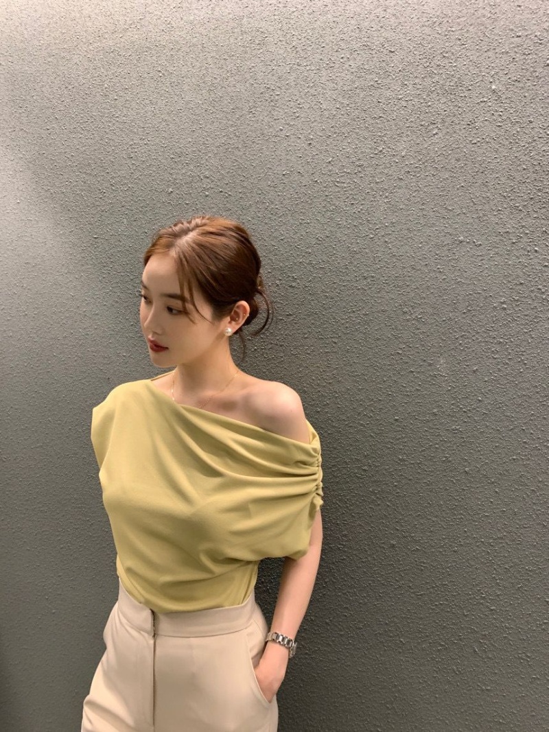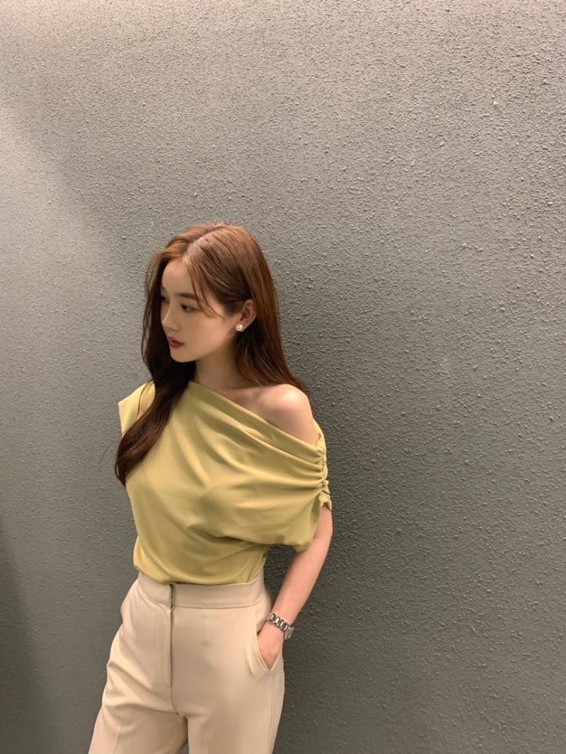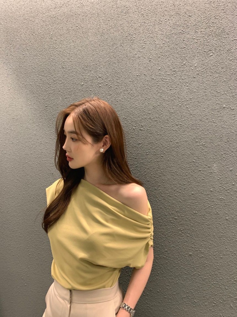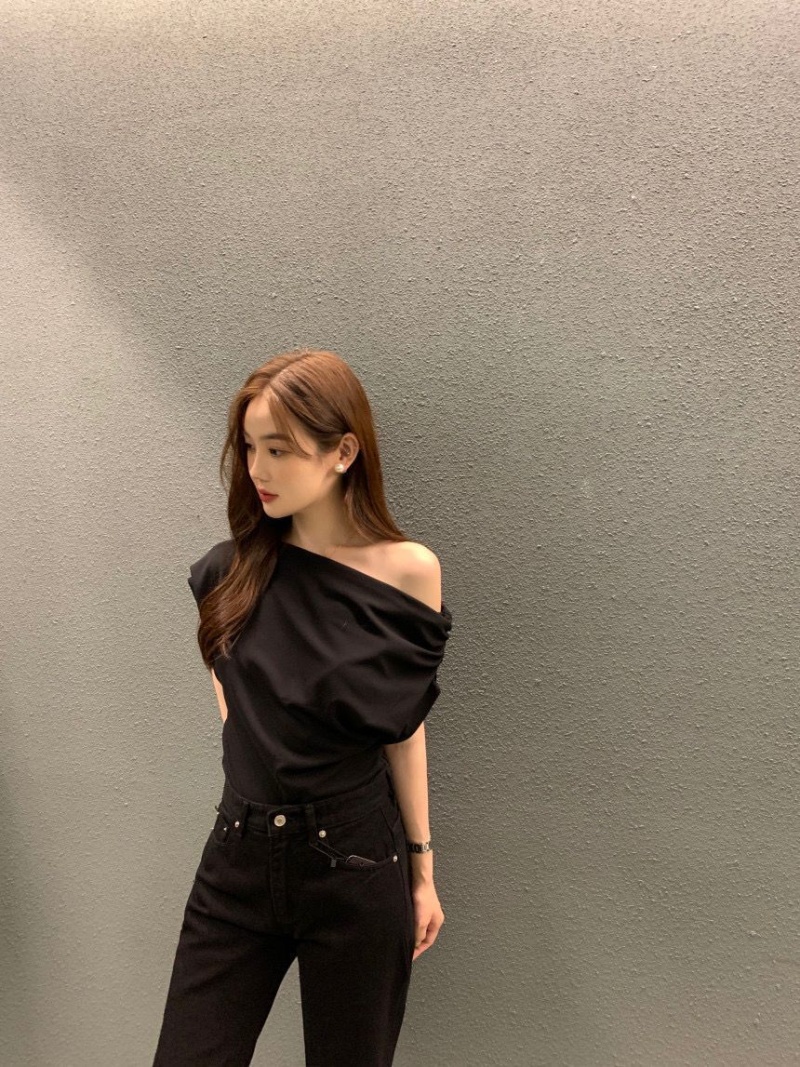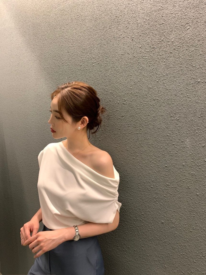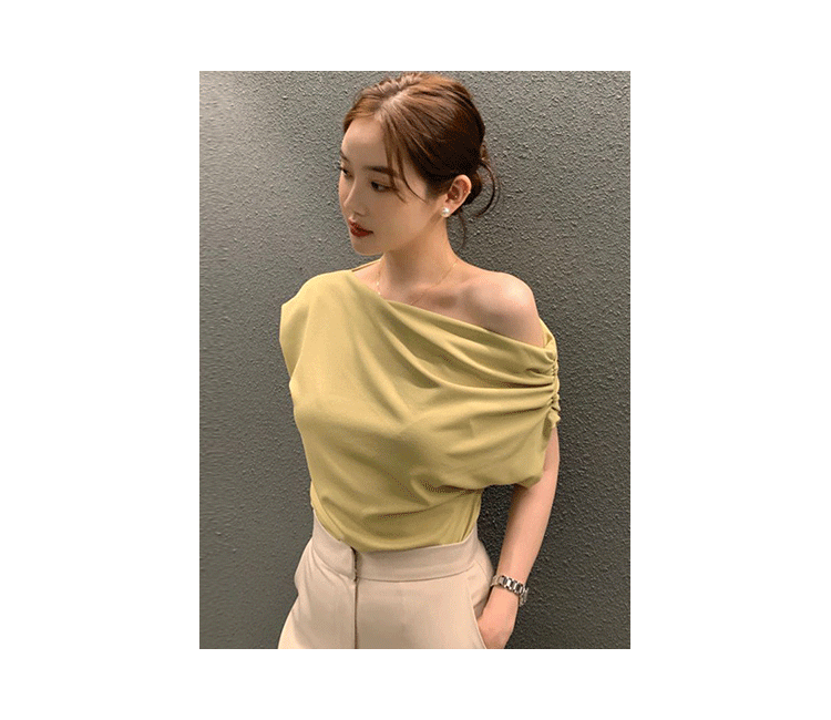 韩国chic2025夏季法式不规则斜肩设计感宽松纯色套头短袖T恤女潮