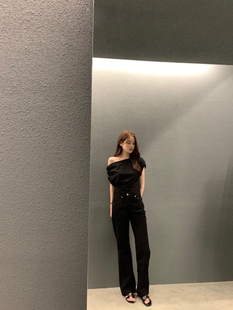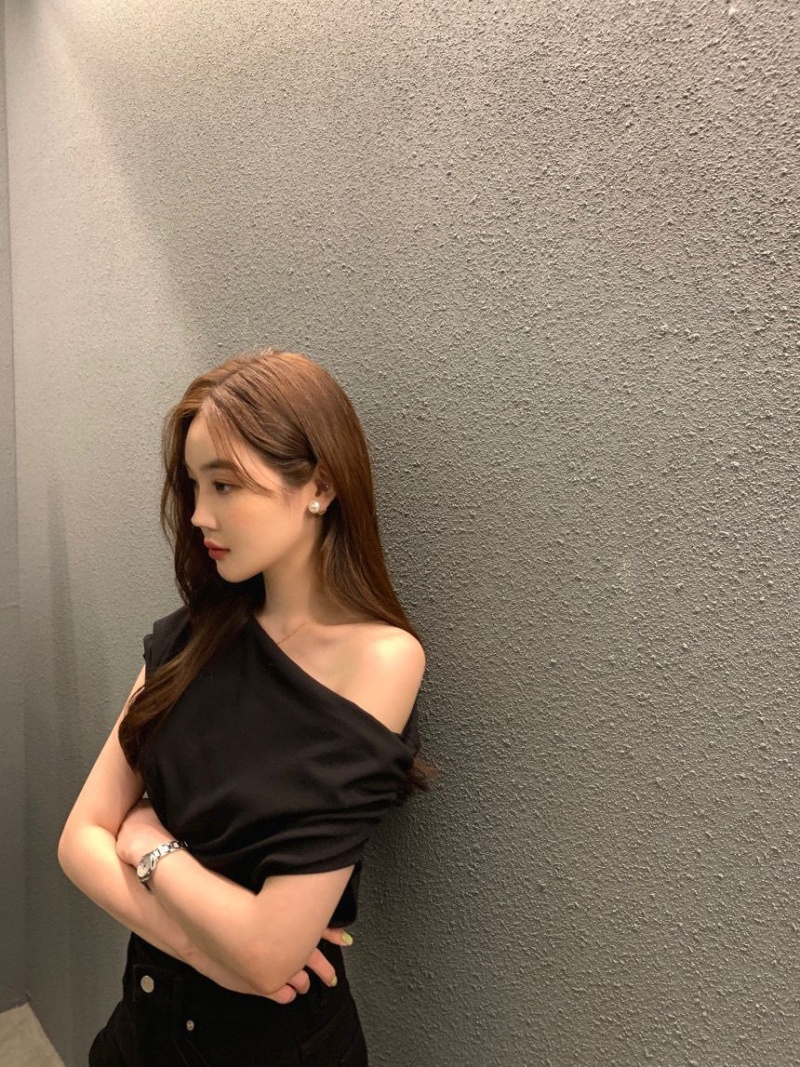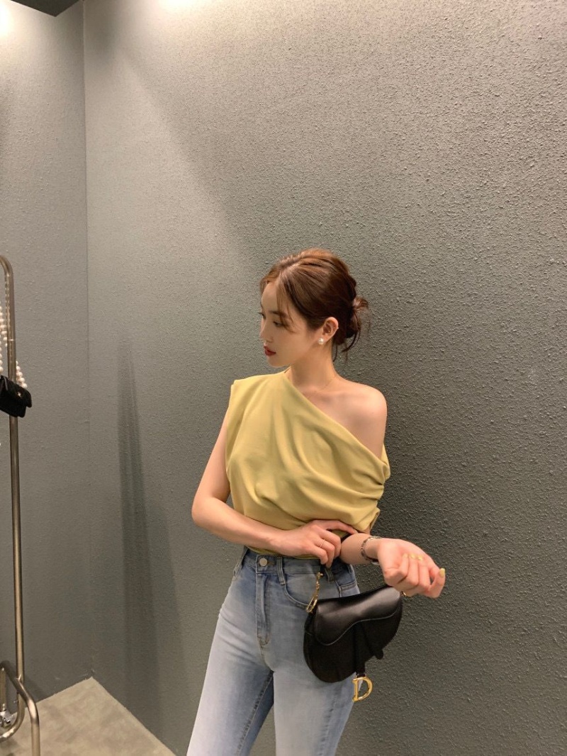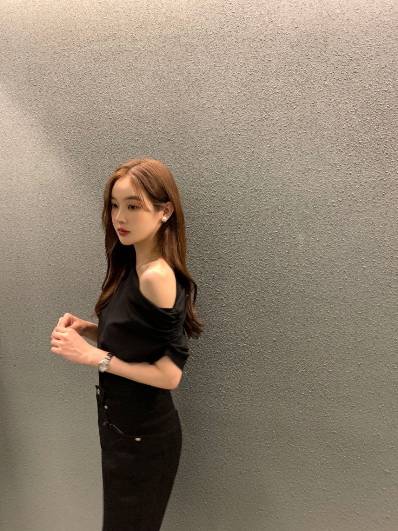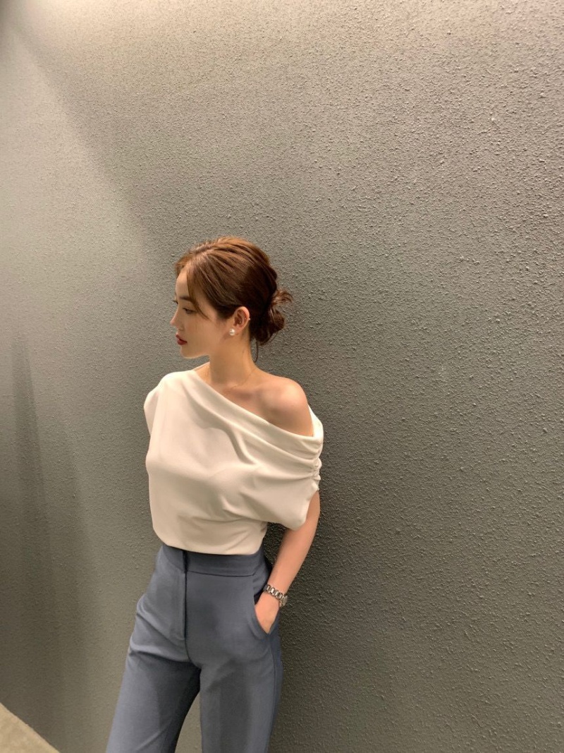 韩国chic2025夏季法式不规则斜肩设计感宽松纯色套头短袖T恤女潮