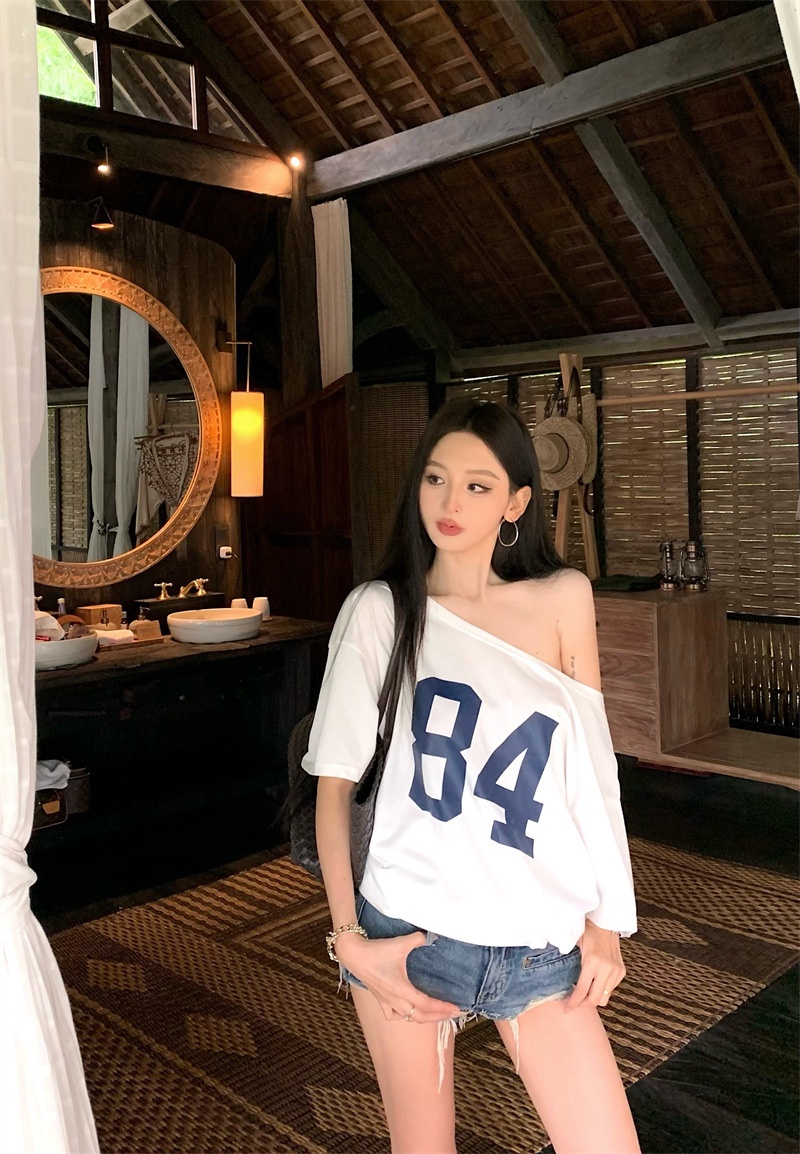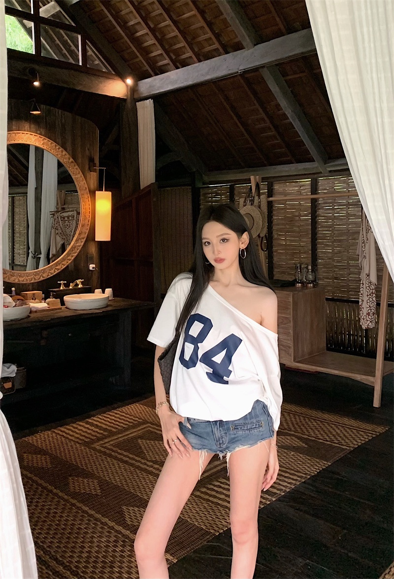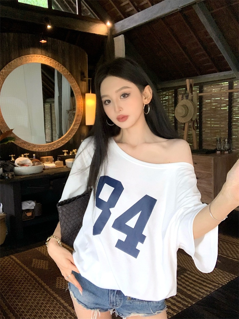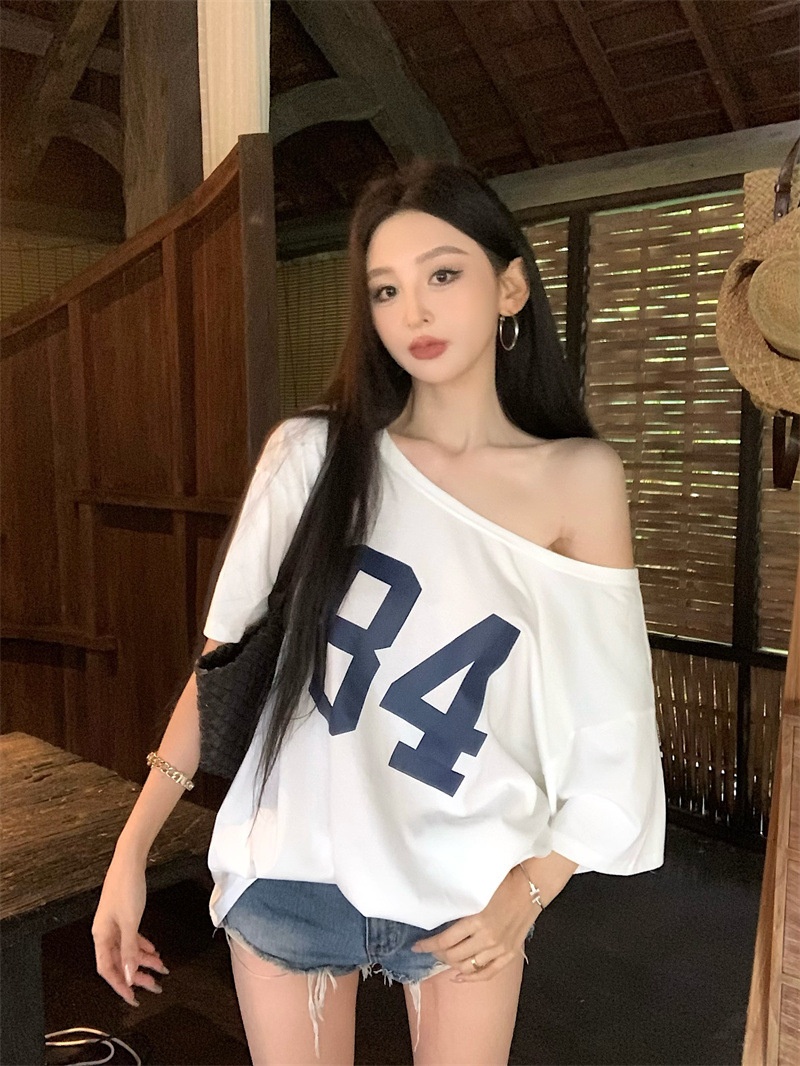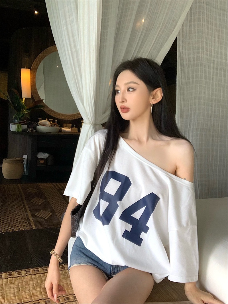 斜肩短袖T恤女2025夏季新款宽松美式辣妹chic半袖百搭学生上衣潮