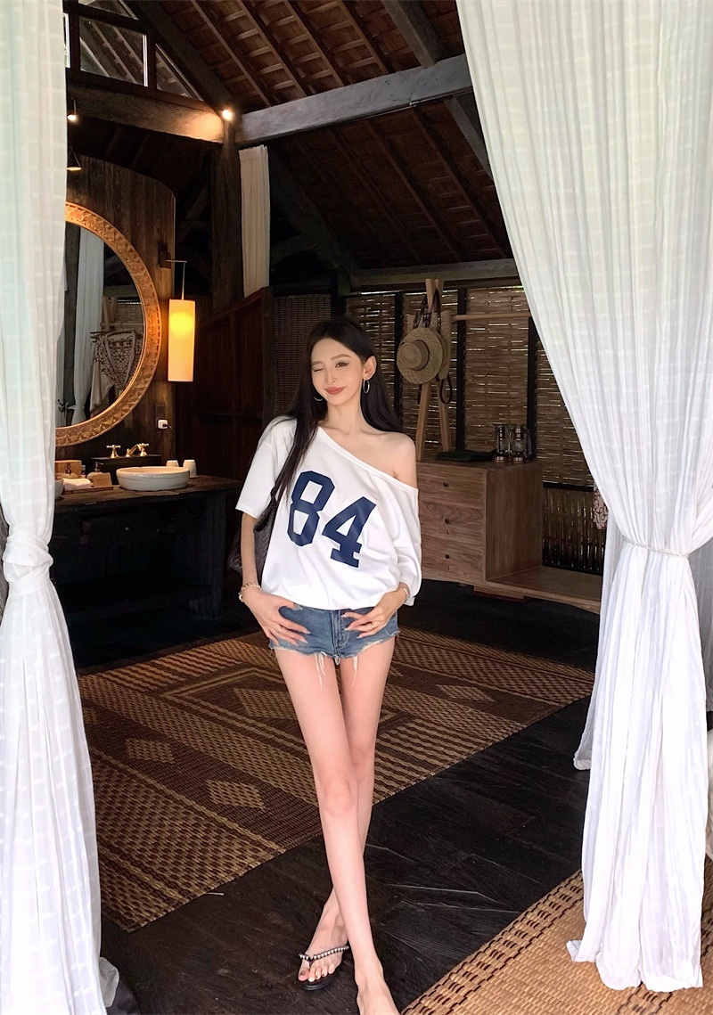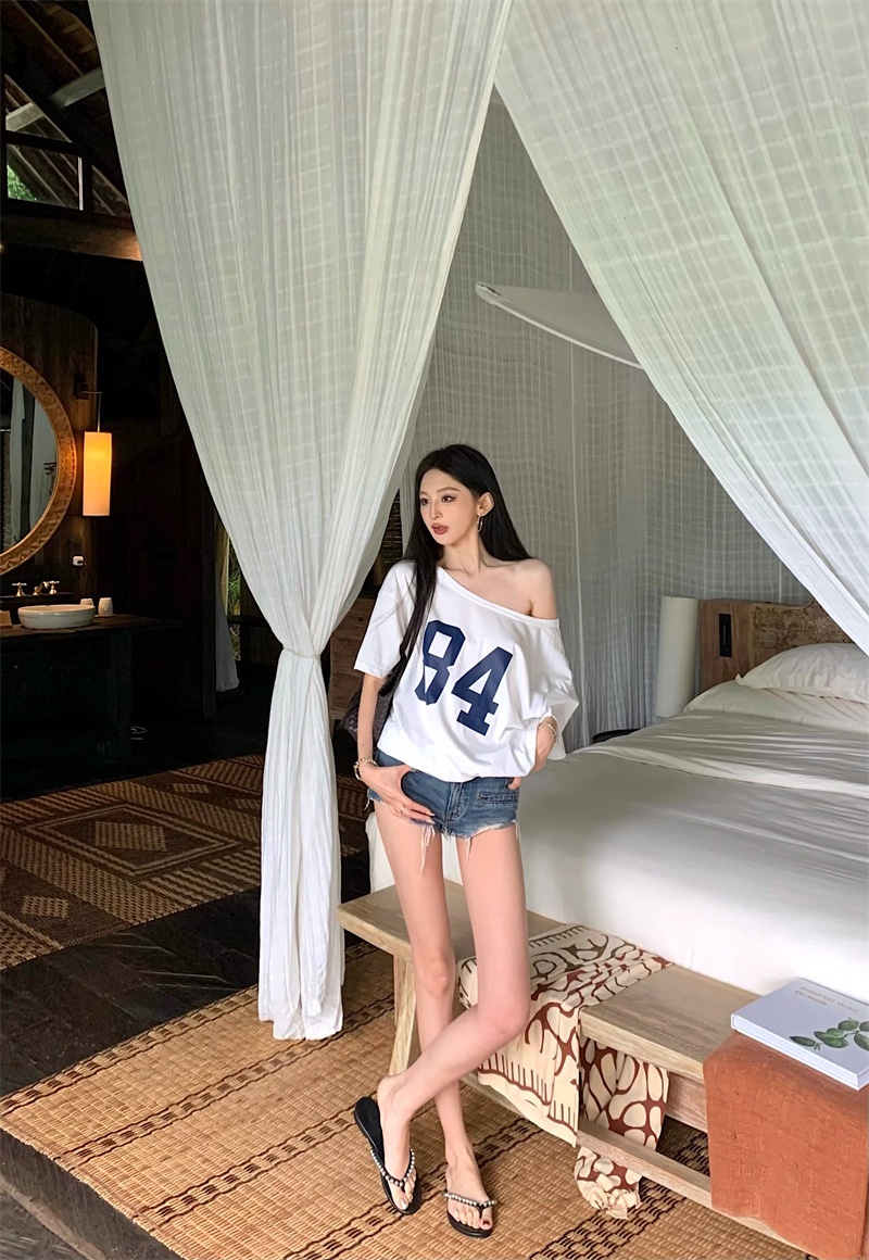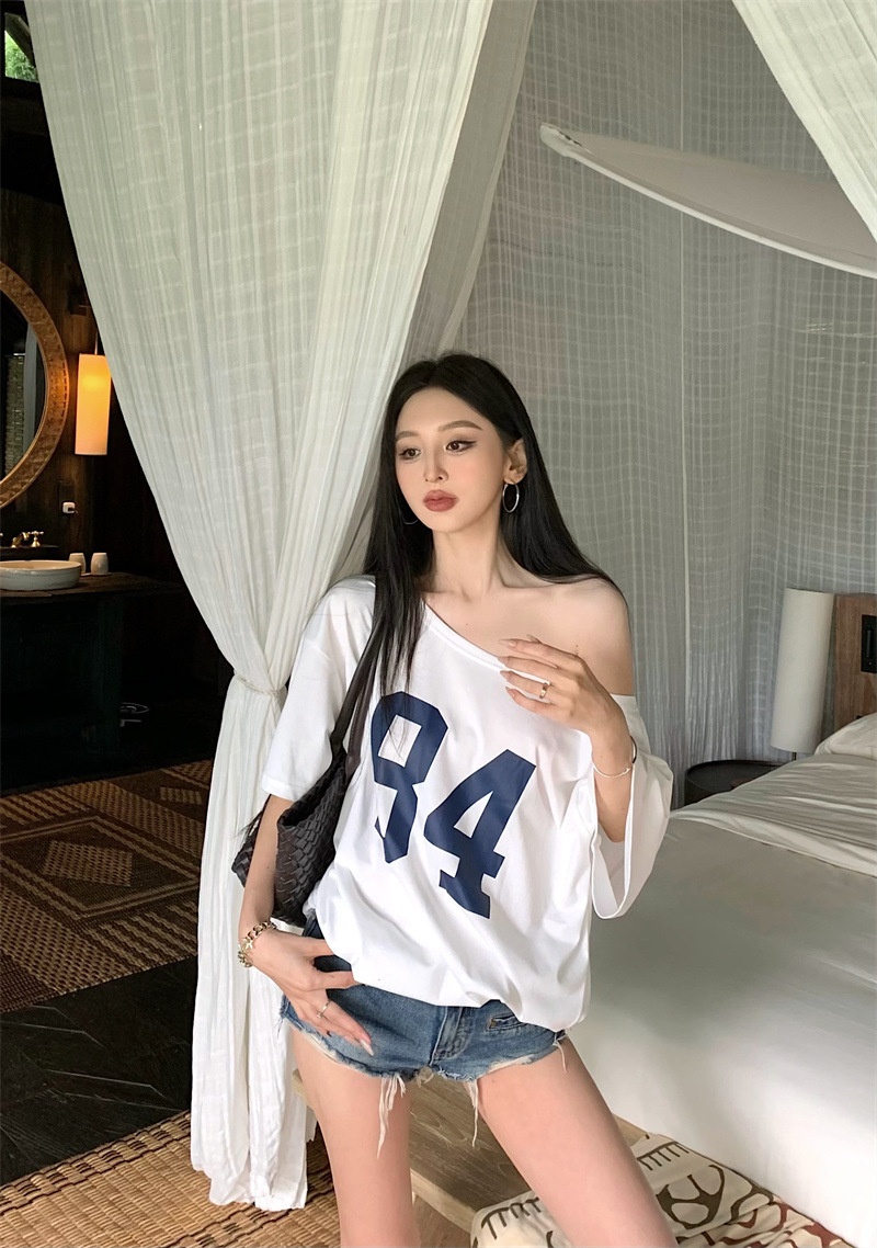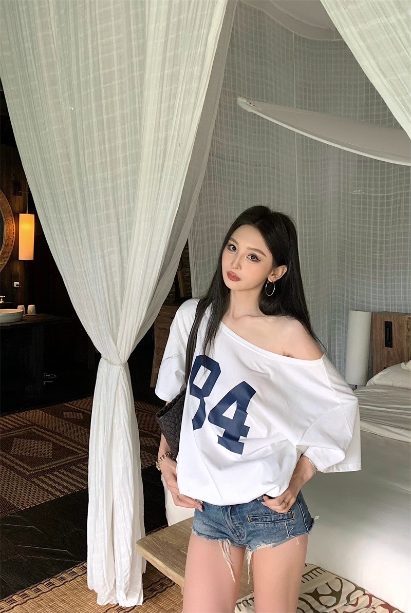斜肩短袖T恤女2025夏季新款宽松美式辣妹chic半袖百搭学生上衣潮