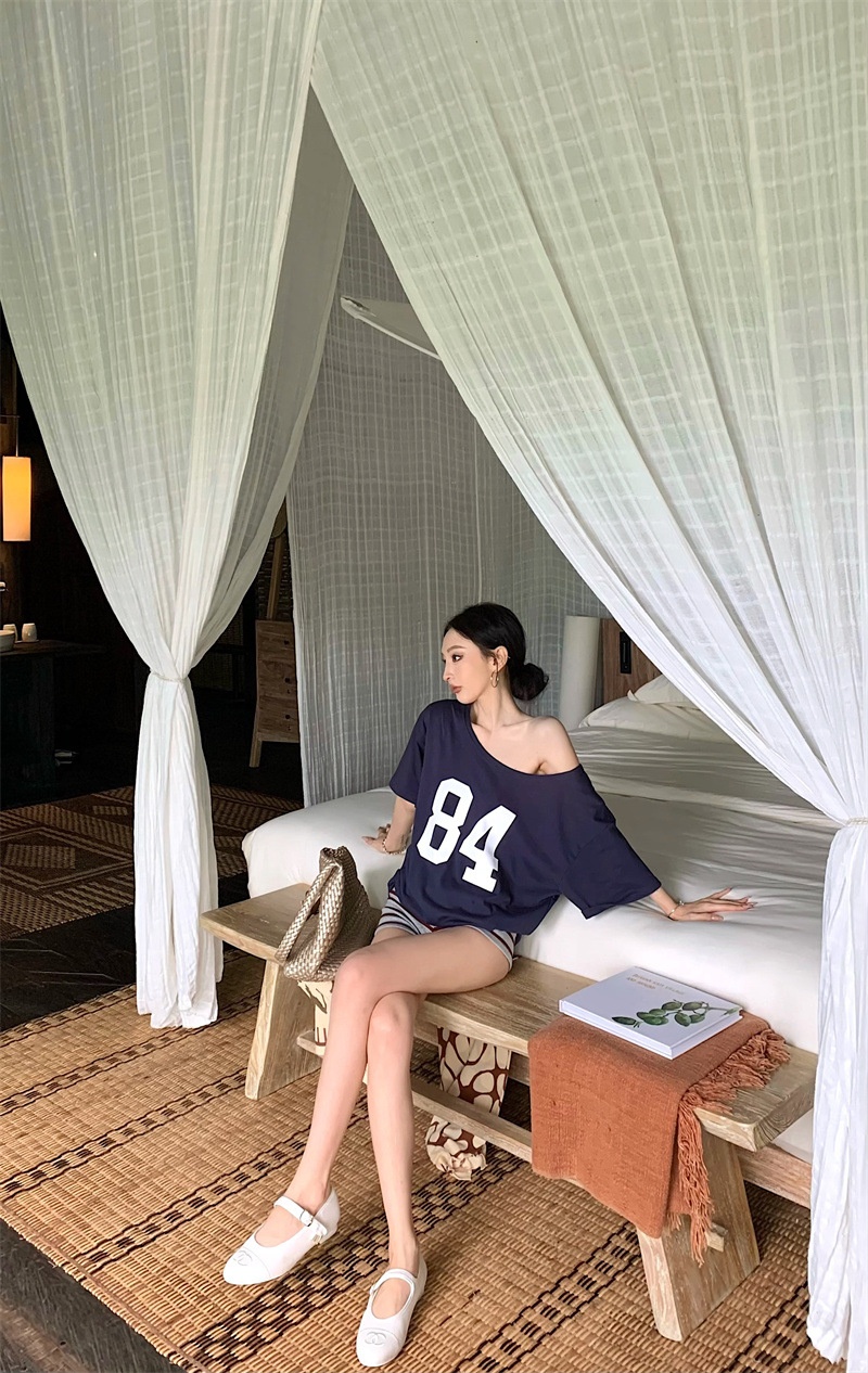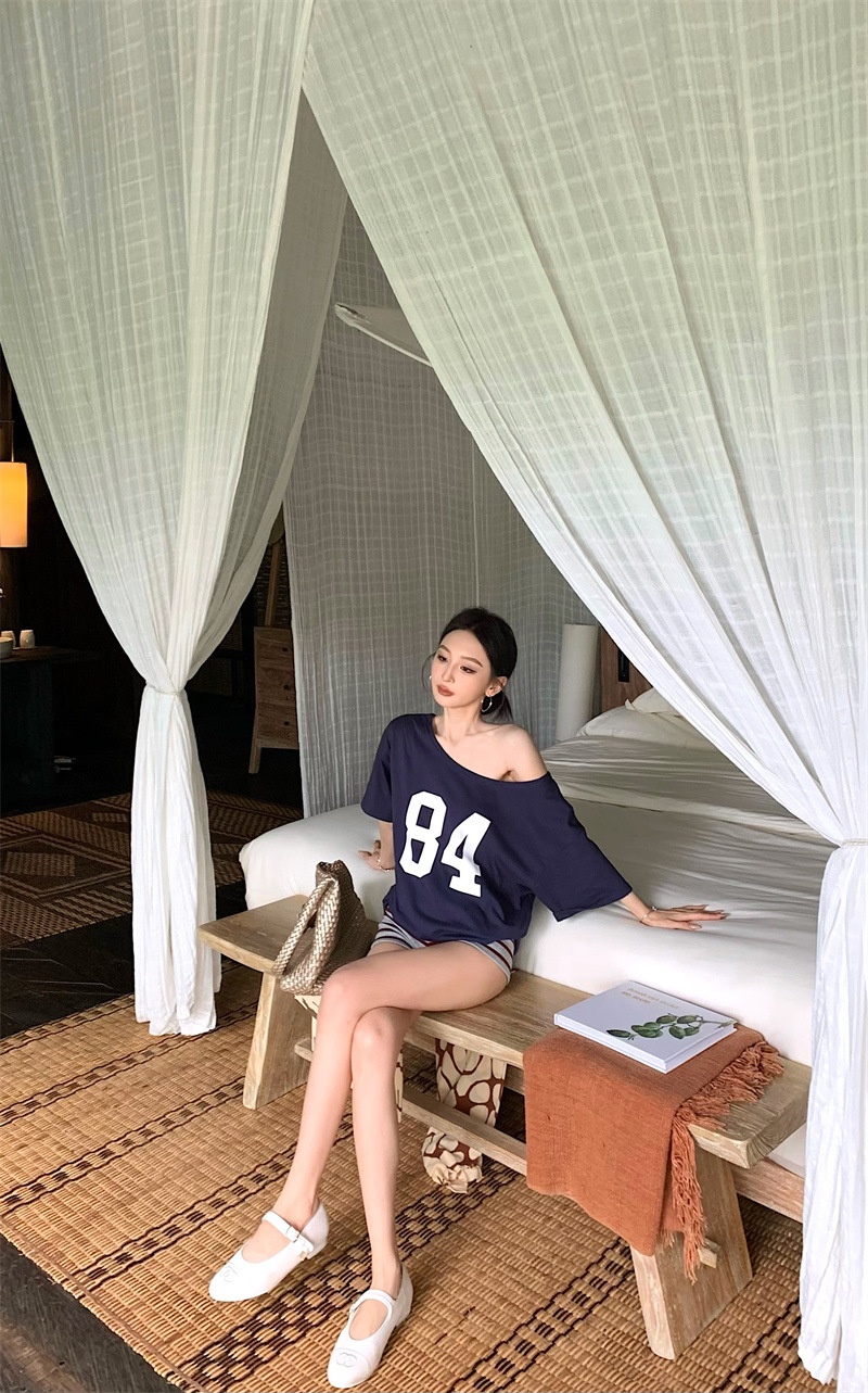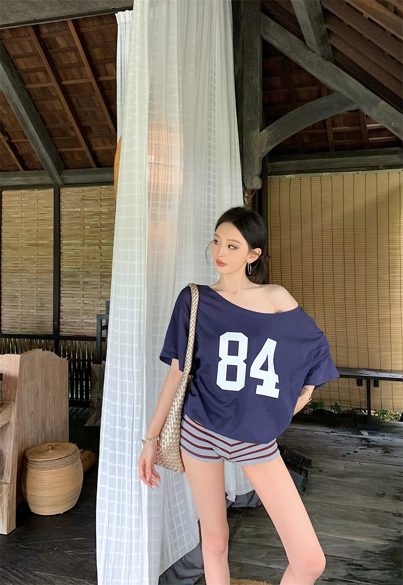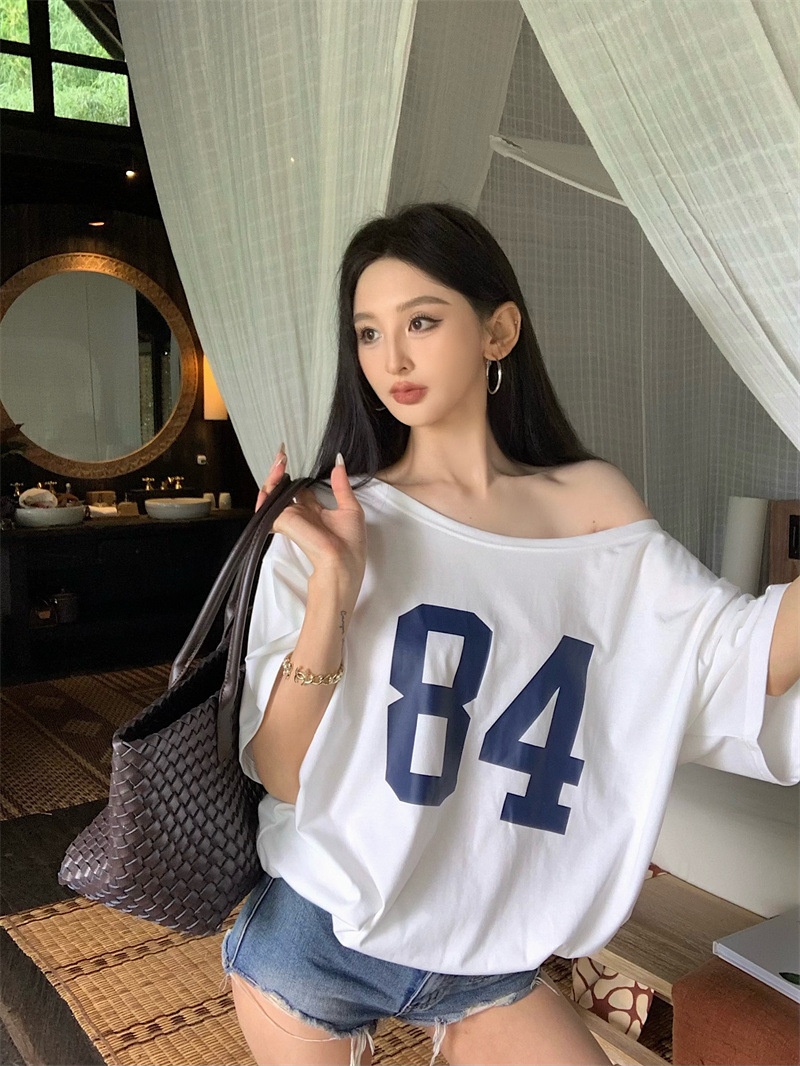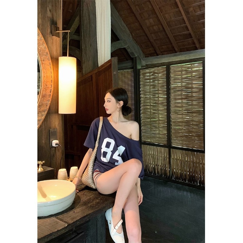 藏蓝色印花斜肩短袖T恤女夏季慵懒宽松美式辣妹chic半袖百搭上衣