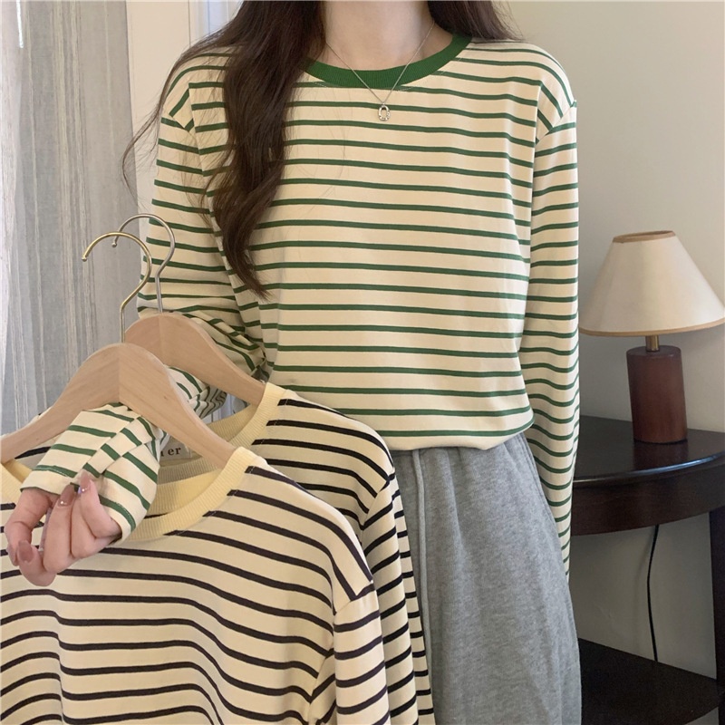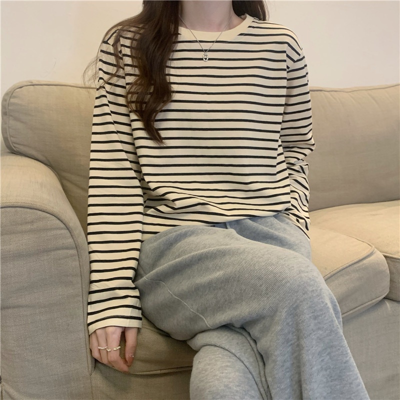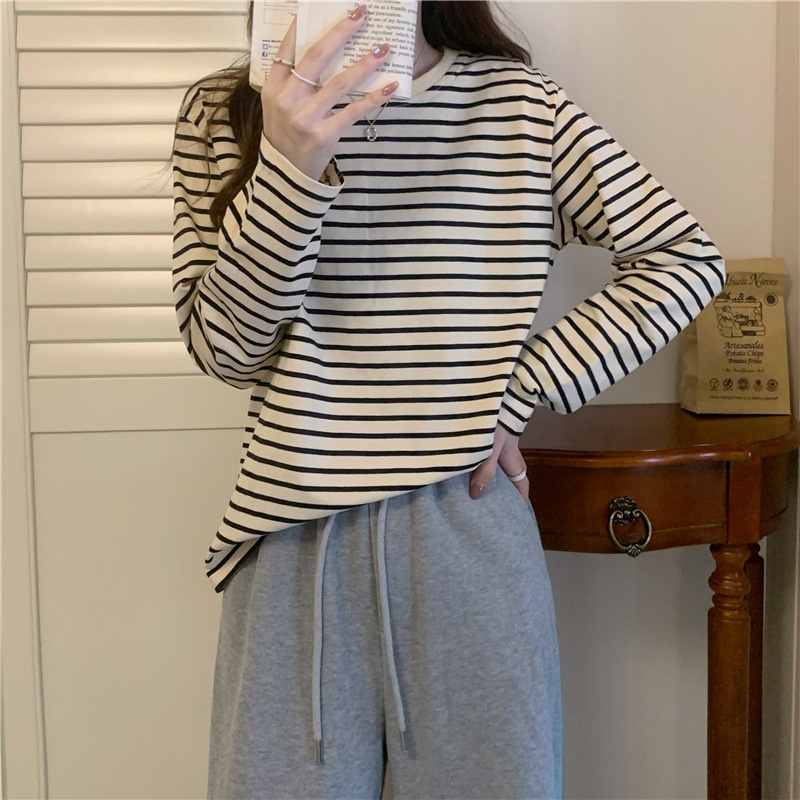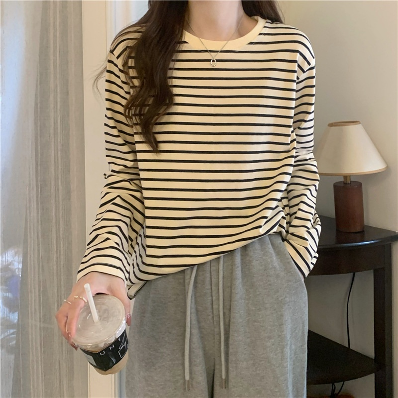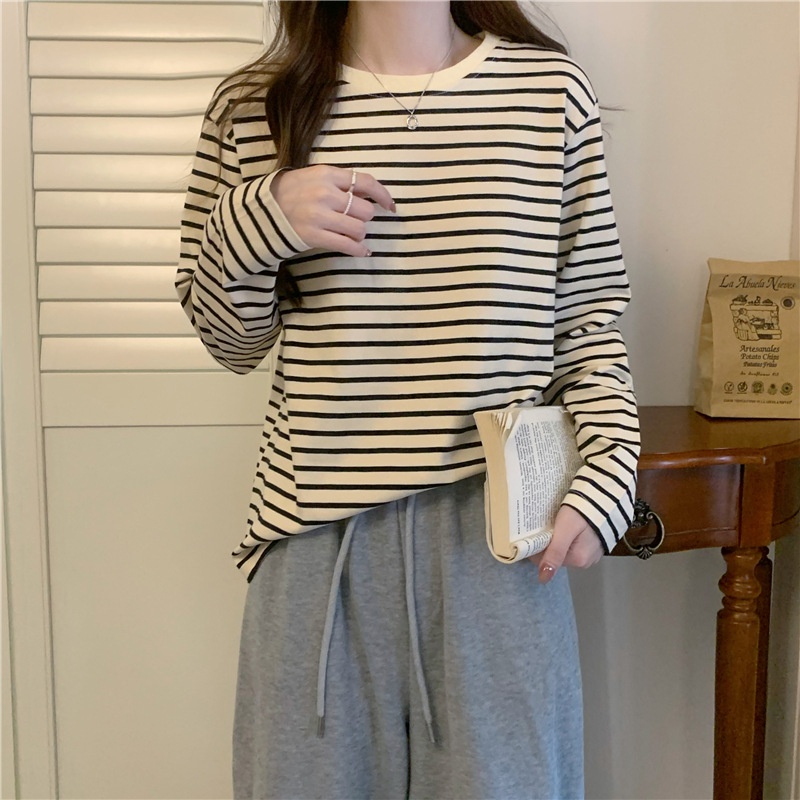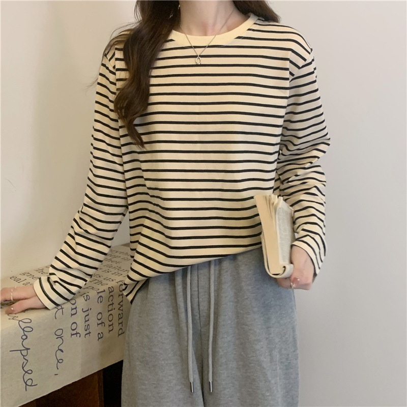 圆领长袖t恤女2025秋装新款宽松显瘦百搭条纹打底衫休闲内搭上衣