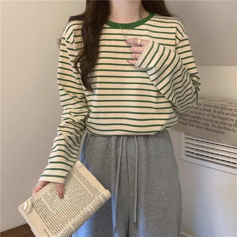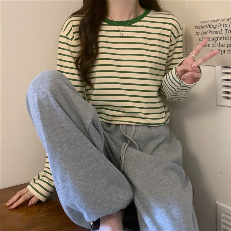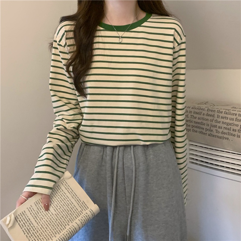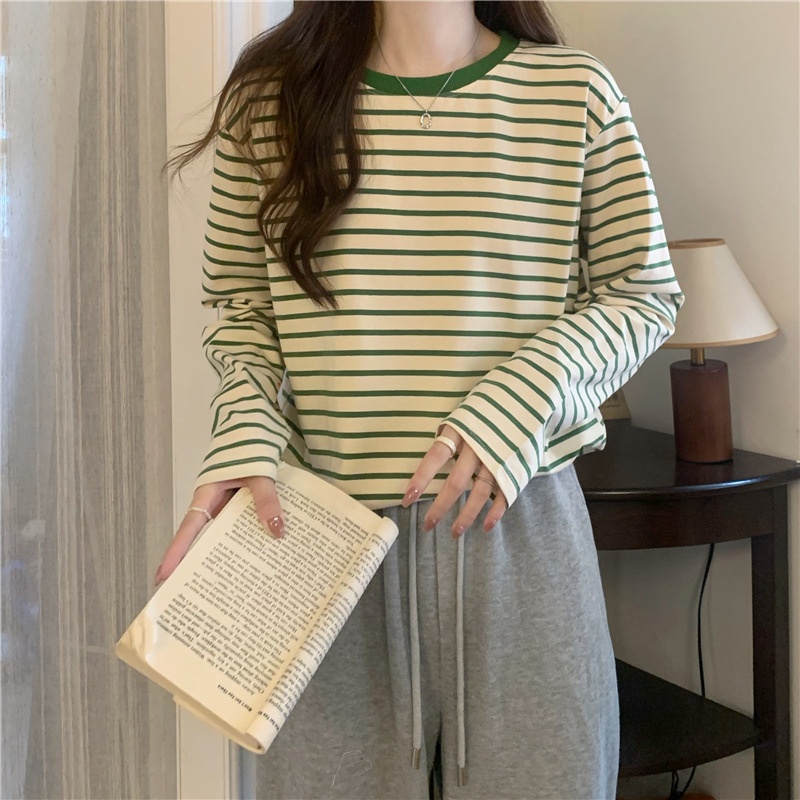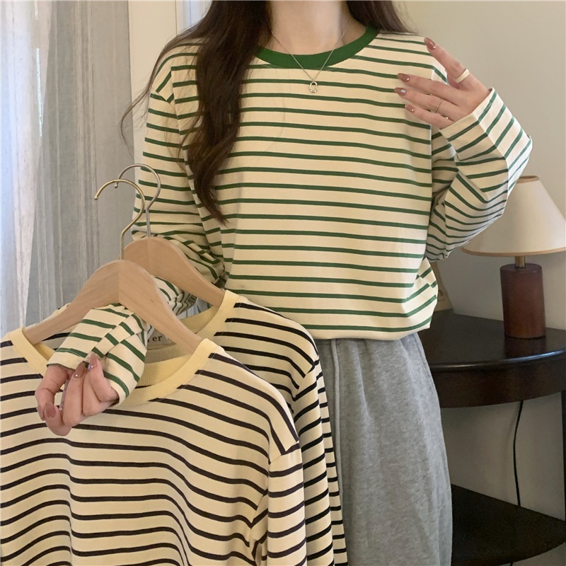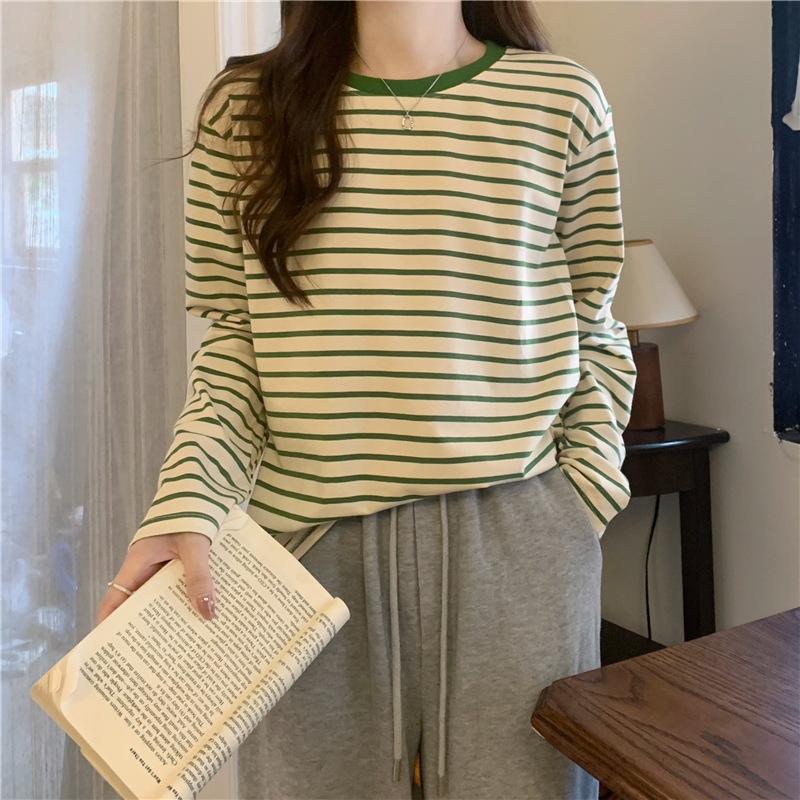 圆领长袖t恤女2025秋装新款宽松显瘦百搭条纹打底衫休闲内搭上衣
