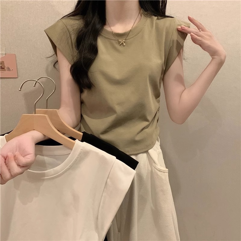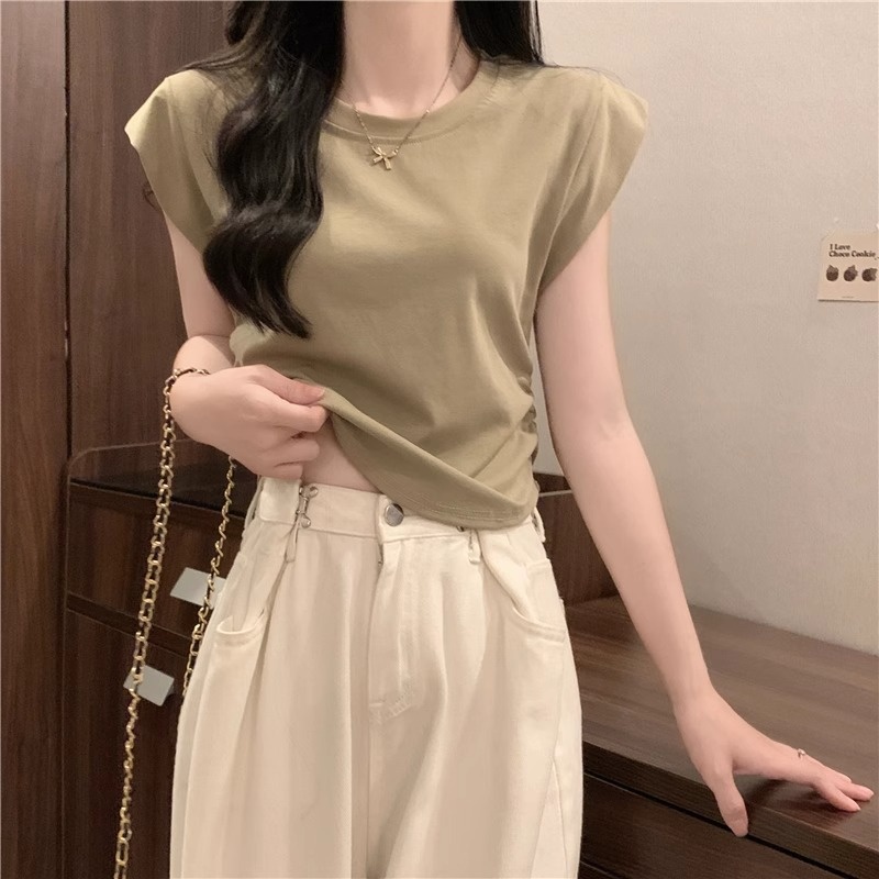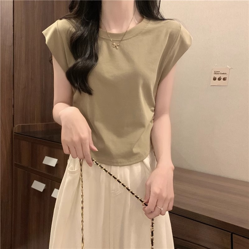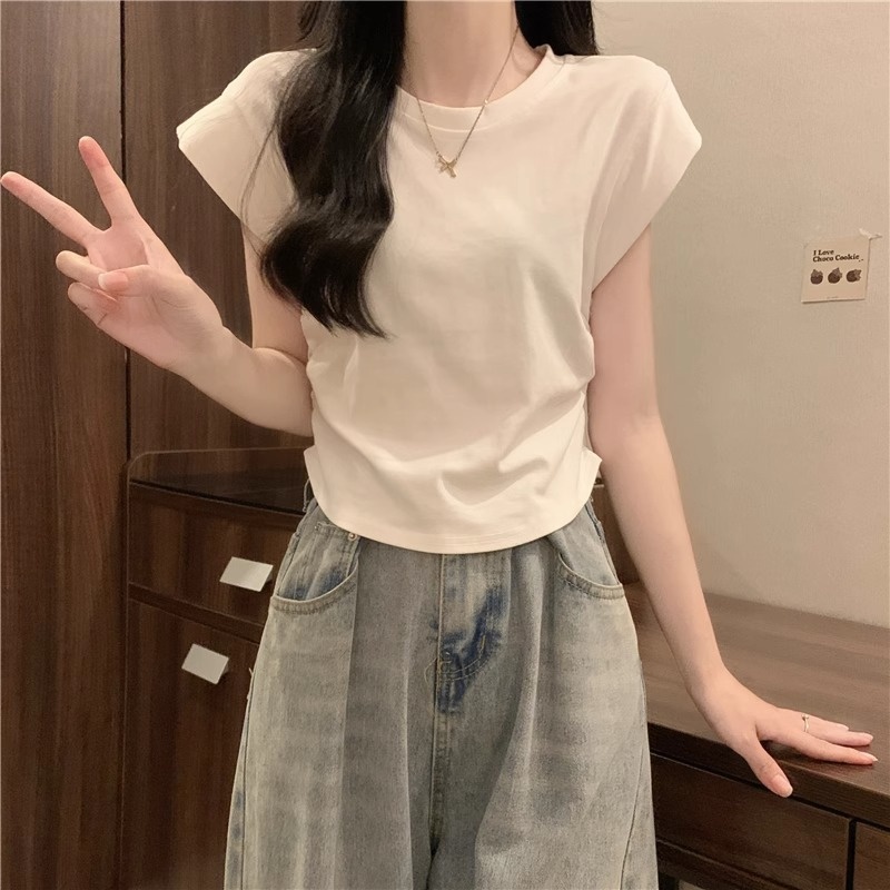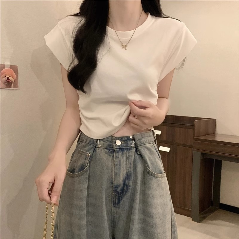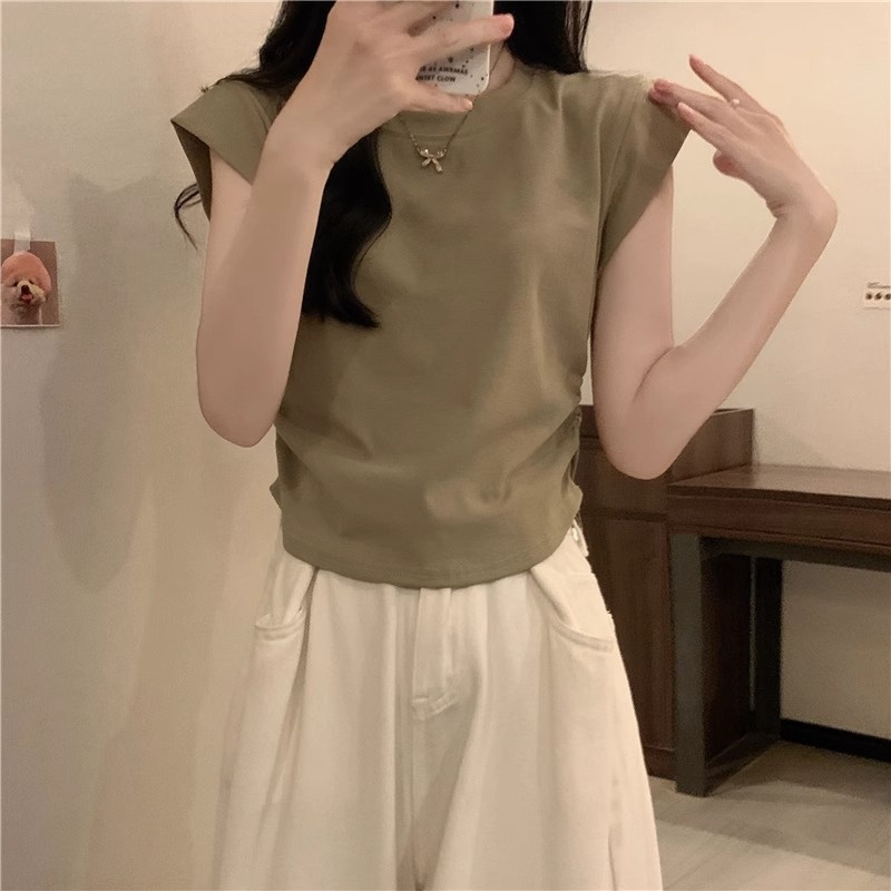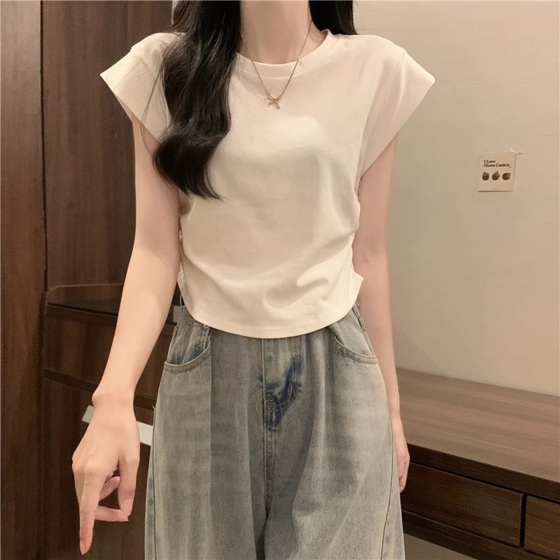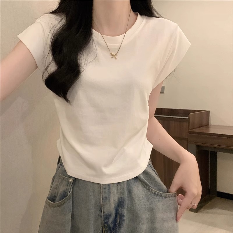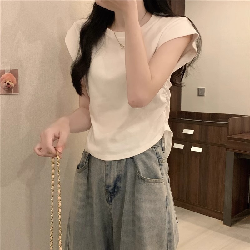 正肩修身显瘦短袖t恤女2025夏季设计感小飞袖抽褶收腰短款上衣潮
