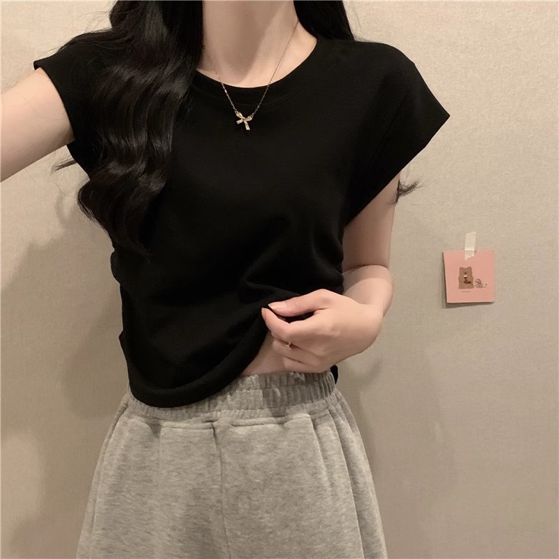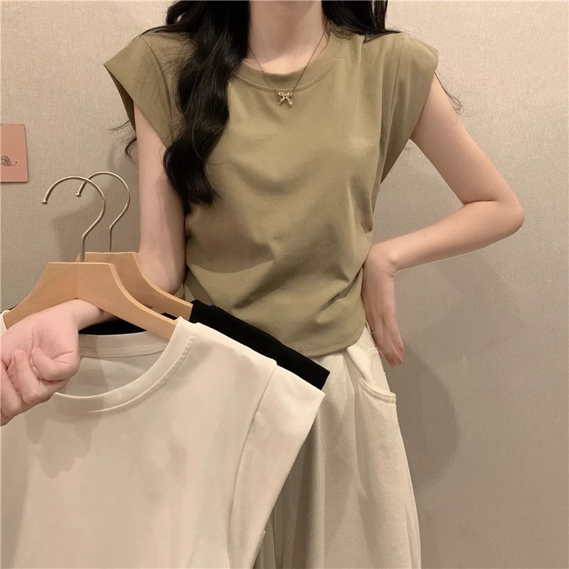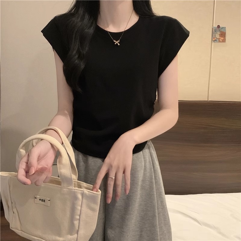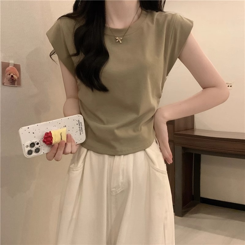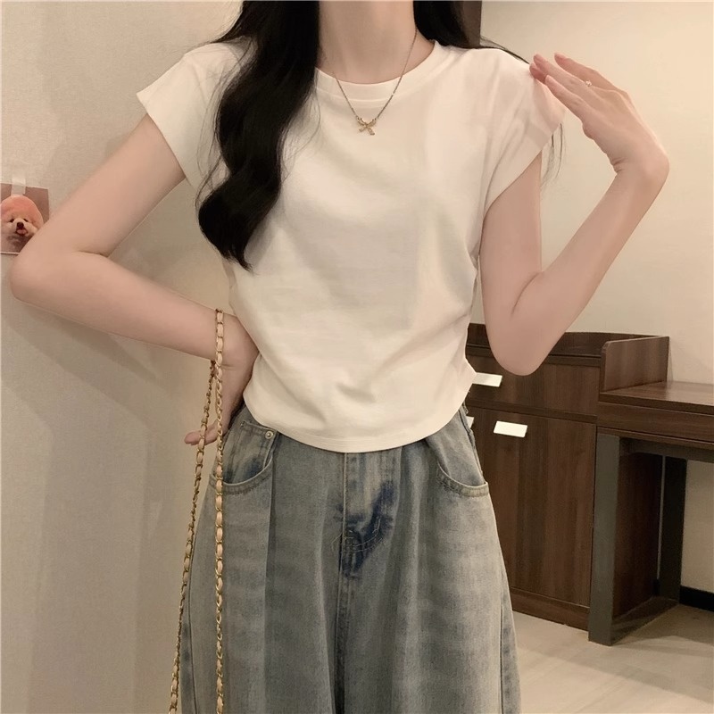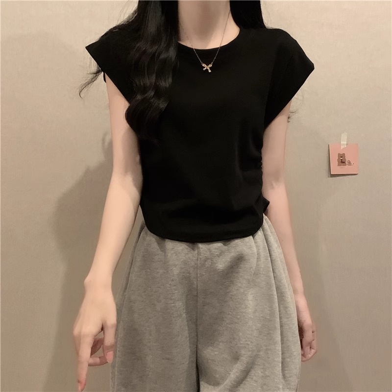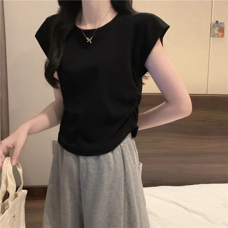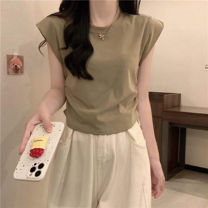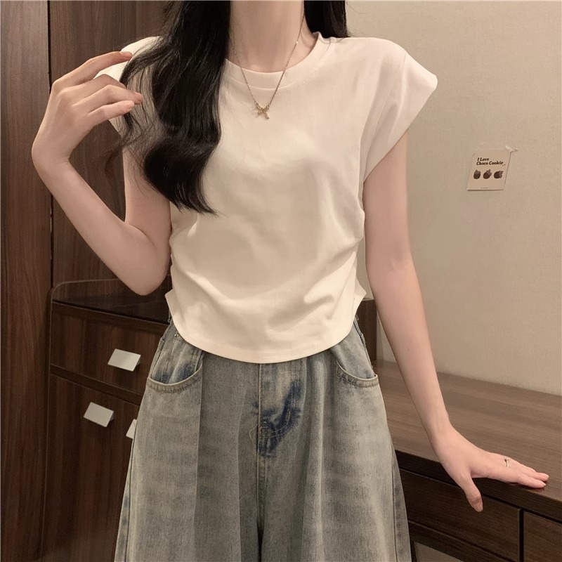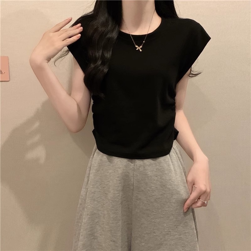 正肩修身显瘦短袖t恤女2025夏季设计感小飞袖抽褶收腰短款上衣潮