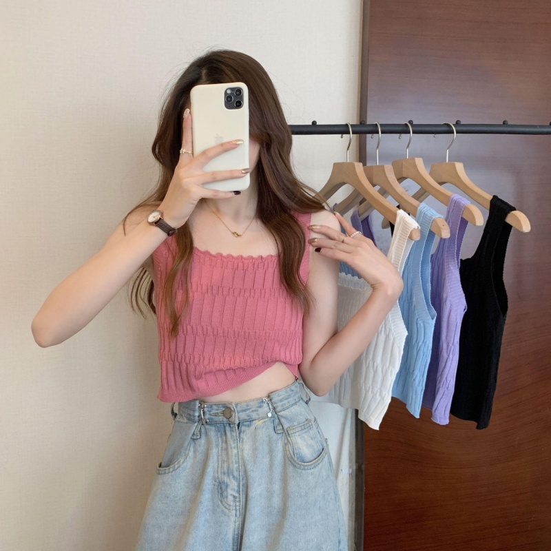 卷边修身短款针织吊带背心女夏季新款内搭修身露脐慵懒风外穿上衣