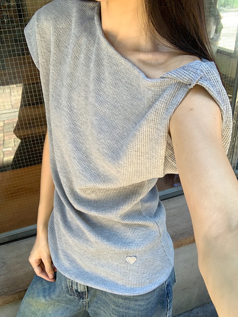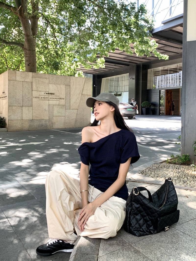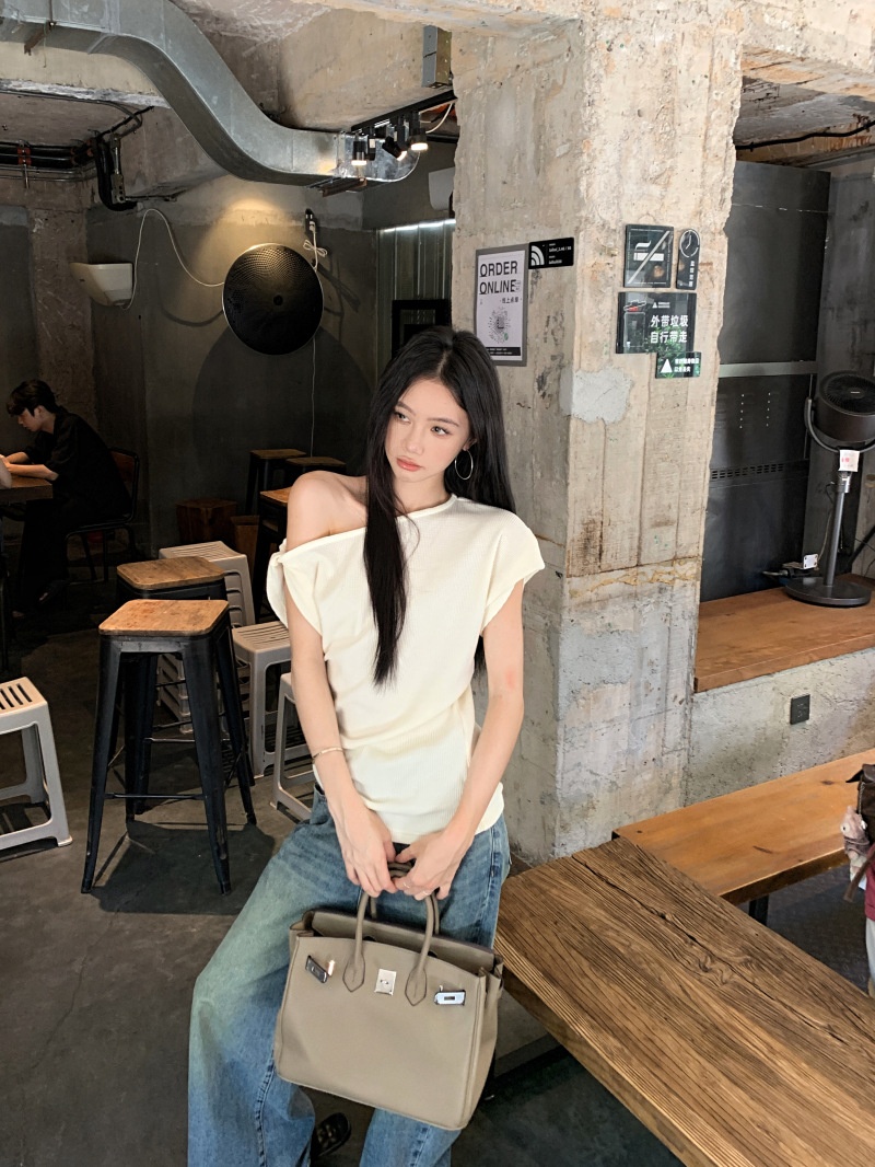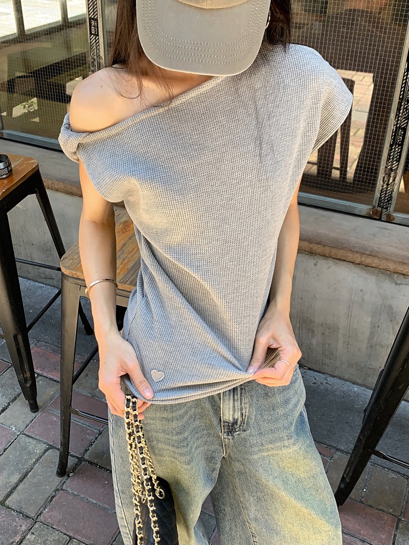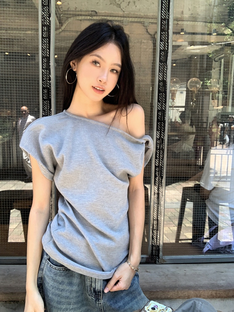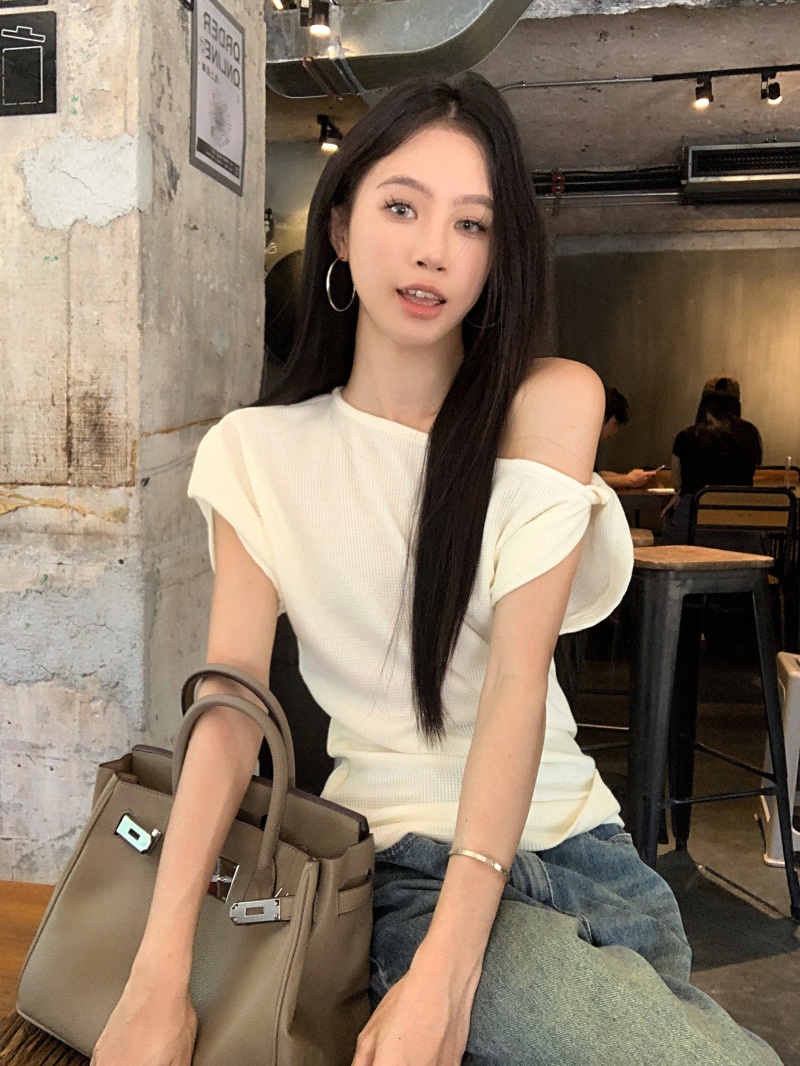 华夫格斜肩短袖修身T恤女夏季休闲显瘦气质不规则百搭简约小上衣