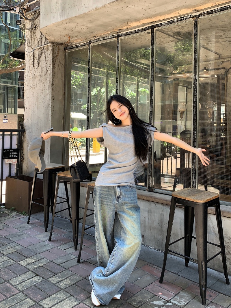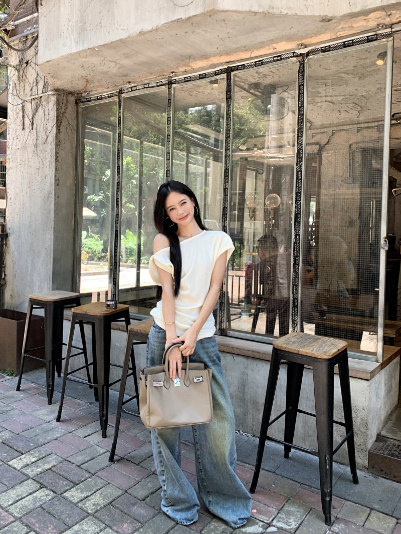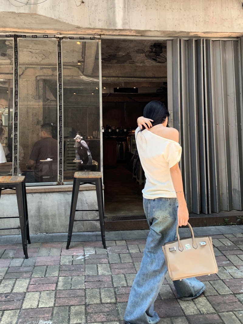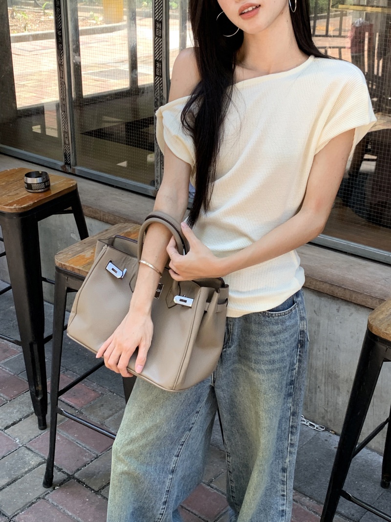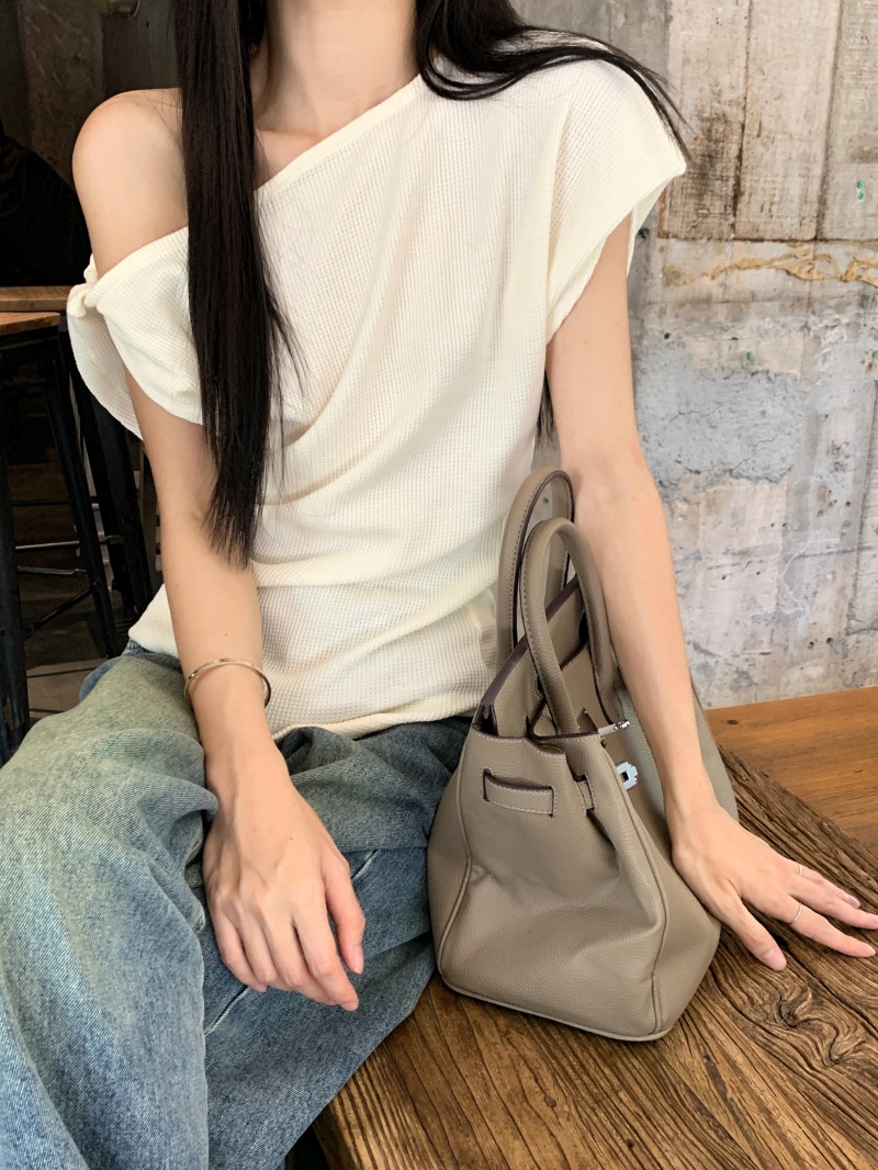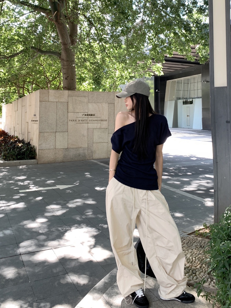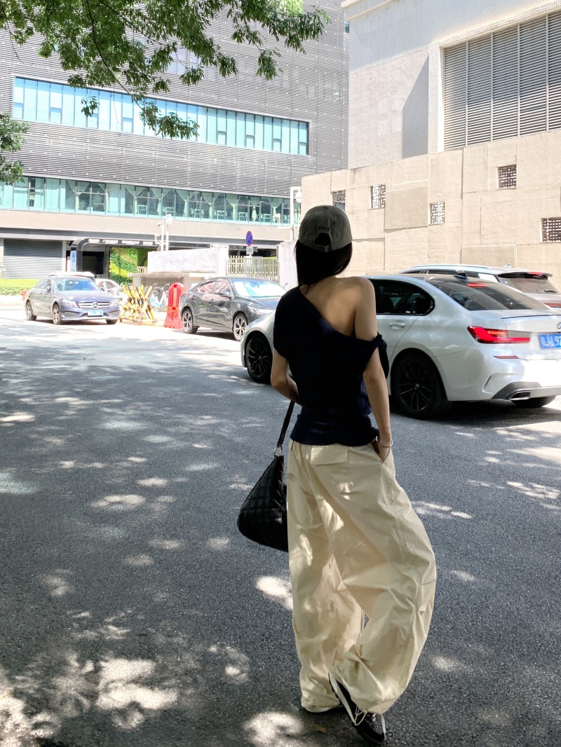 华夫格斜肩短袖修身T恤女夏季休闲显瘦气质不规则百搭简约小上衣