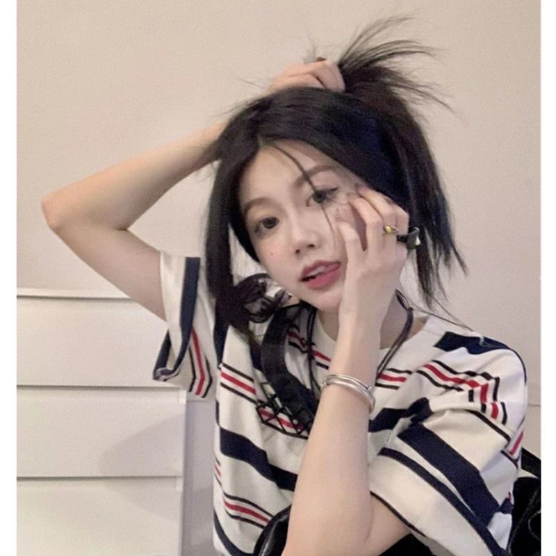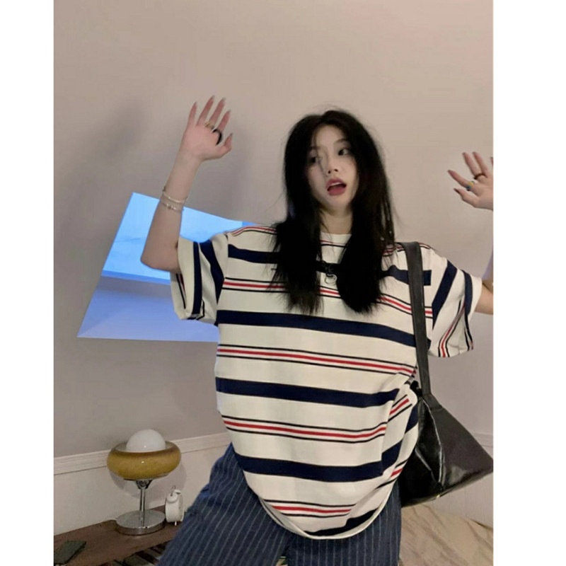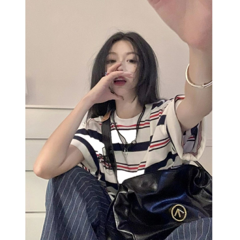 美式条纹短袖t恤女2025新款夏季宽松慵懒风半袖学生百搭上衣体恤