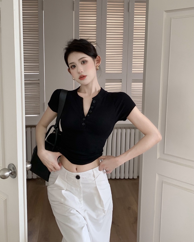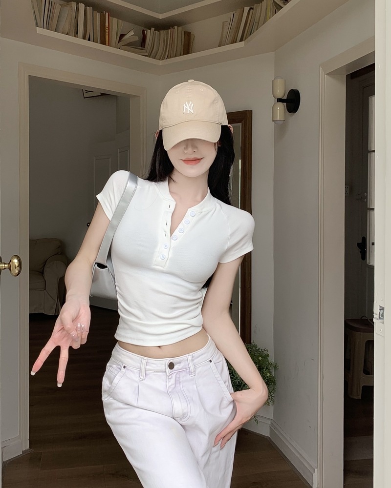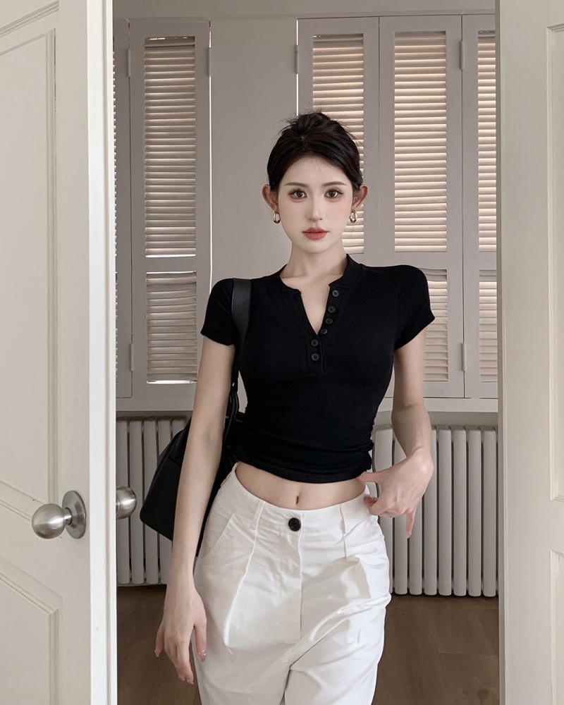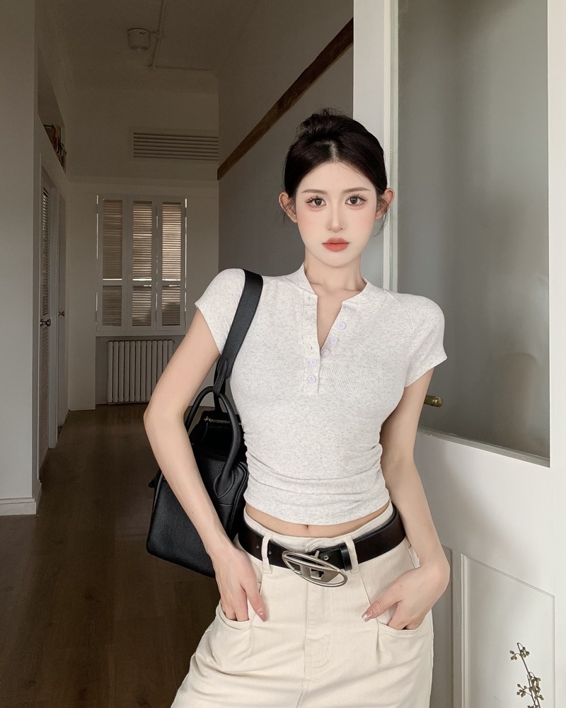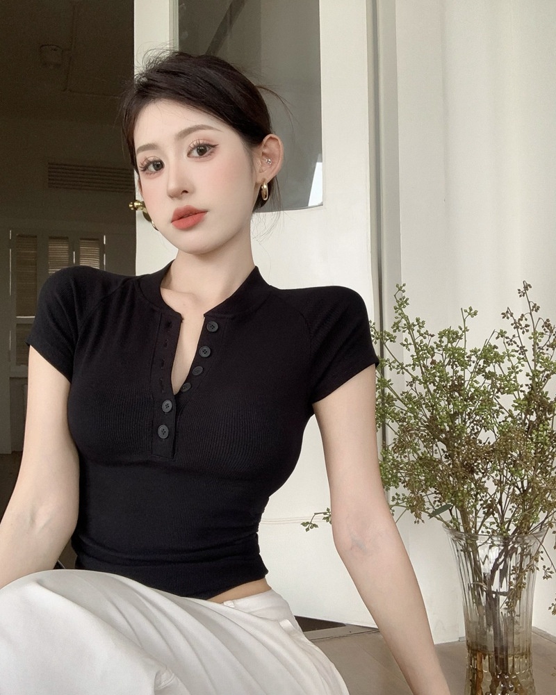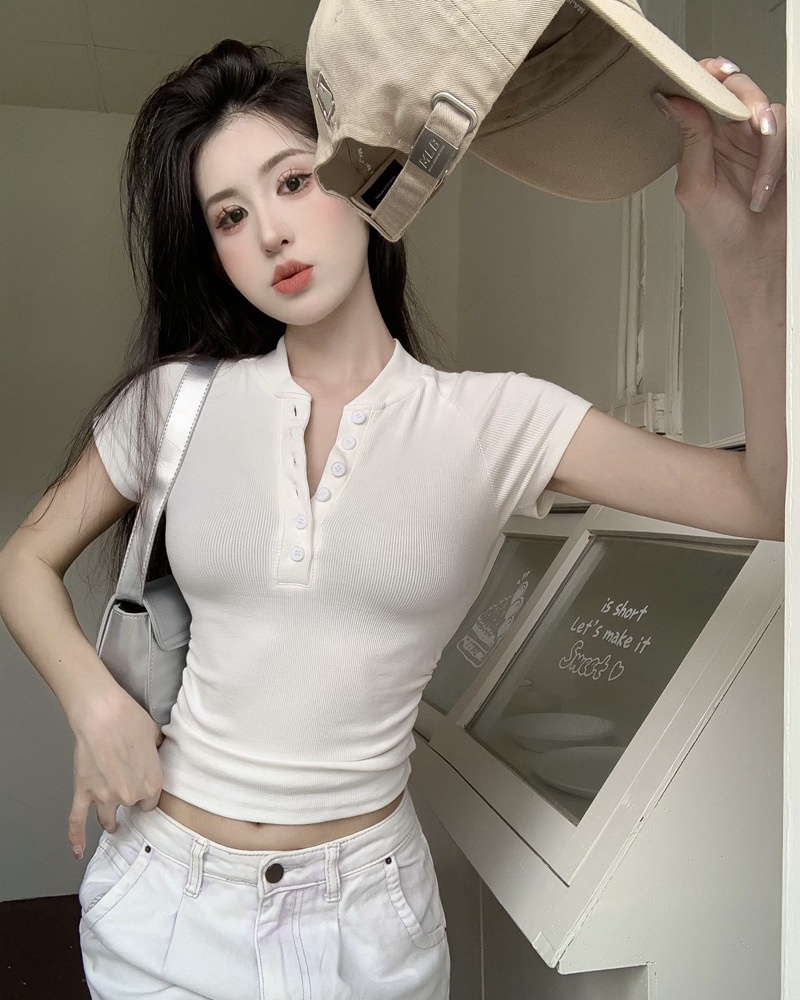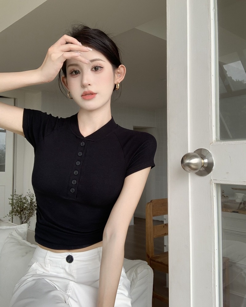 2025夏季新款美式纽扣半开领短袖T恤女上衣修身褶皱短款打底衫潮