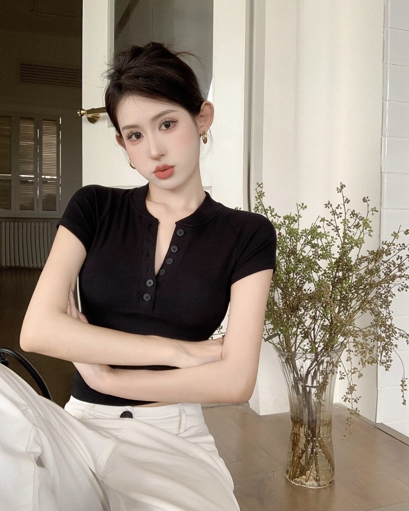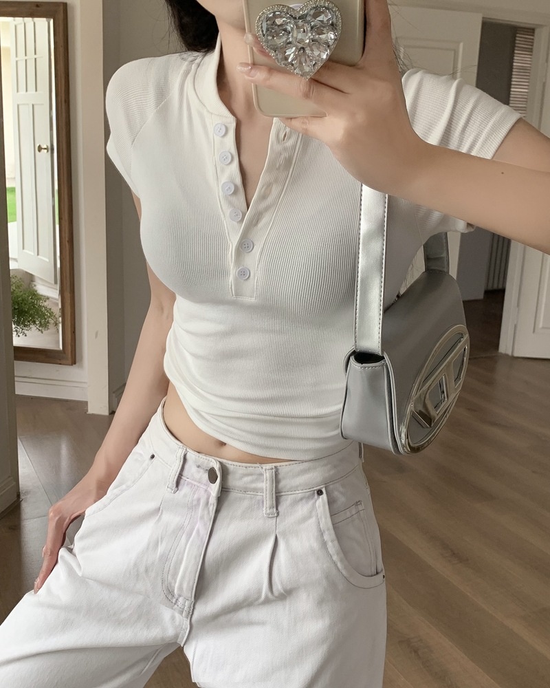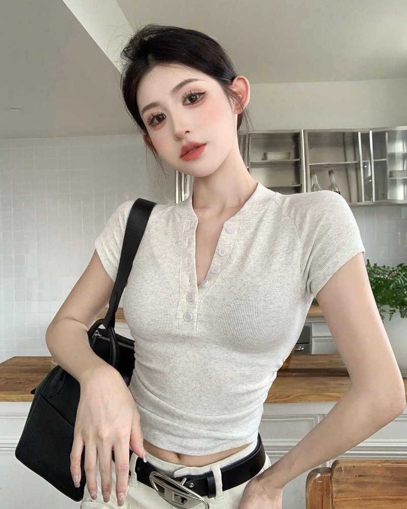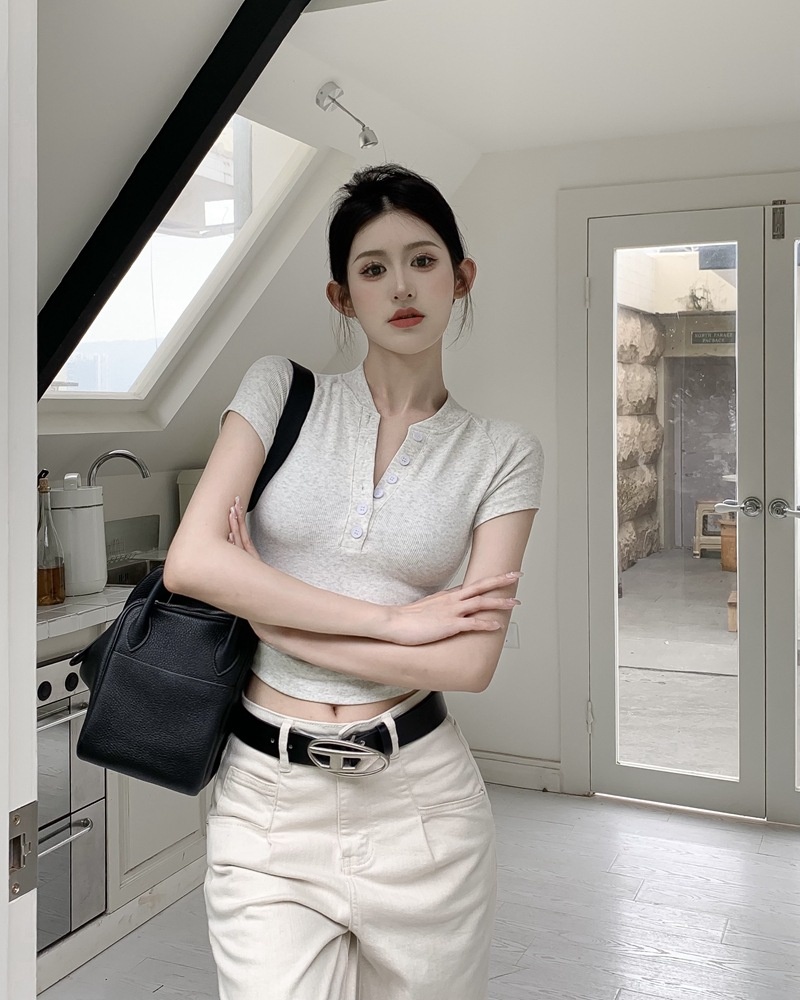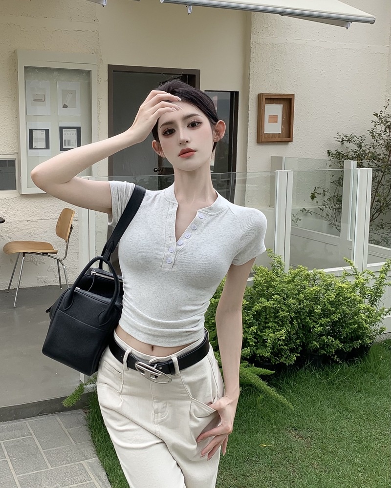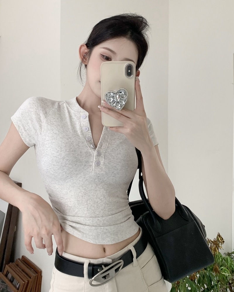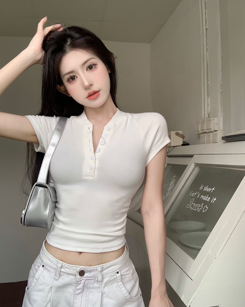 2025夏季新款美式纽扣半开领短袖T恤女上衣修身褶皱短款打底衫潮