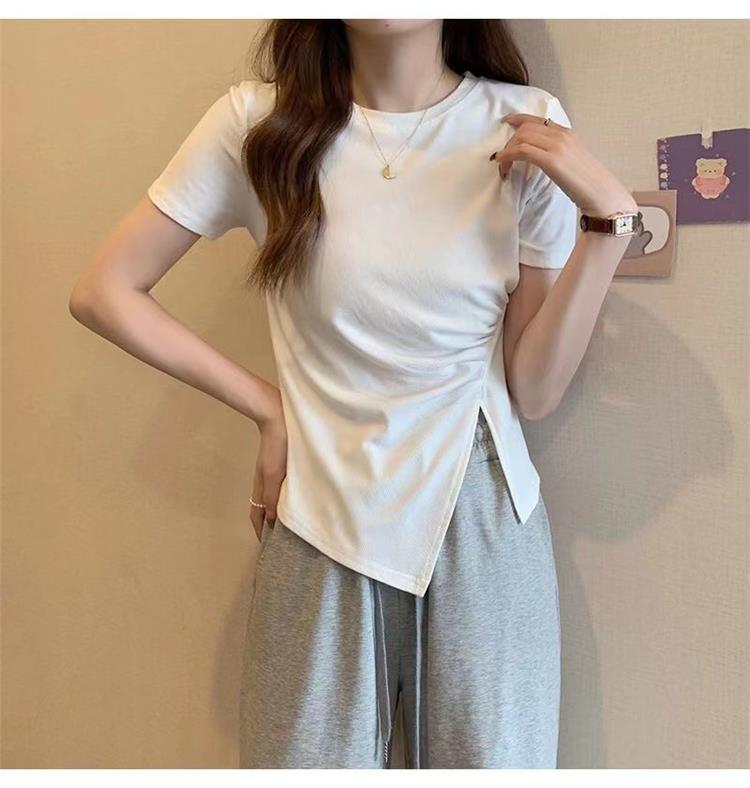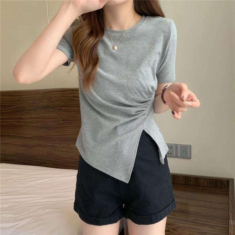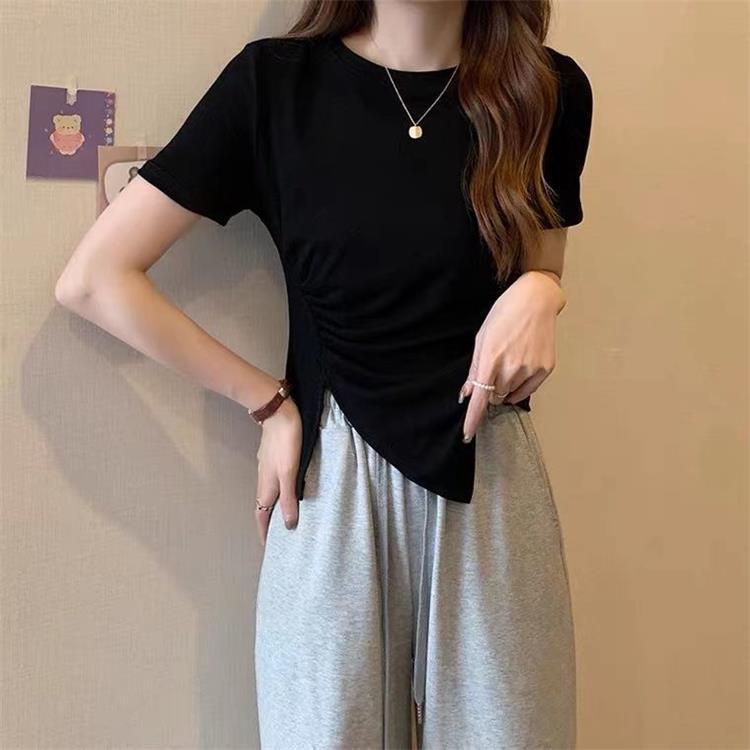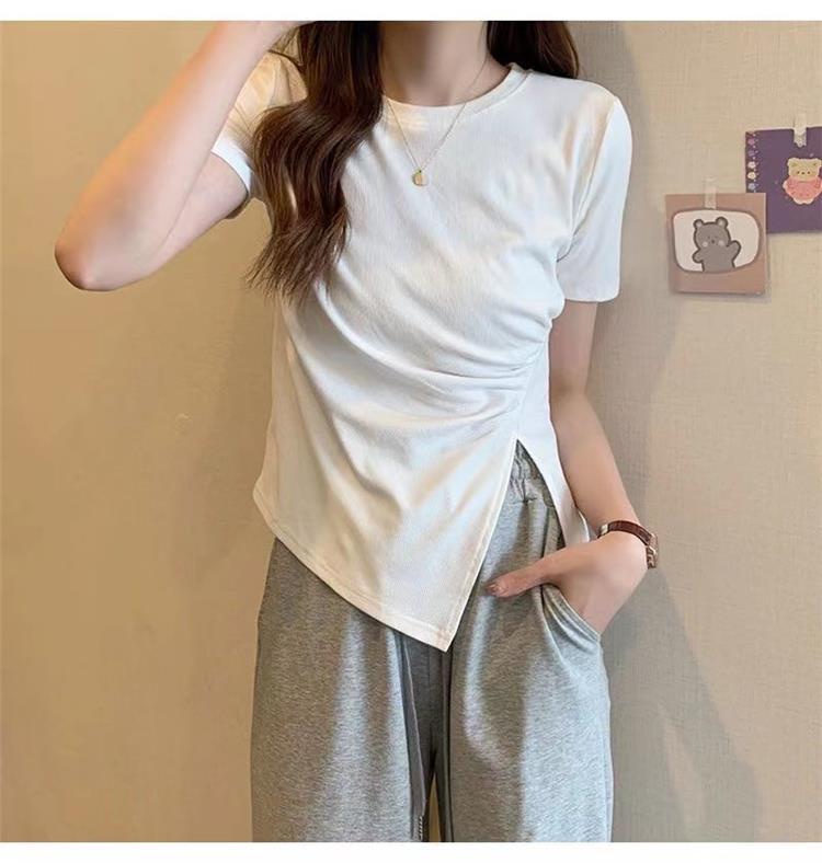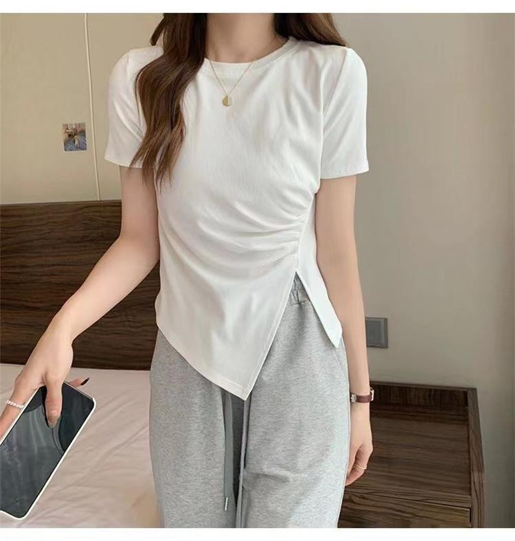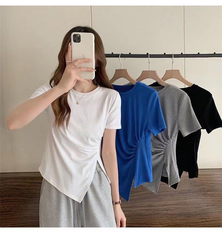 不规则t恤女2024年夏季新款韩版收腰显瘦侧开叉法式拼接体恤上衣