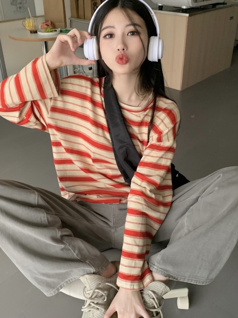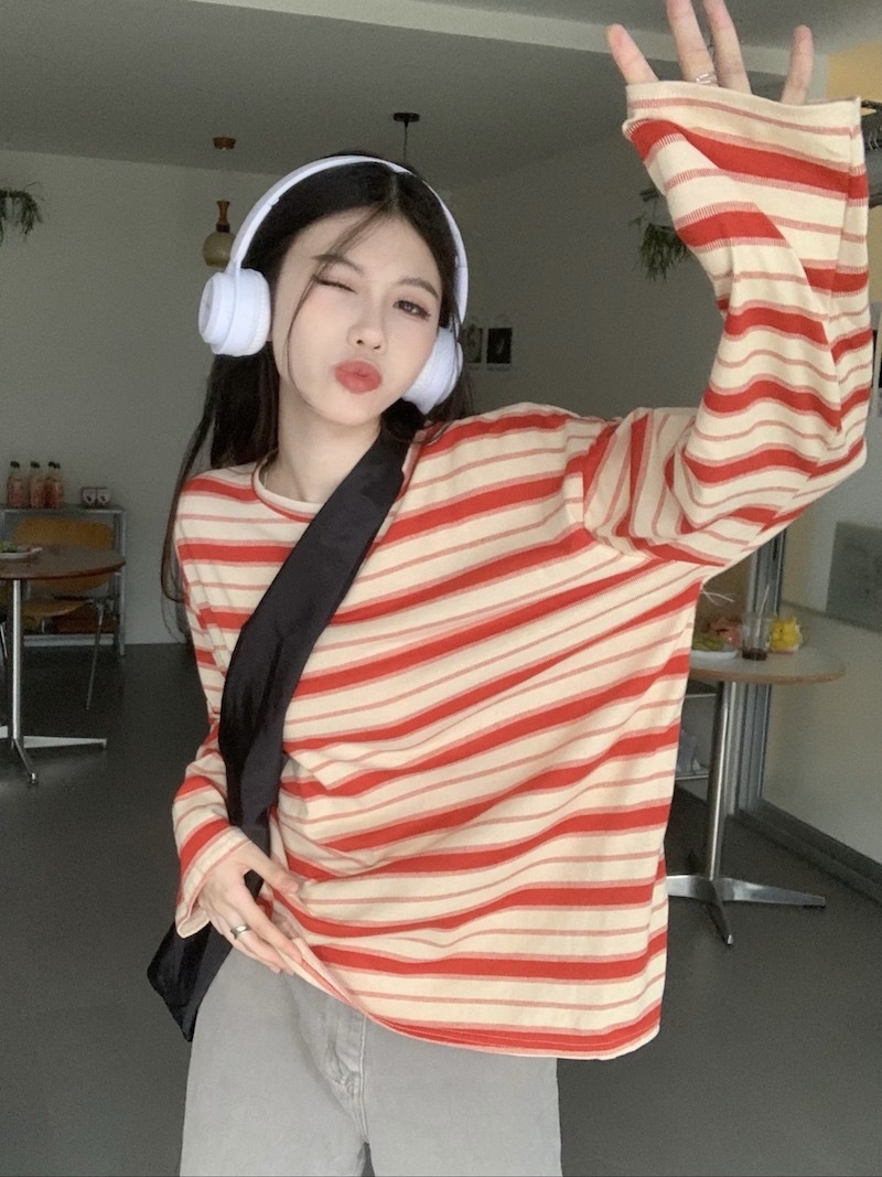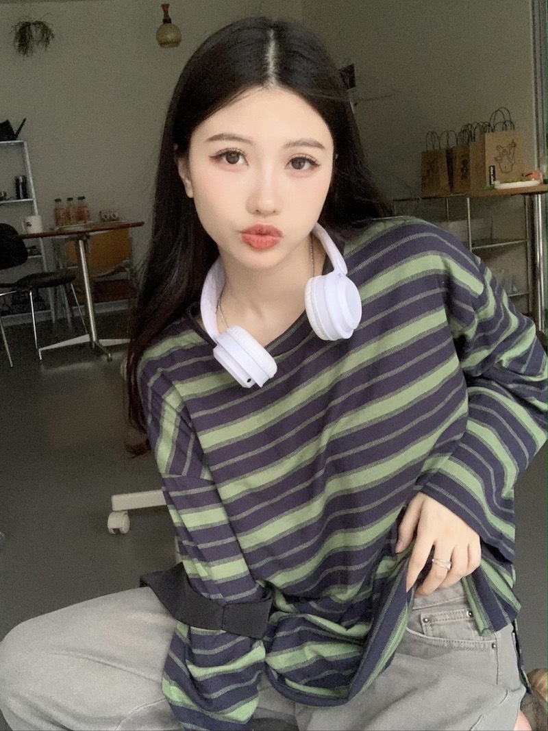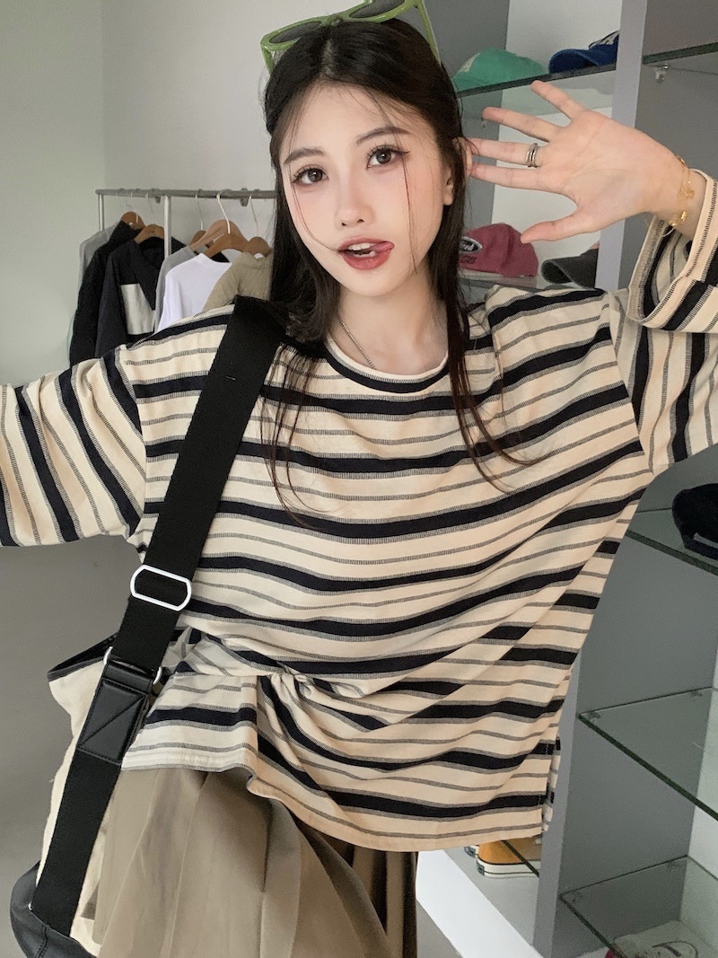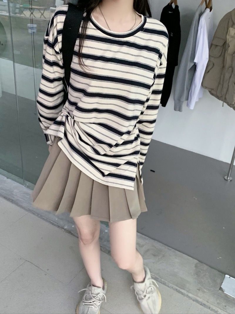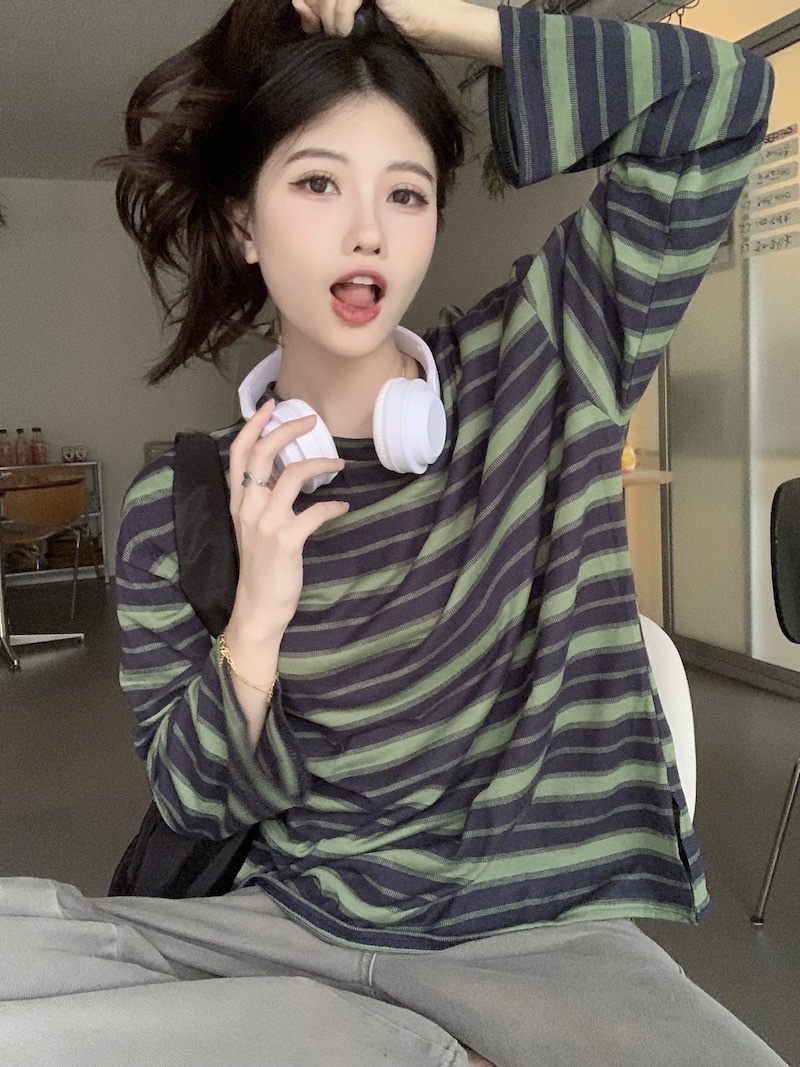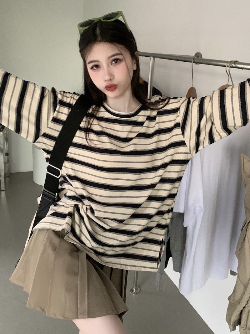 圆领条纹长袖t恤女2025秋季新款设计感宽松显瘦休闲学生开叉上衣