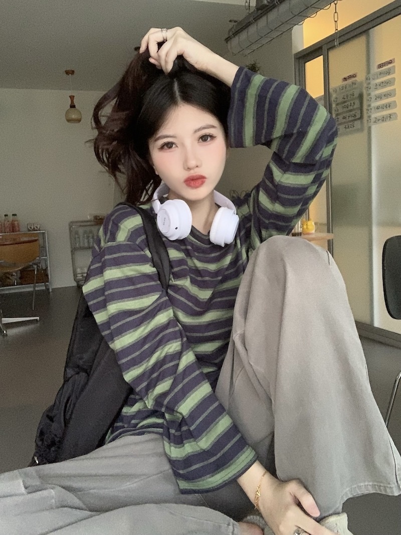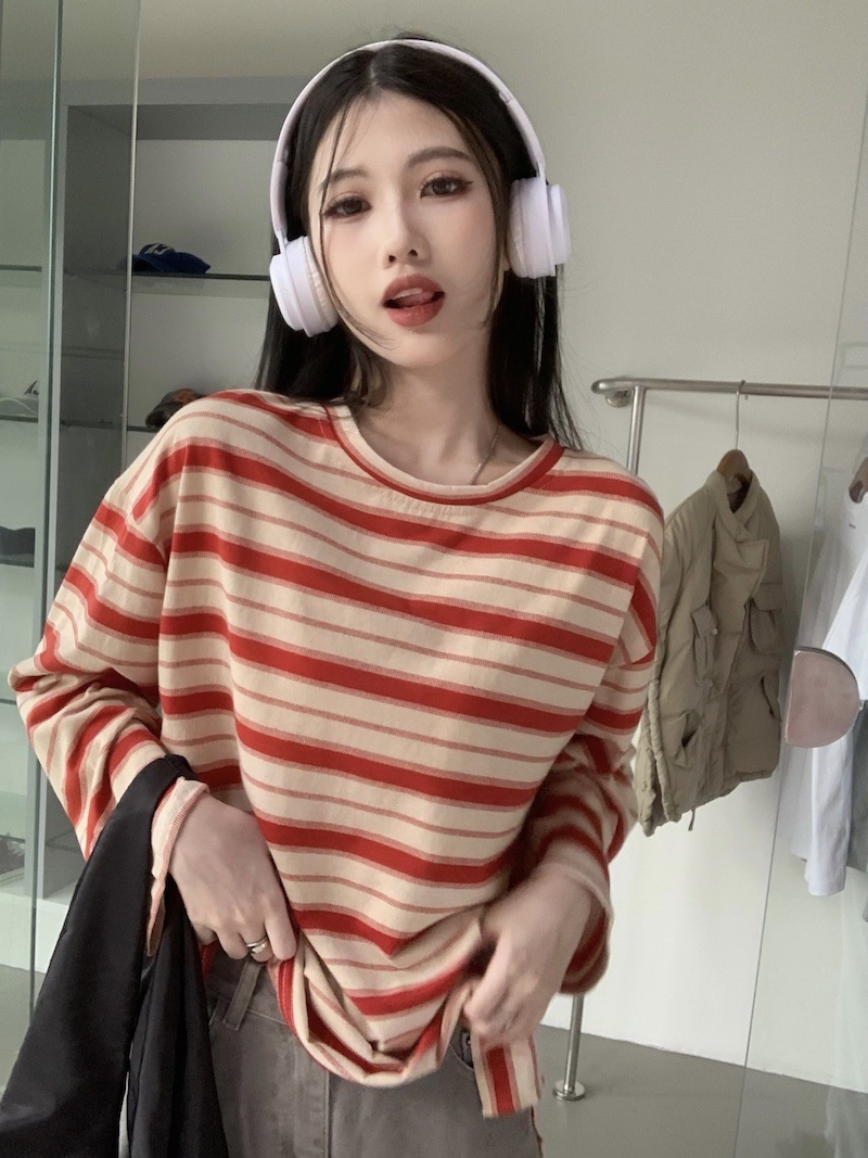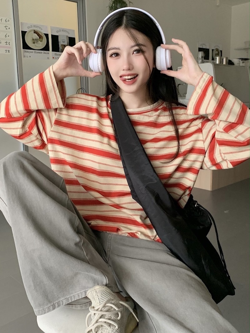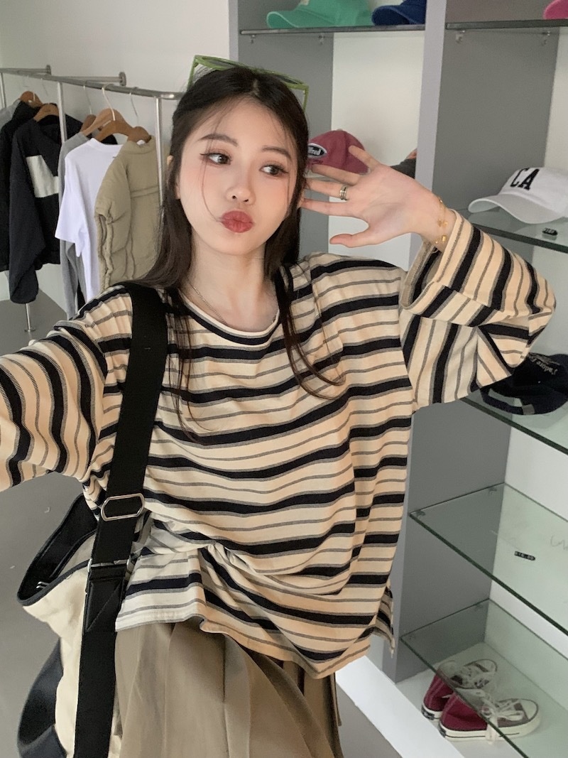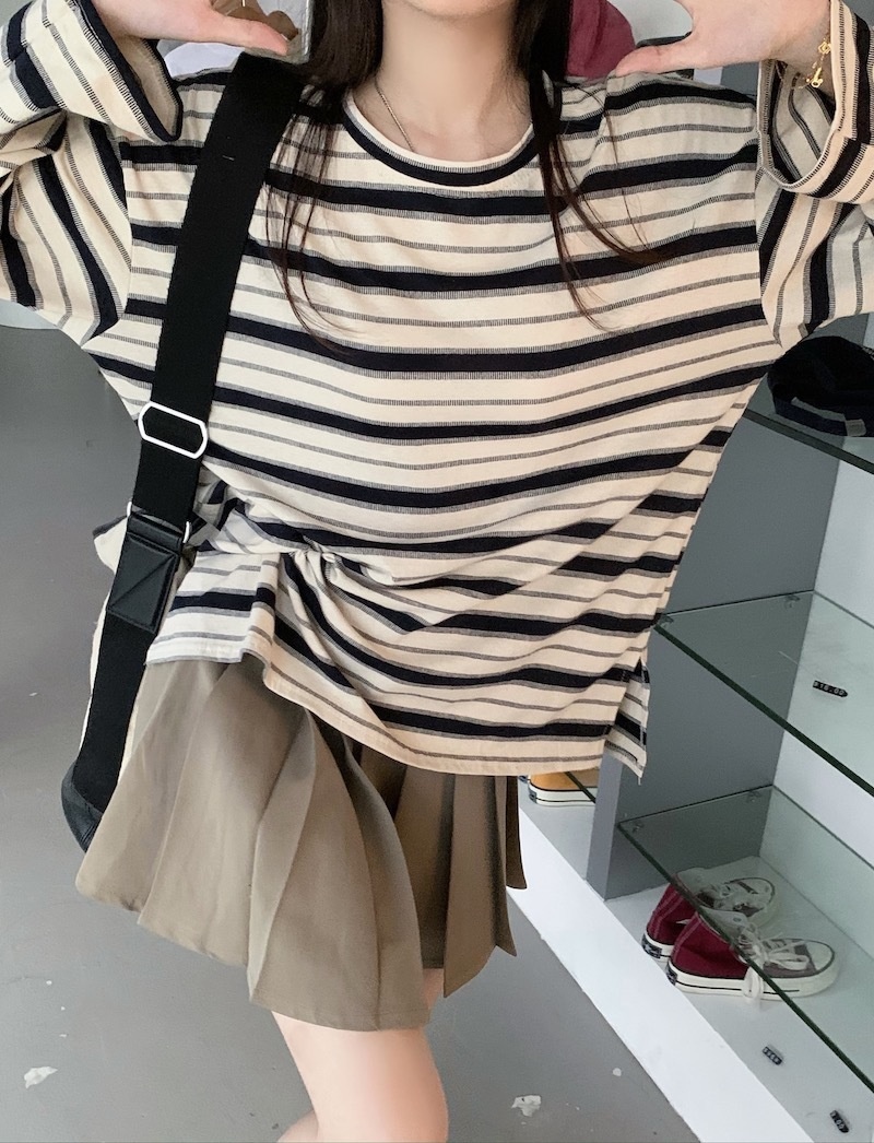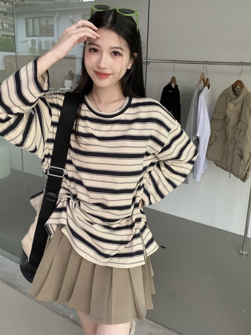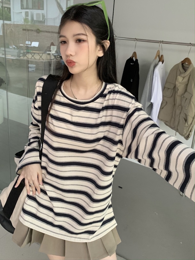 圆领条纹长袖t恤女2025秋季新款设计感宽松显瘦休闲学生开叉上衣