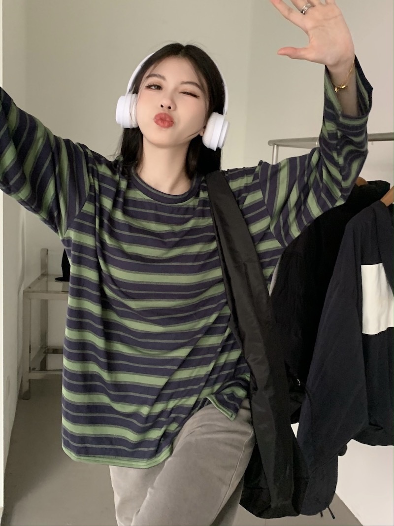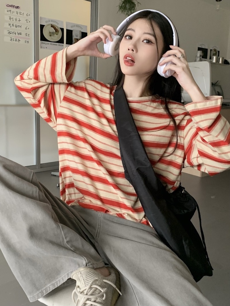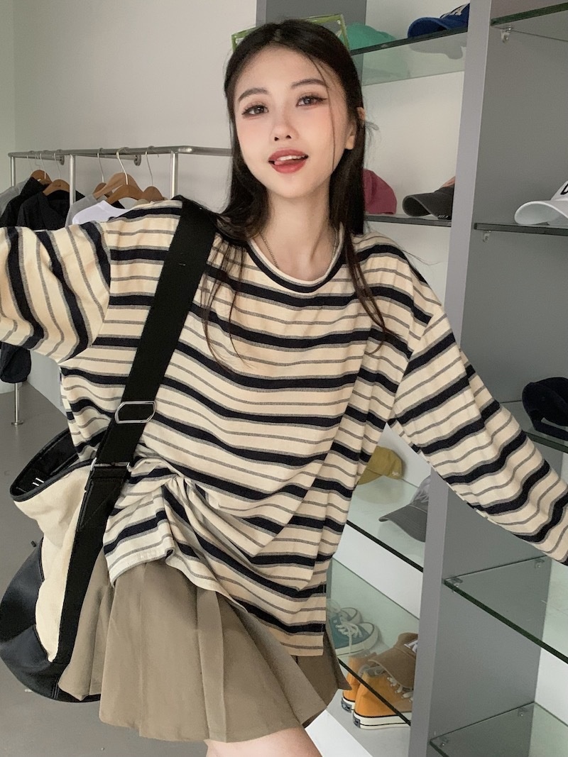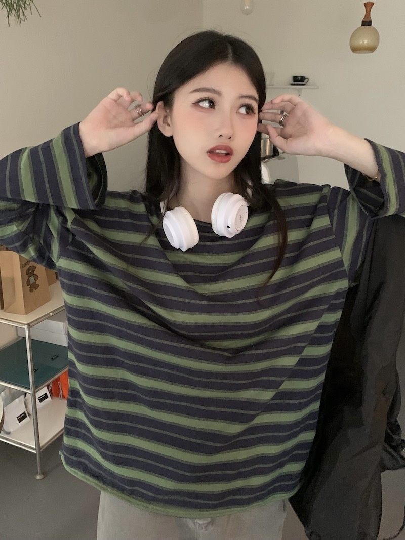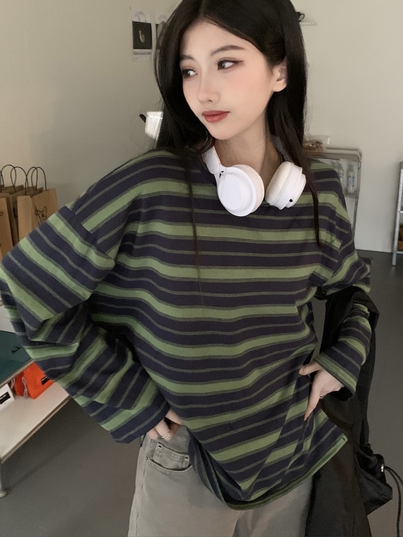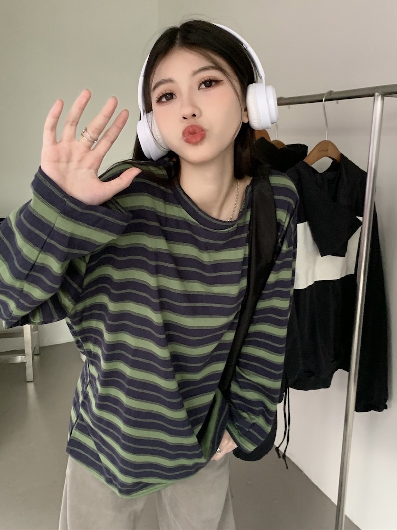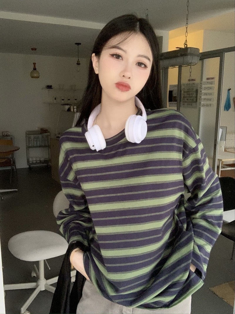 圆领条纹长袖t恤女2025秋季新款设计感宽松显瘦休闲学生开叉上衣