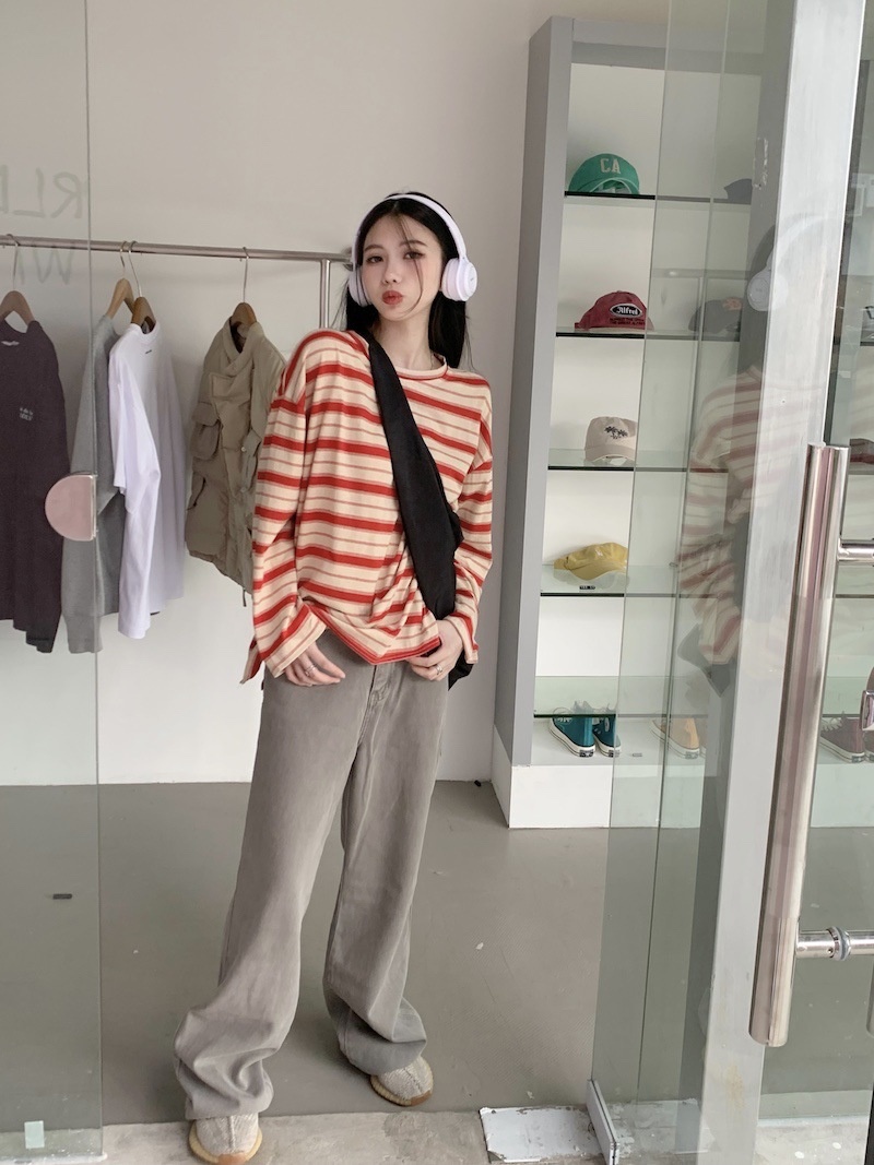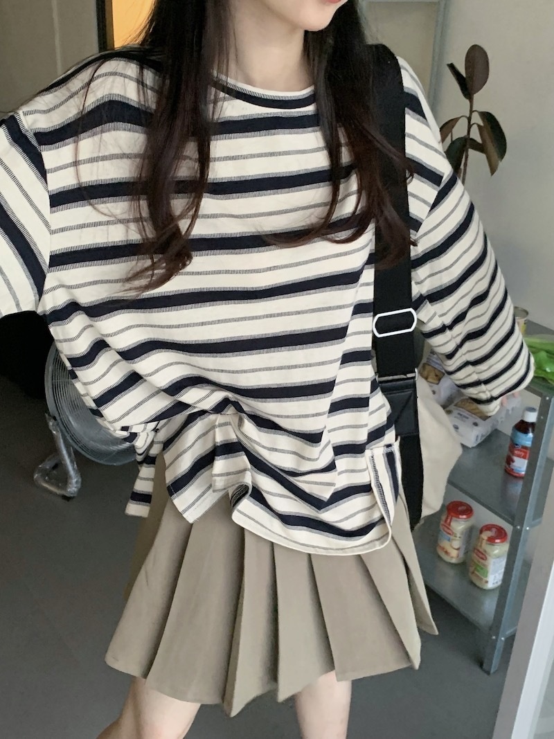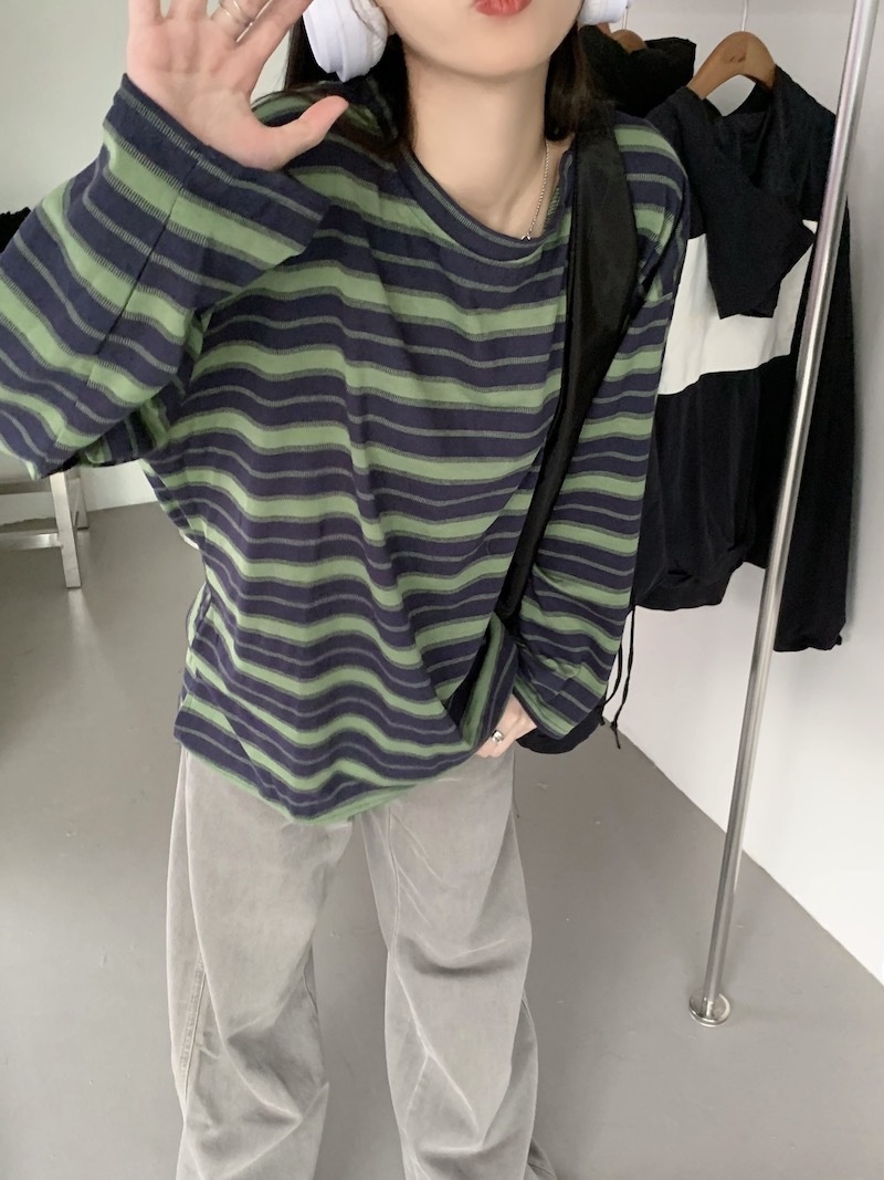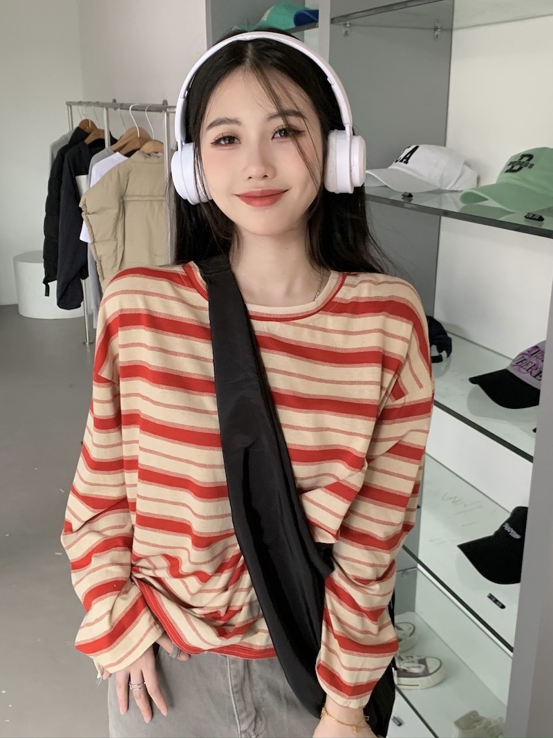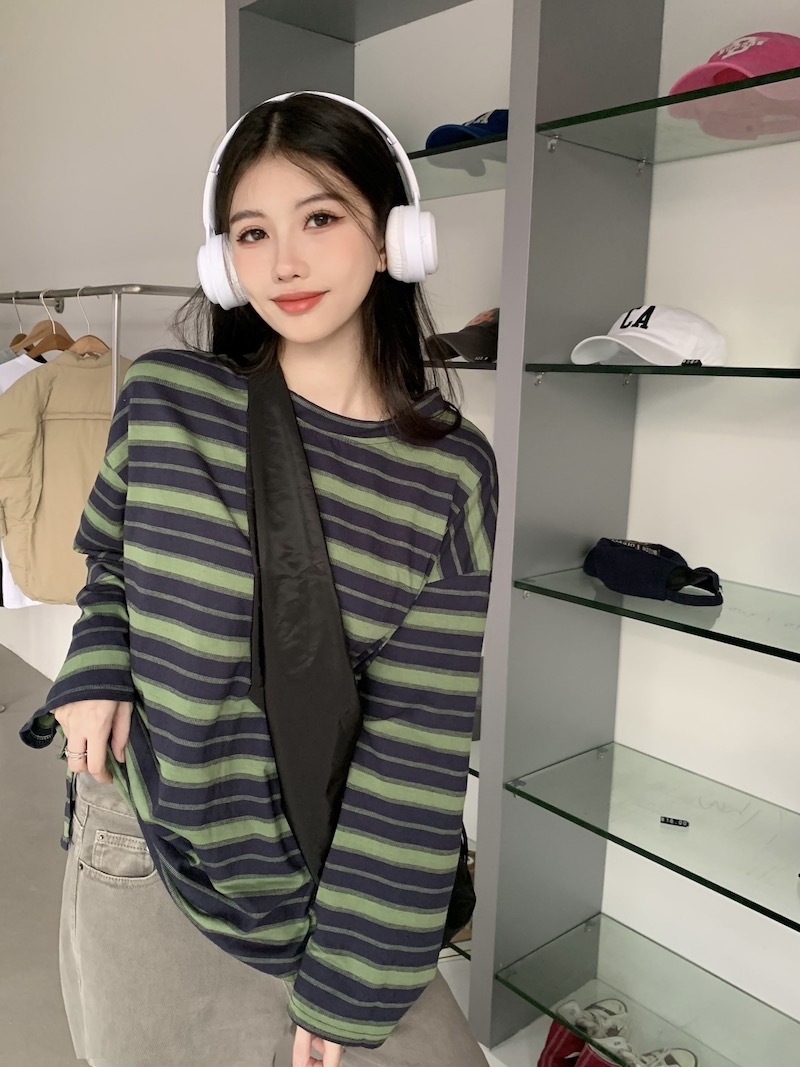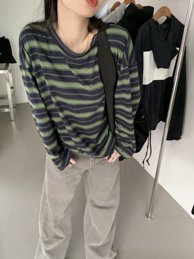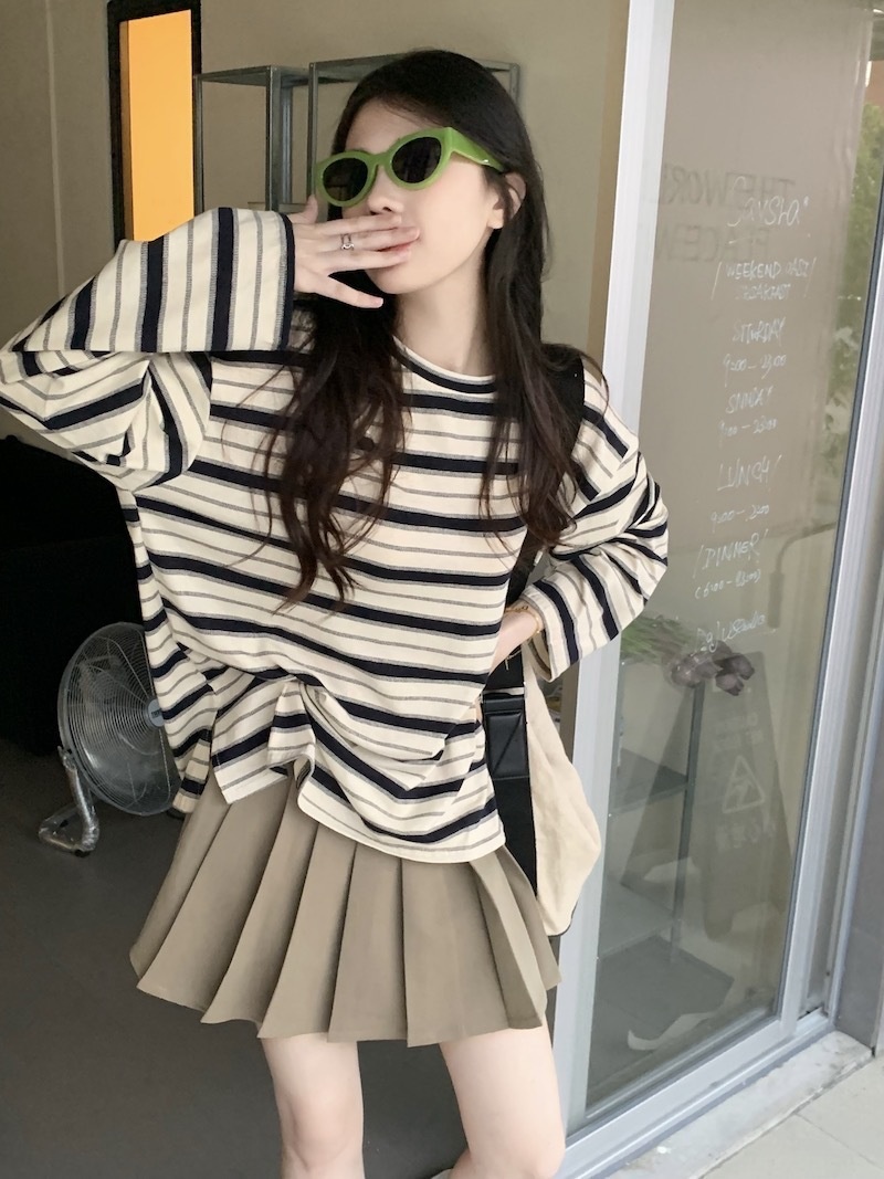 圆领条纹长袖t恤女2025秋季新款设计感宽松显瘦休闲学生开叉上衣