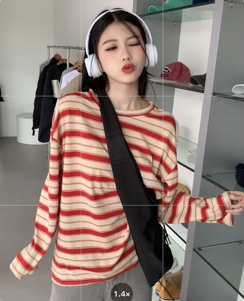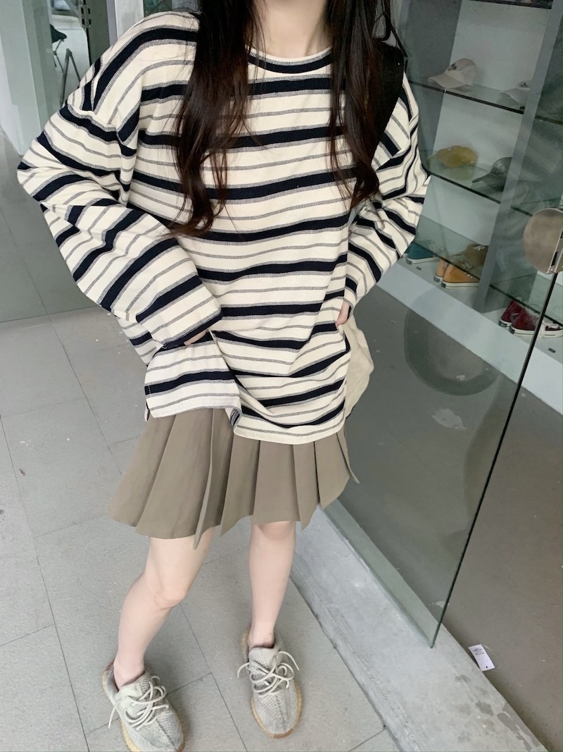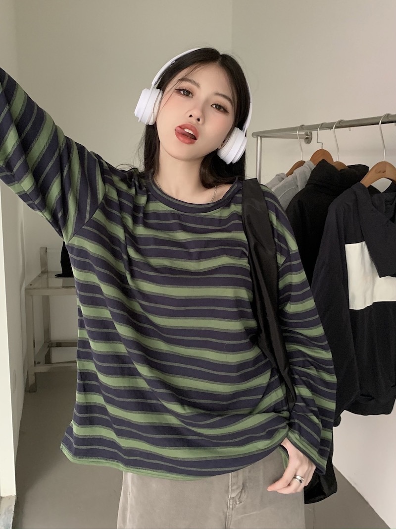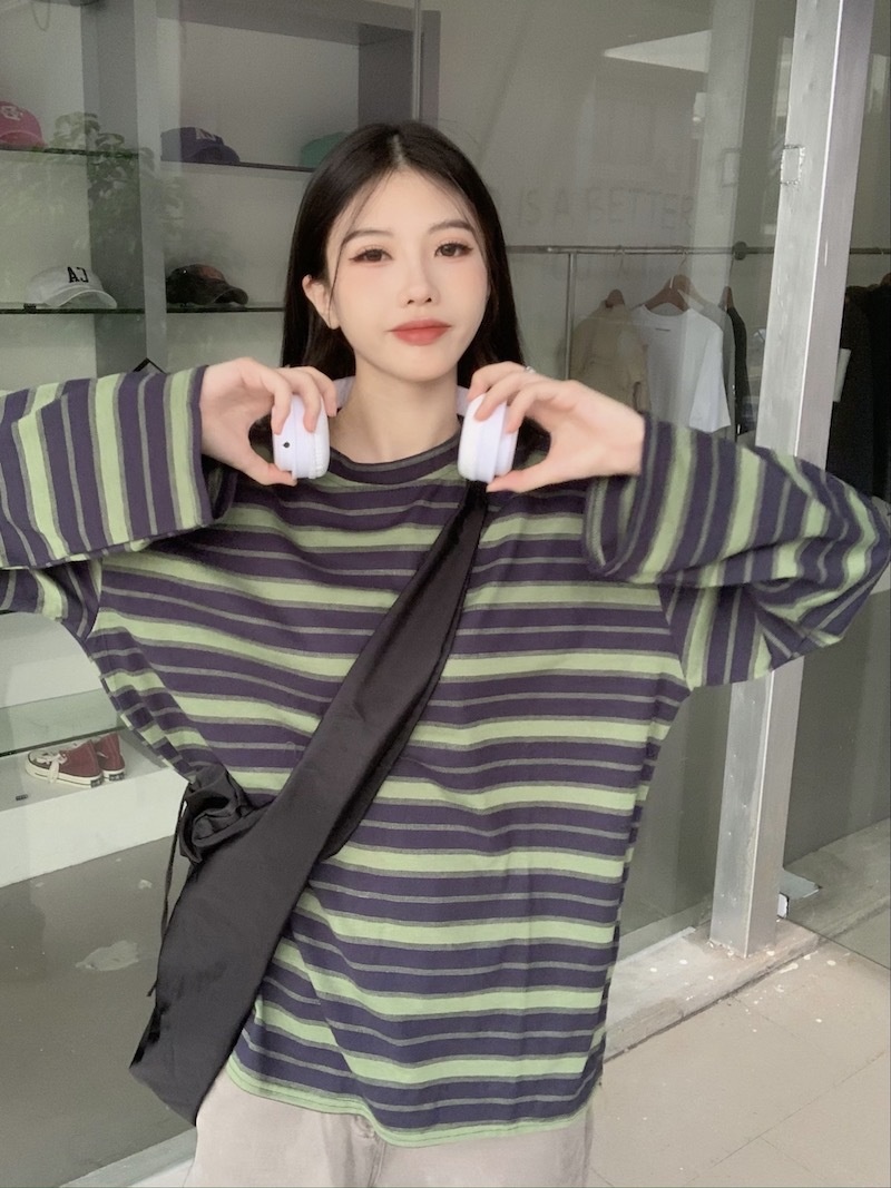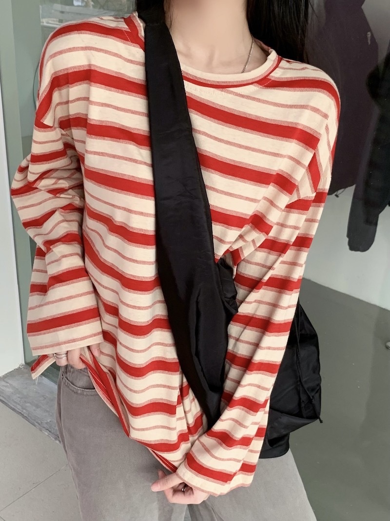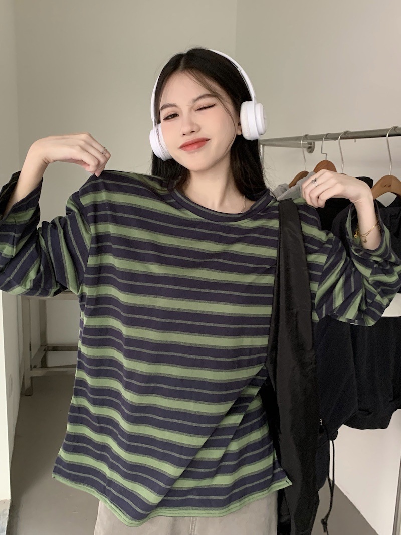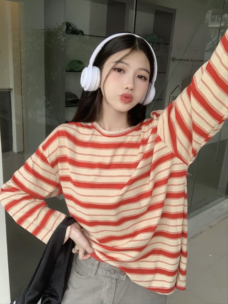圆领条纹长袖t恤女2025秋季新款设计感宽松显瘦休闲学生开叉上衣