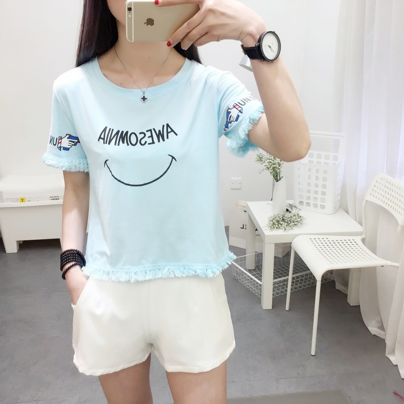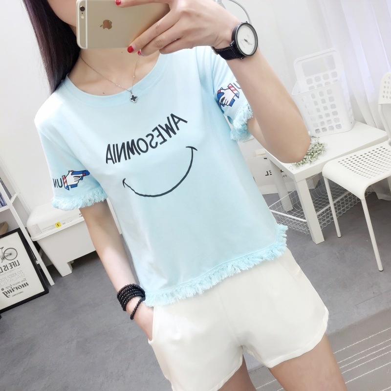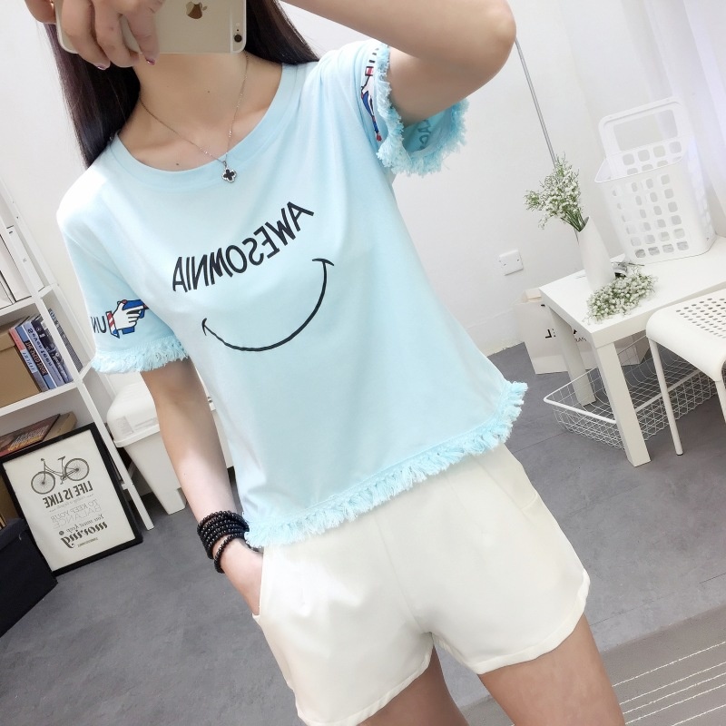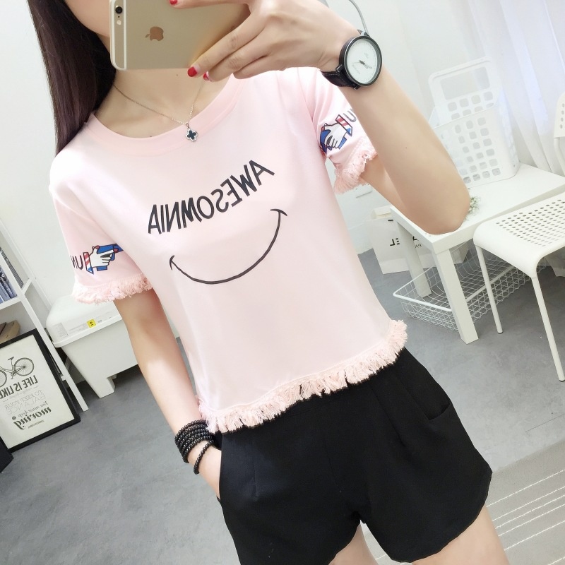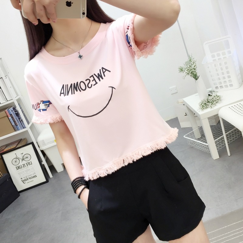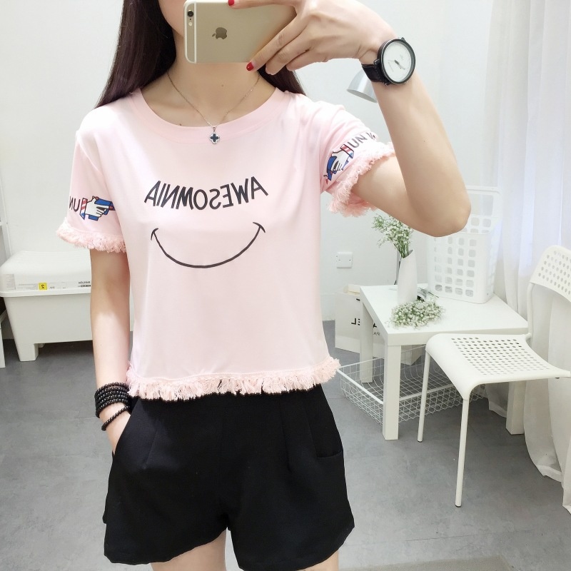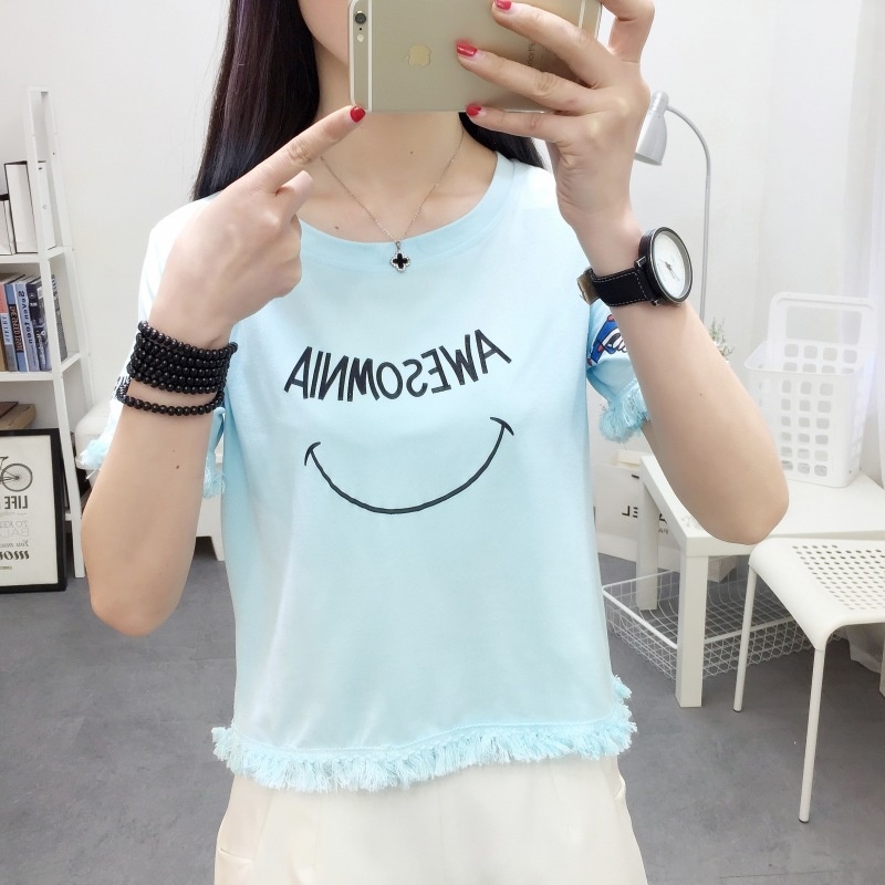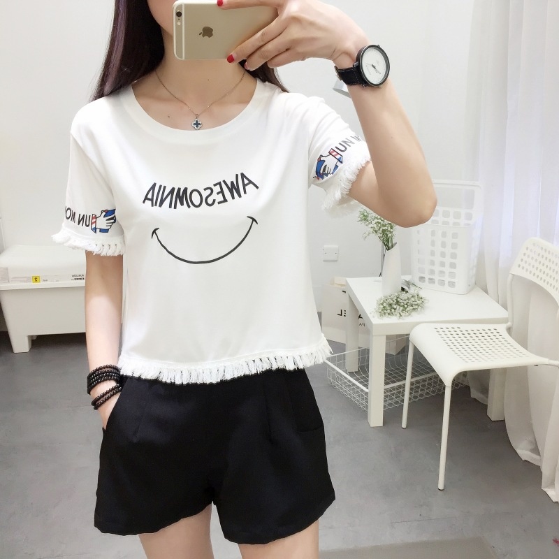 2025夏季新款宽松短款上衣流苏短袖t恤女学生打底衫笑脸一件代发