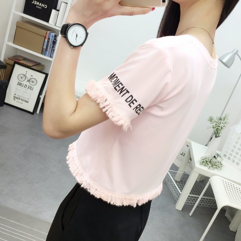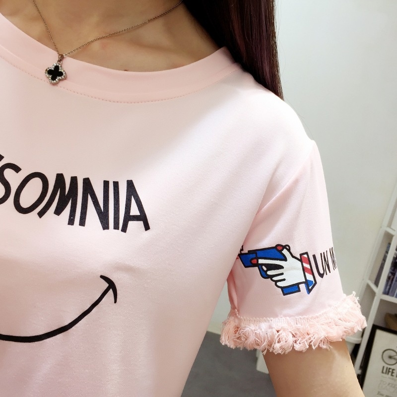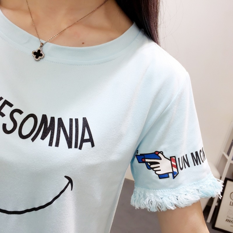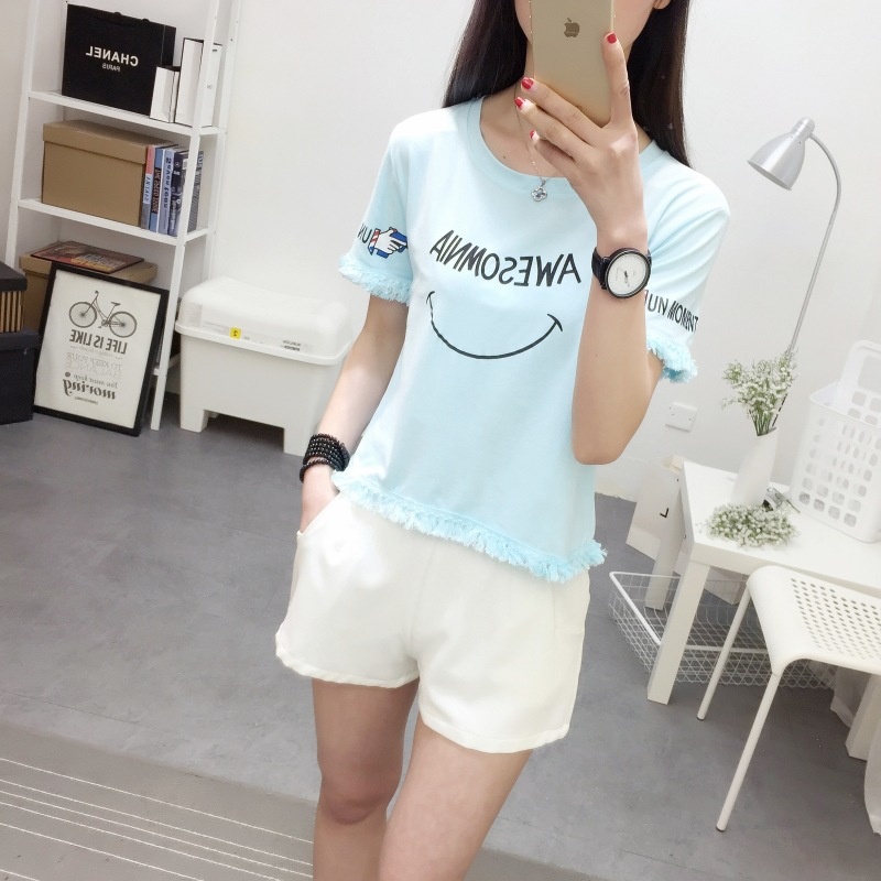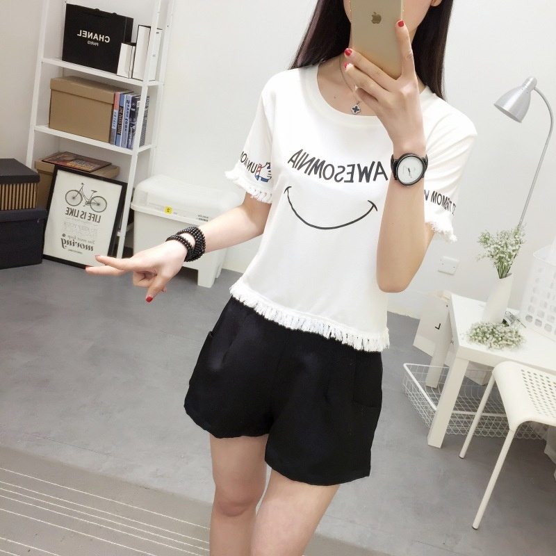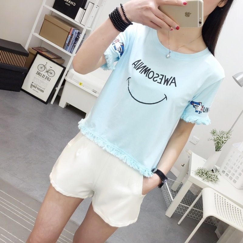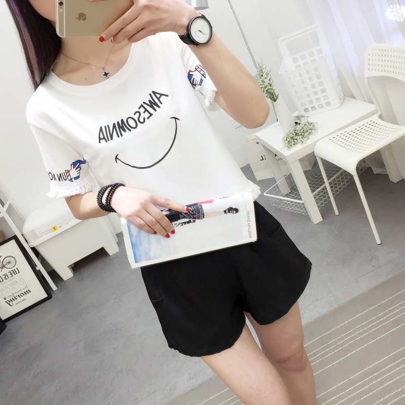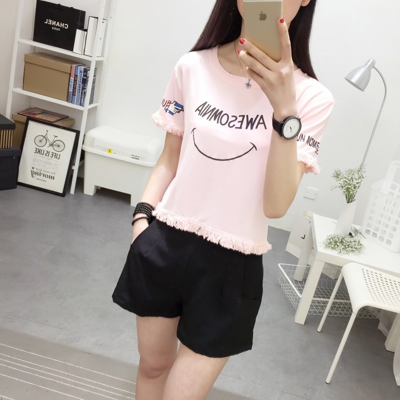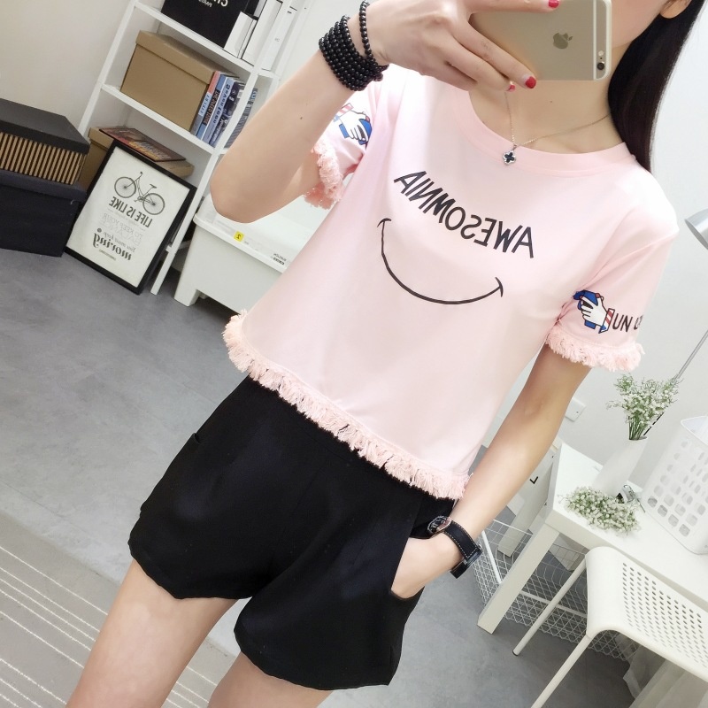 2025夏季新款宽松短款上衣流苏短袖t恤女学生打底衫笑脸一件代发