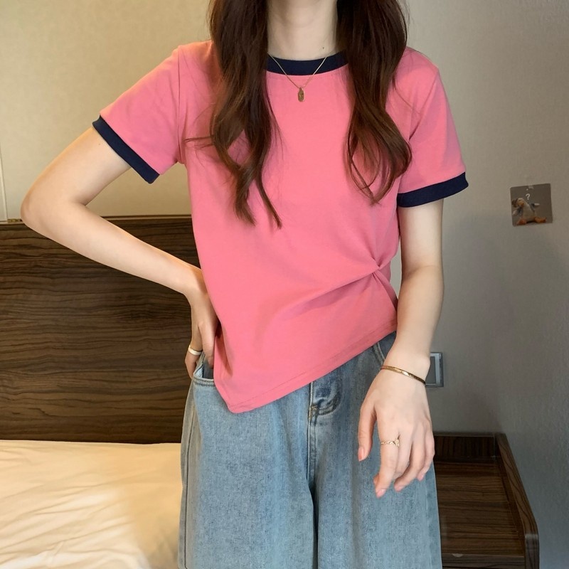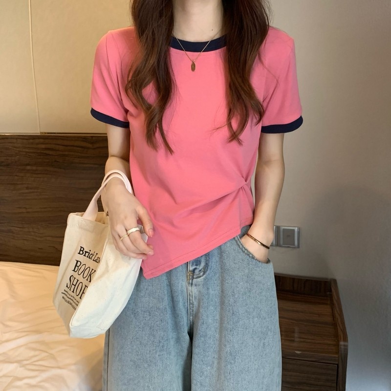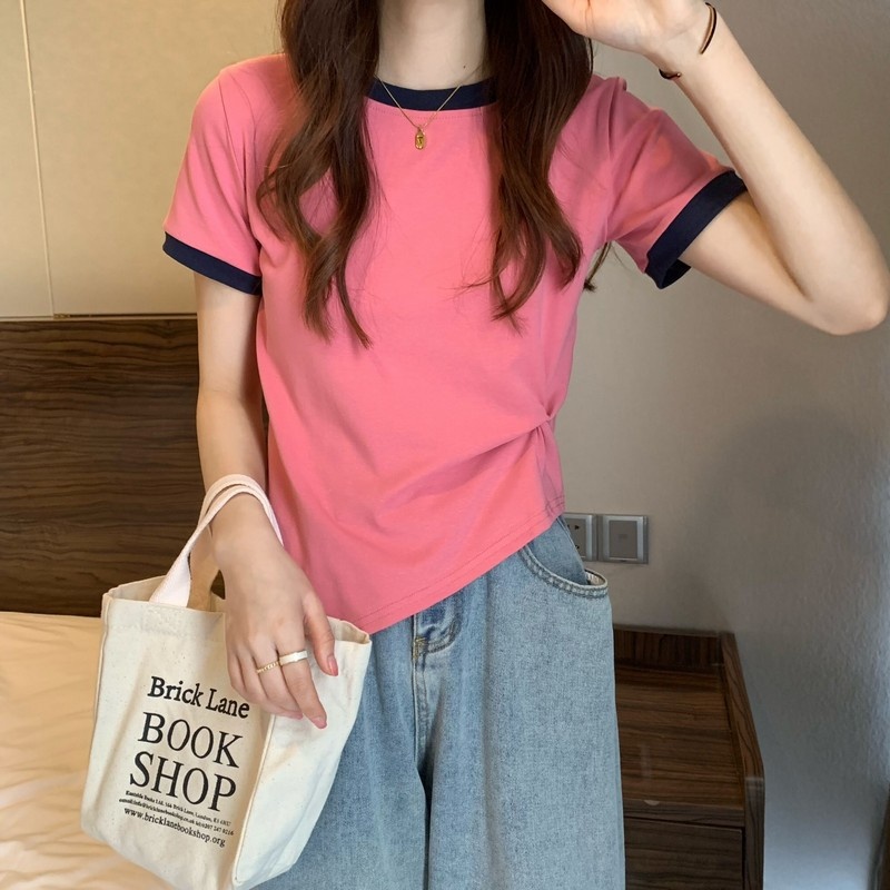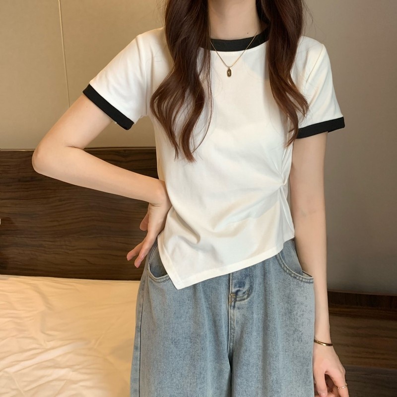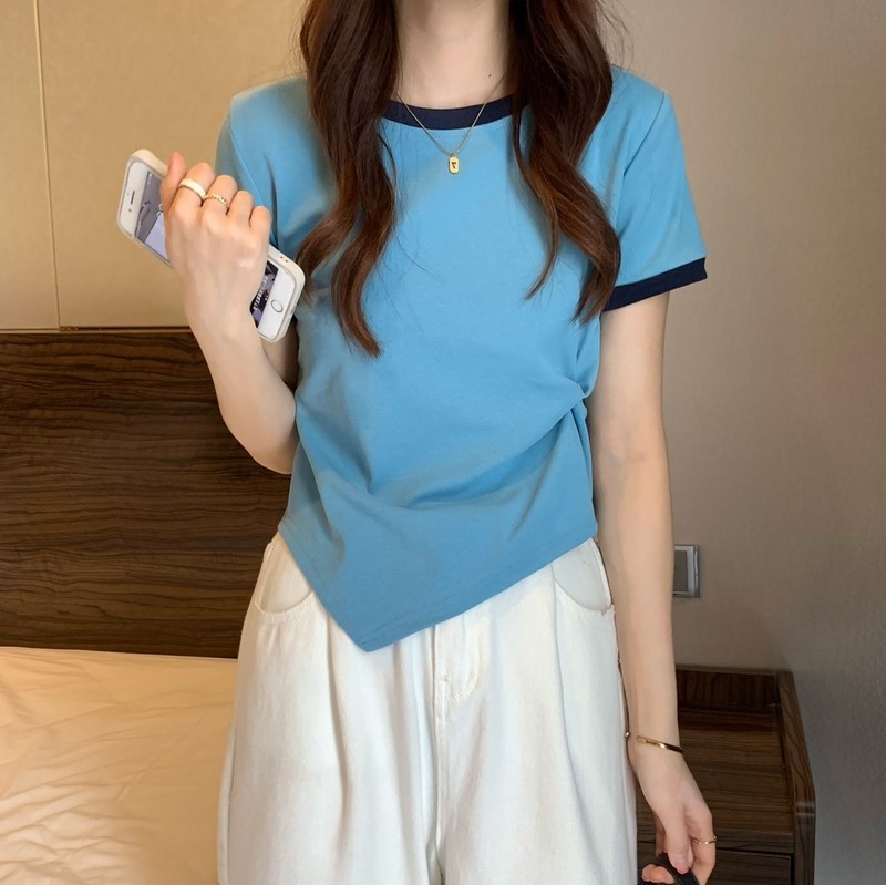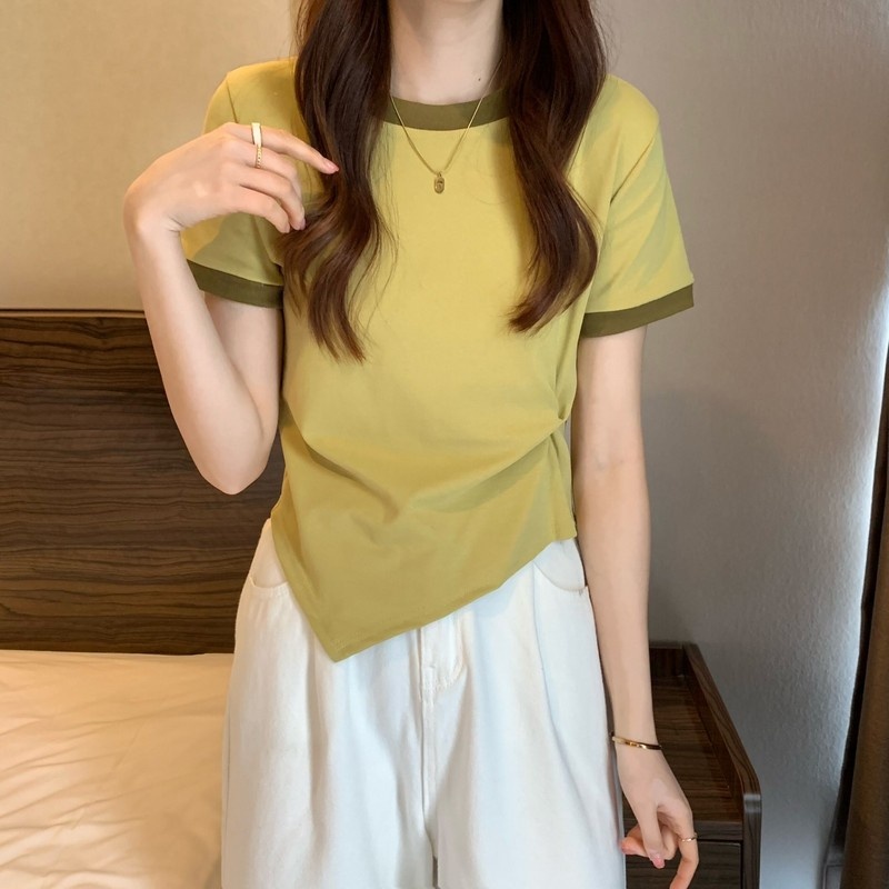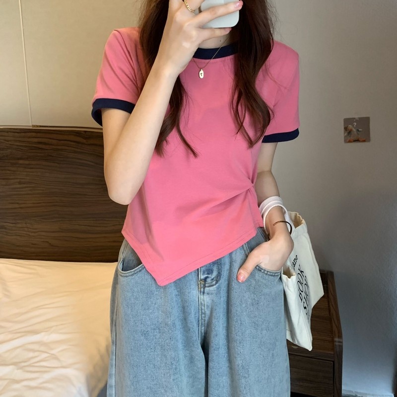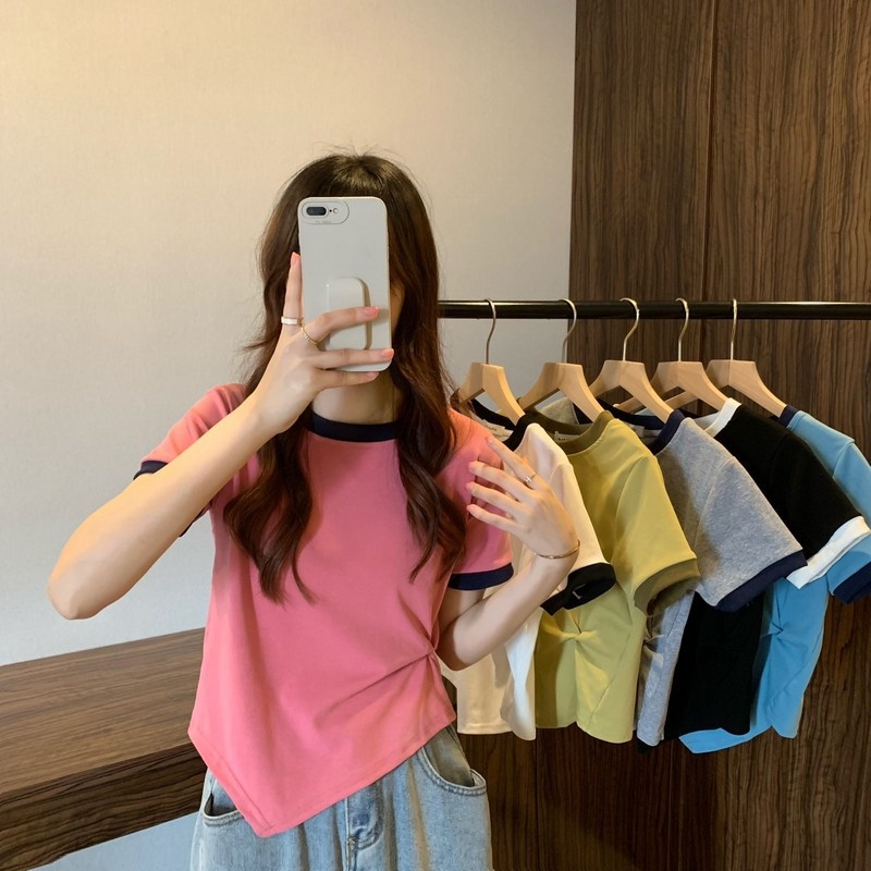 短袖女2025年新款夏季设计感撞色t恤时尚别致不规则短款学生上衣
