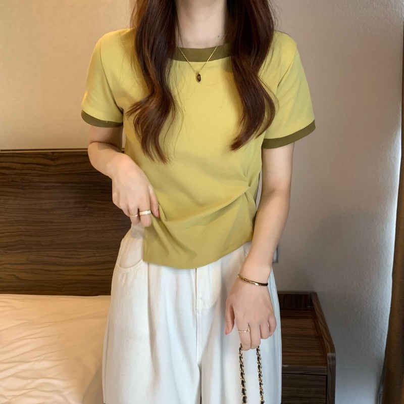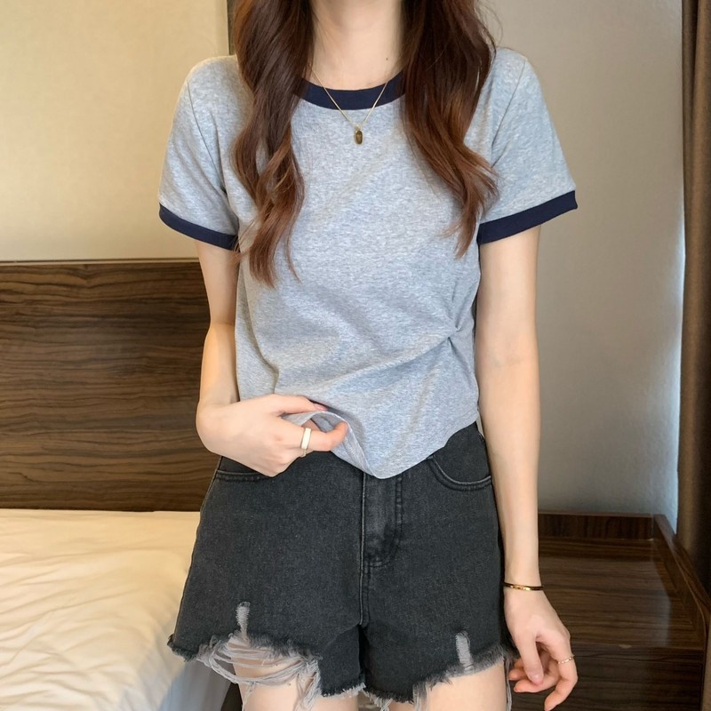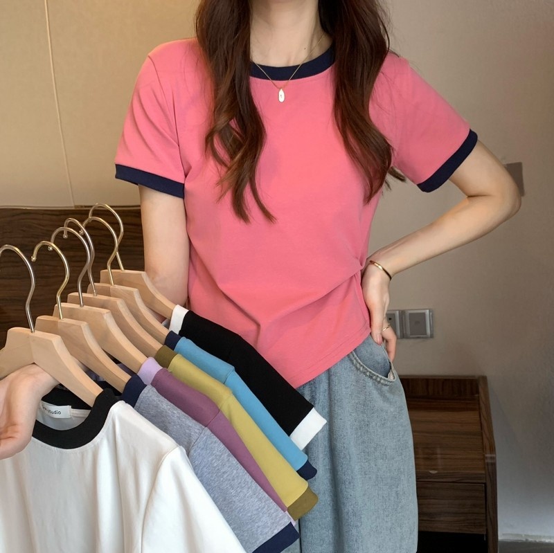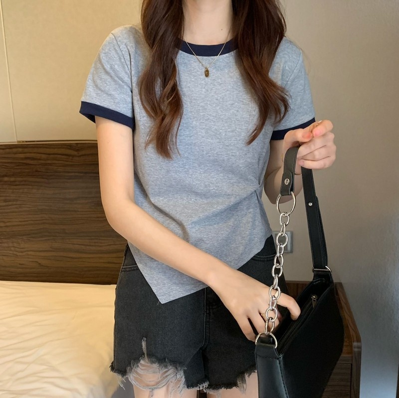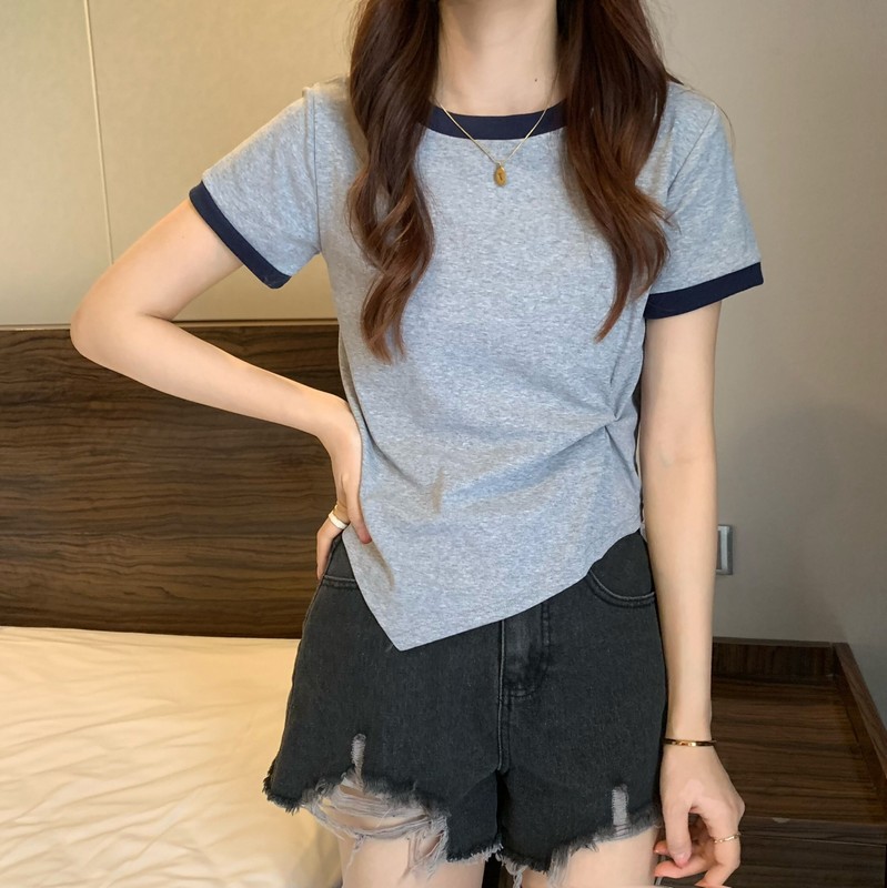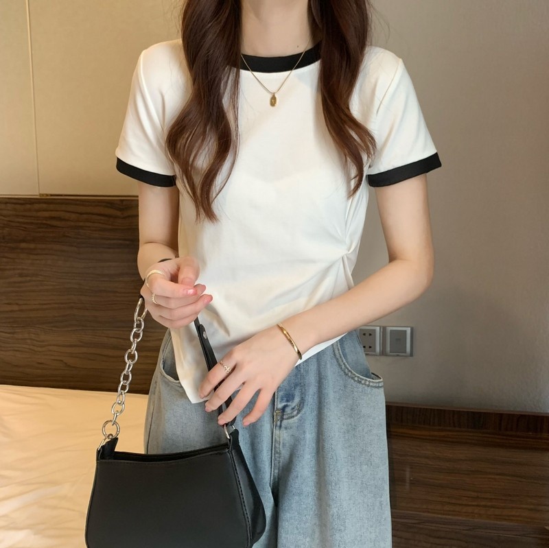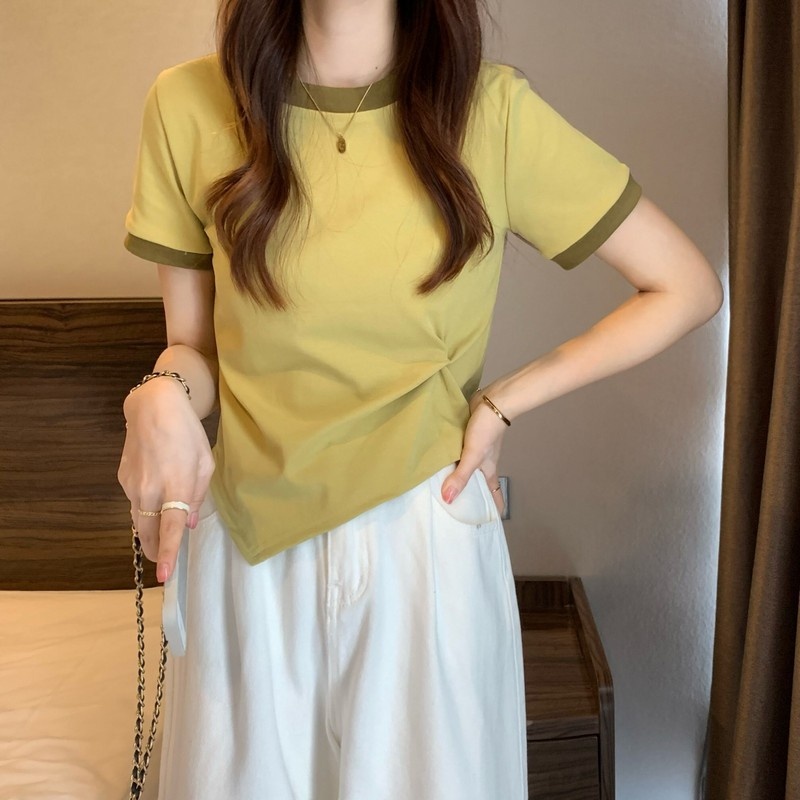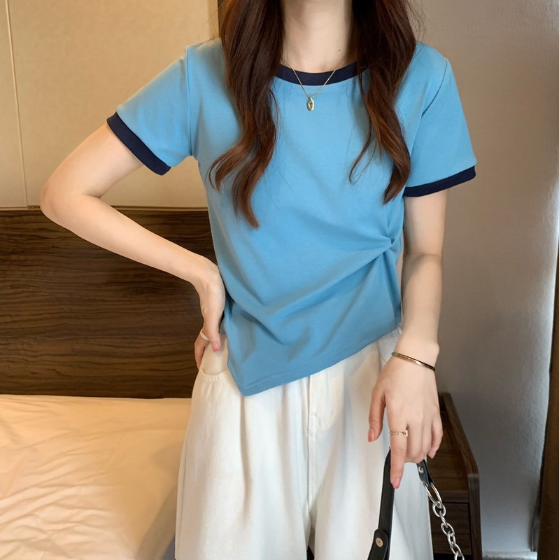 短袖女2025年新款夏季设计感撞色t恤时尚别致不规则短款学生上衣