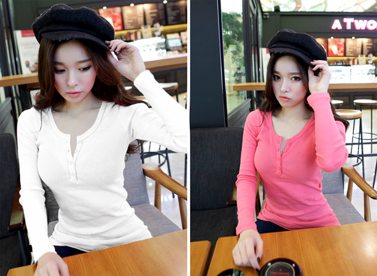 2025秋装纽扣螺纹纯色长袖t恤女修身韩国新款大码上衣打底衫外穿